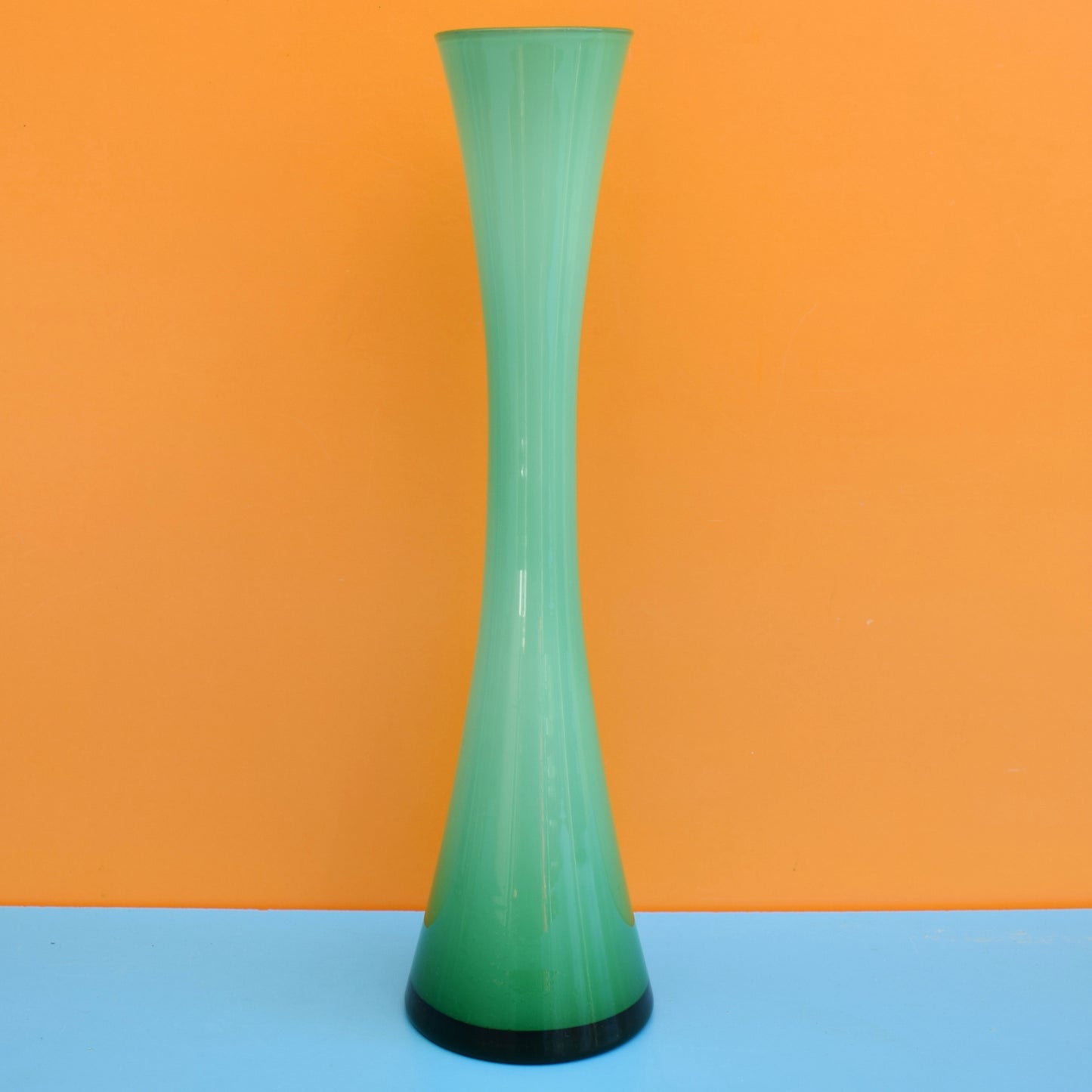 Vintage glass vase with a cased white interior and light turquoise outer.