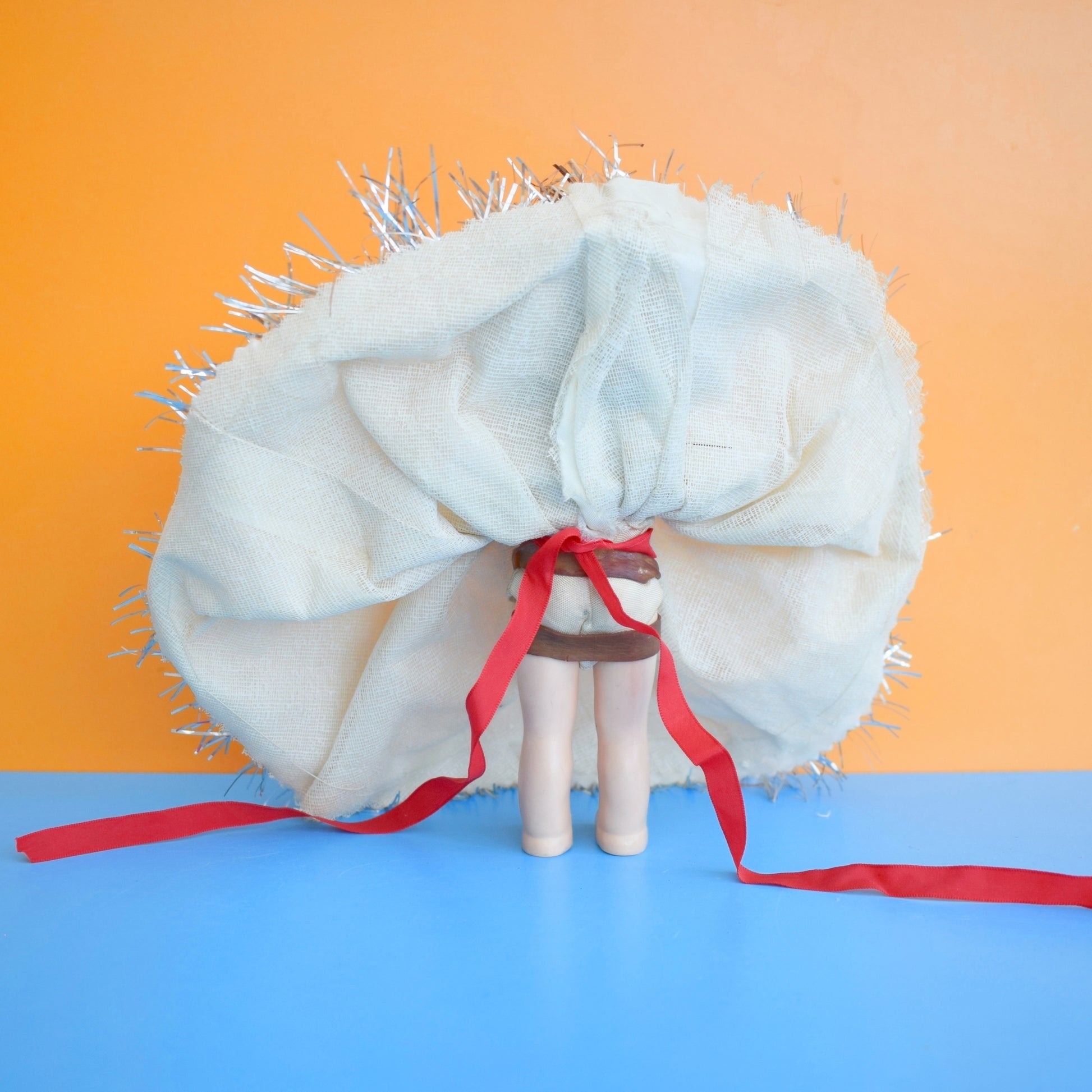 - Design Handmade; vintage 1960s Christmas fairy angel tree topper with a homemade outfit and silver-tinsel trim