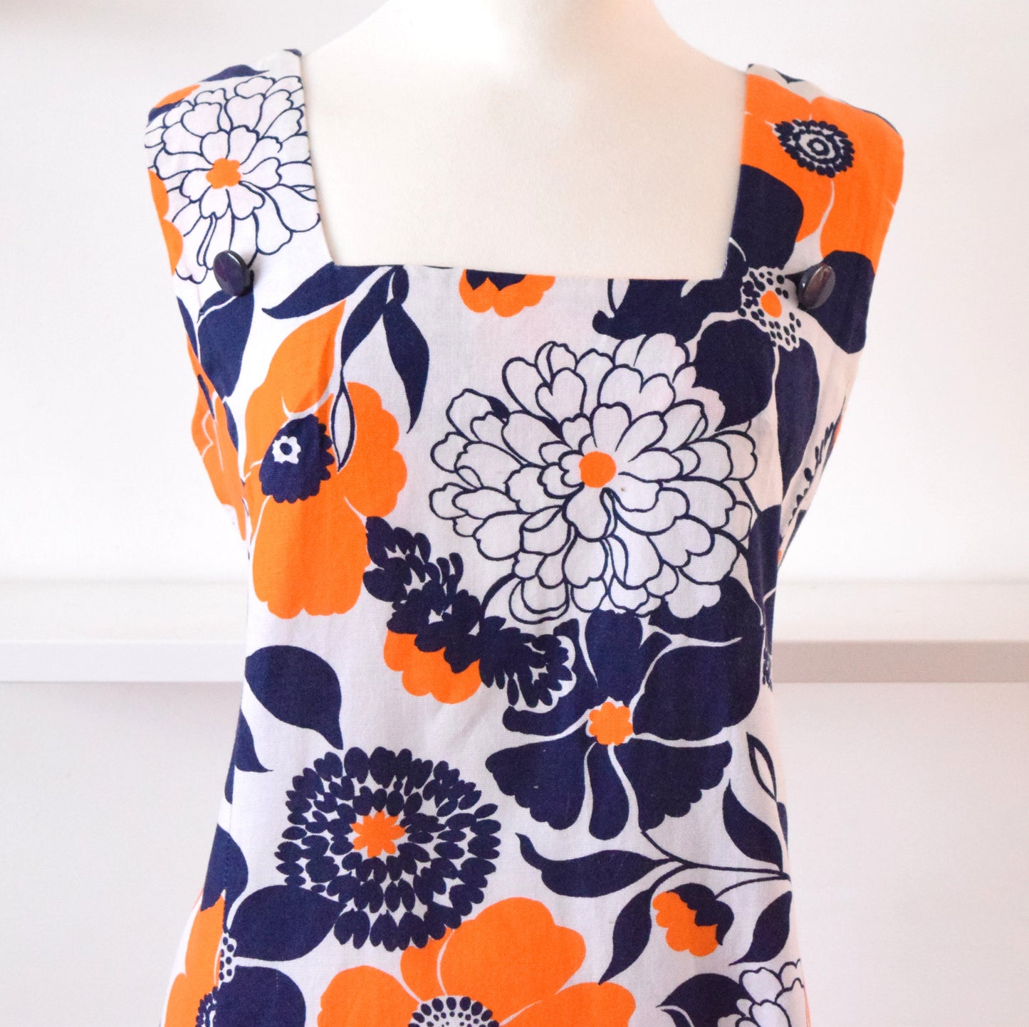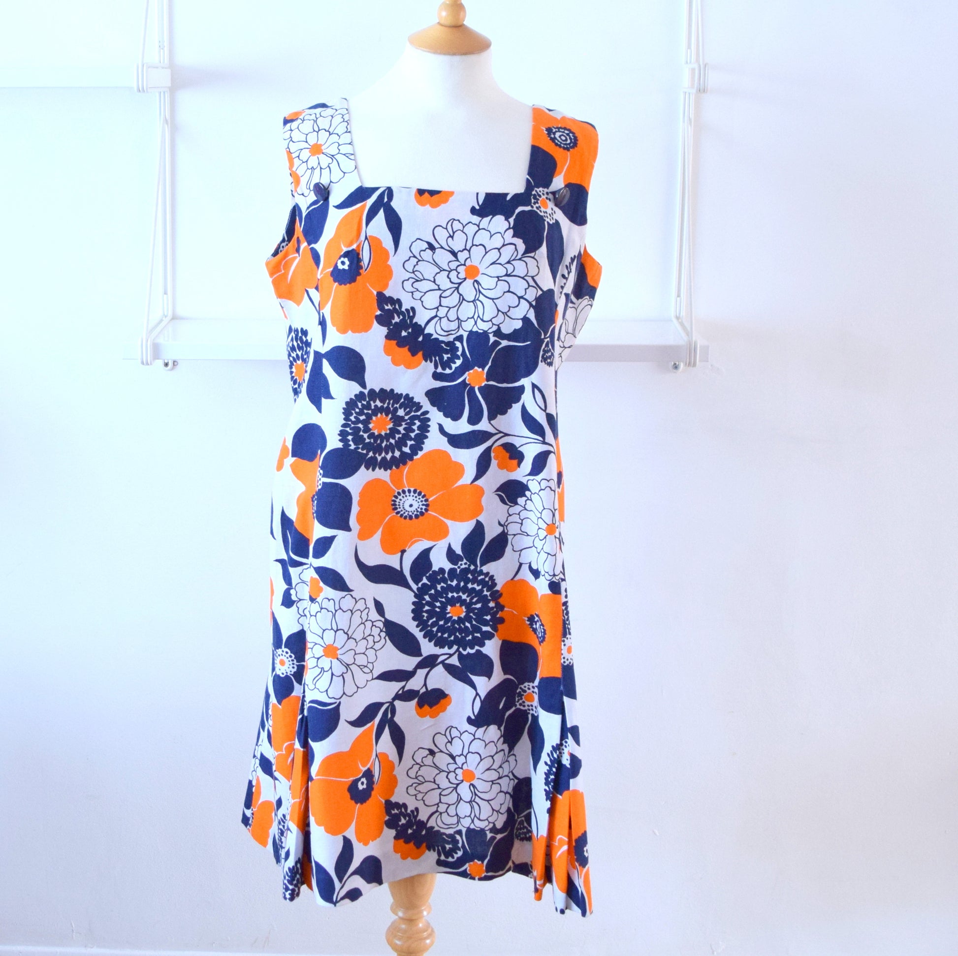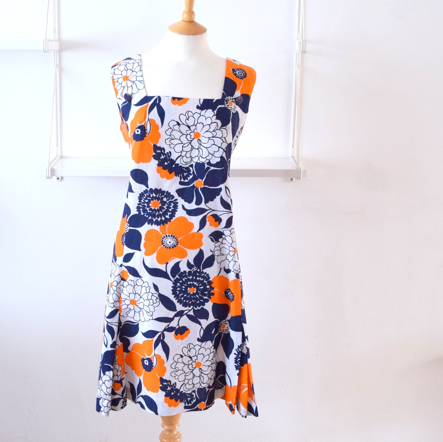 Vintage 1960s Cotton Midi Dress - Blue & Orange - Flower Power sz 16 ish