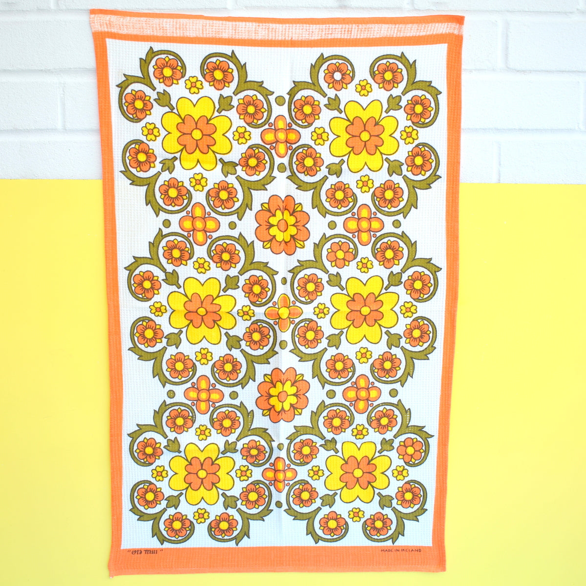Vintage 1960s Cotton Tea Towel - Flower Power Design - Orange & Dark Green