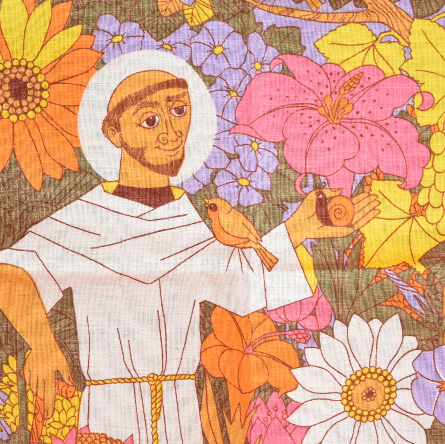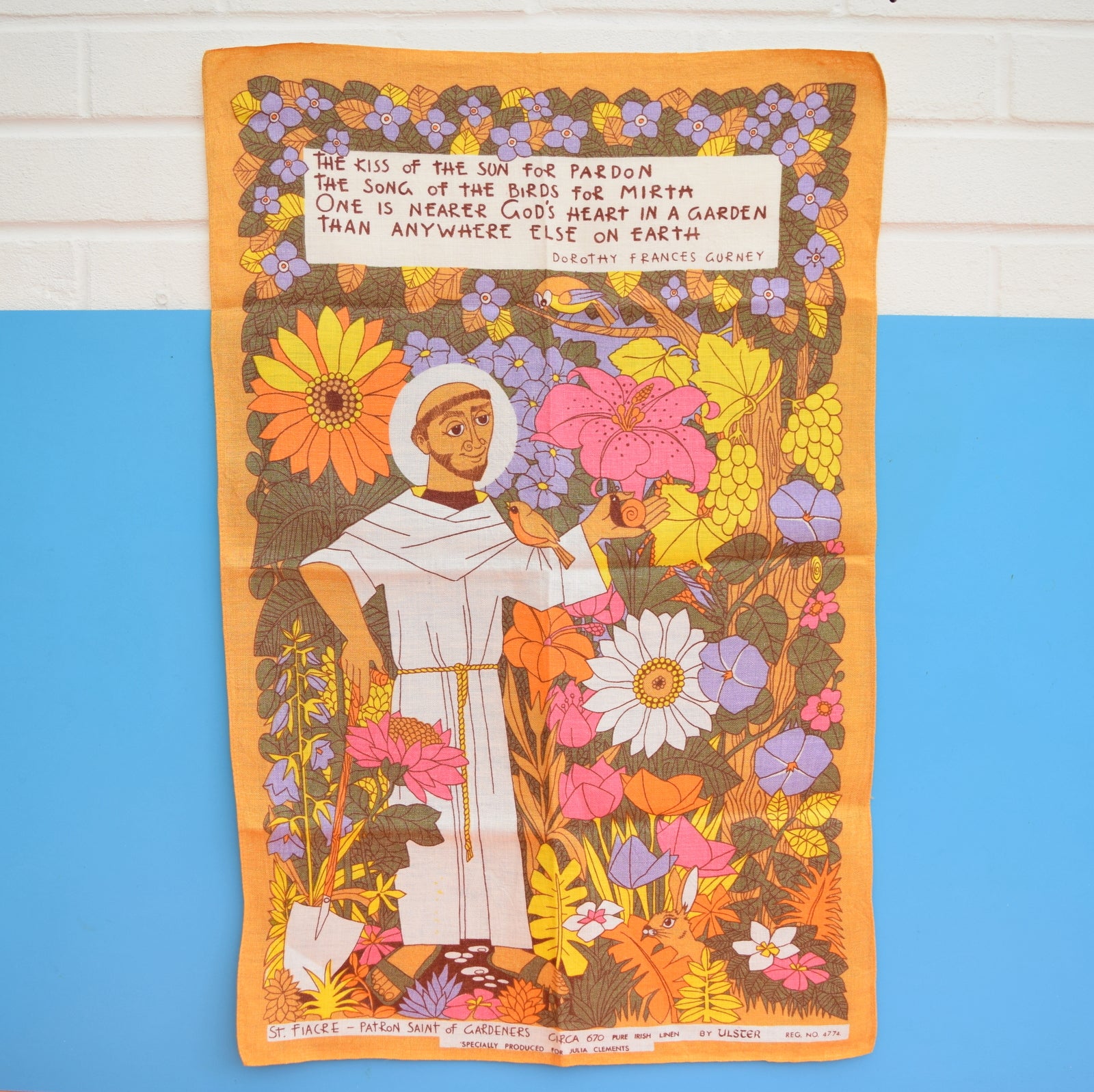 Vintage 1960s Cotton Tea Towel - Saint of Gardeners - Flower Power