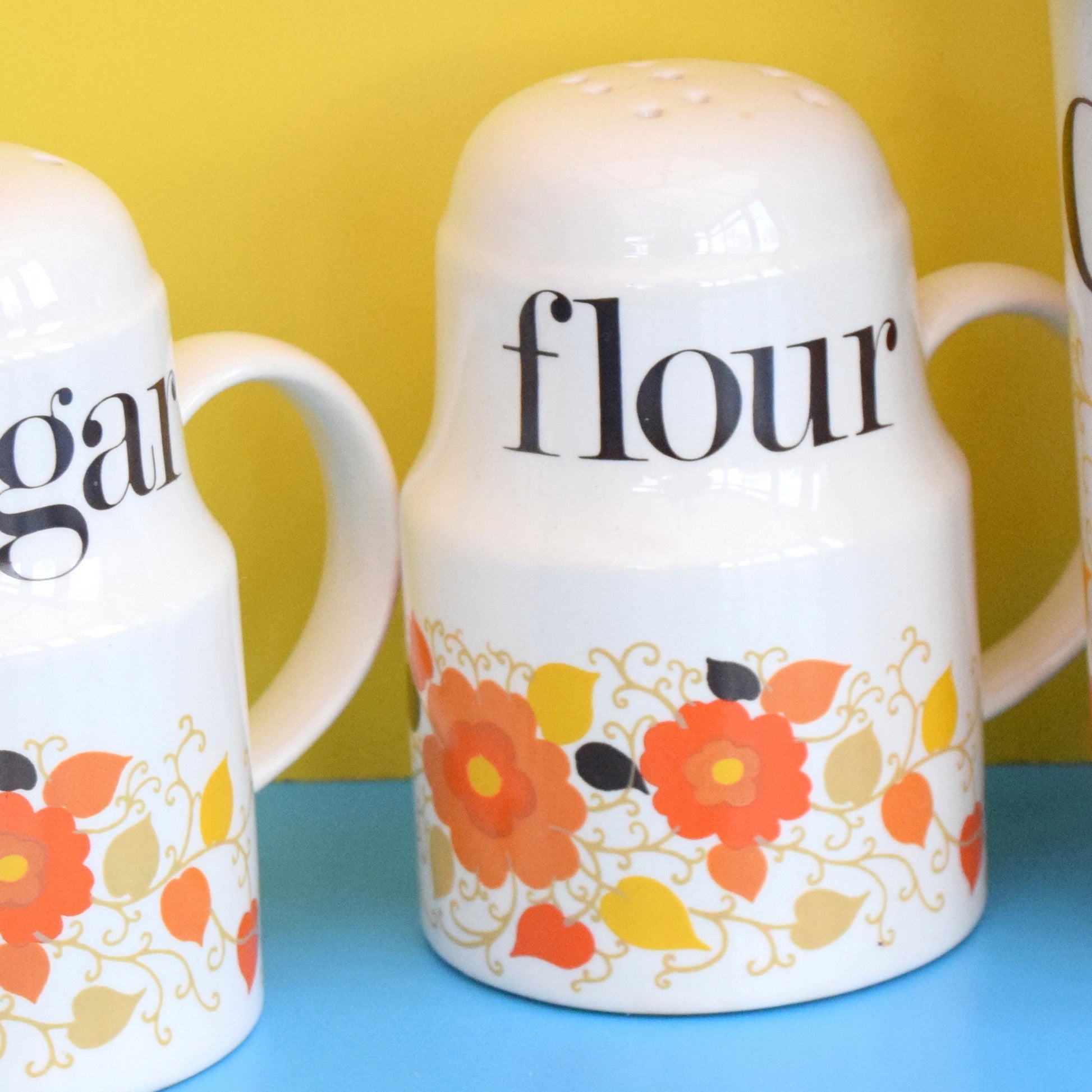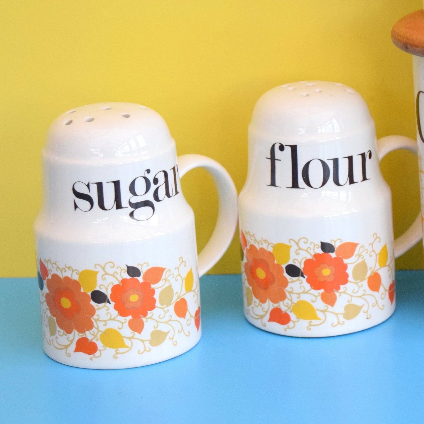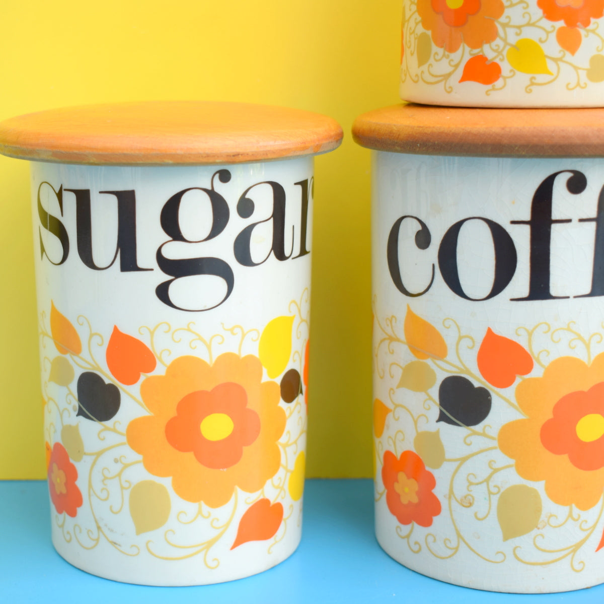 Vintage 1960s Crown Devon Ceramic Jars - Flower Power - Coffee / Sugar - Wooden Lids