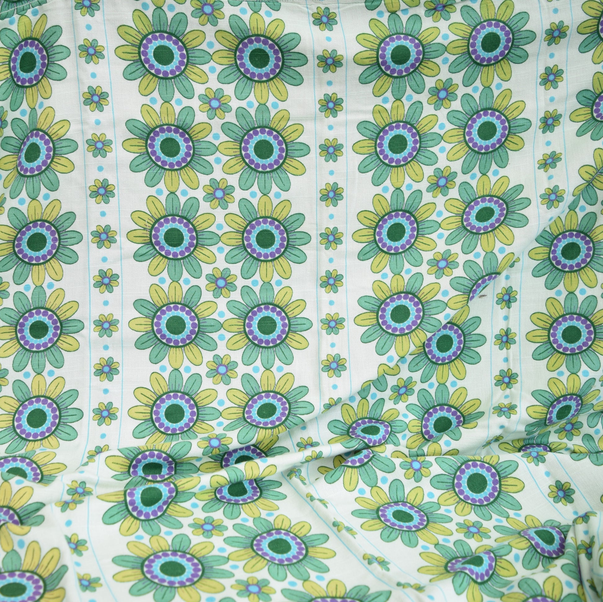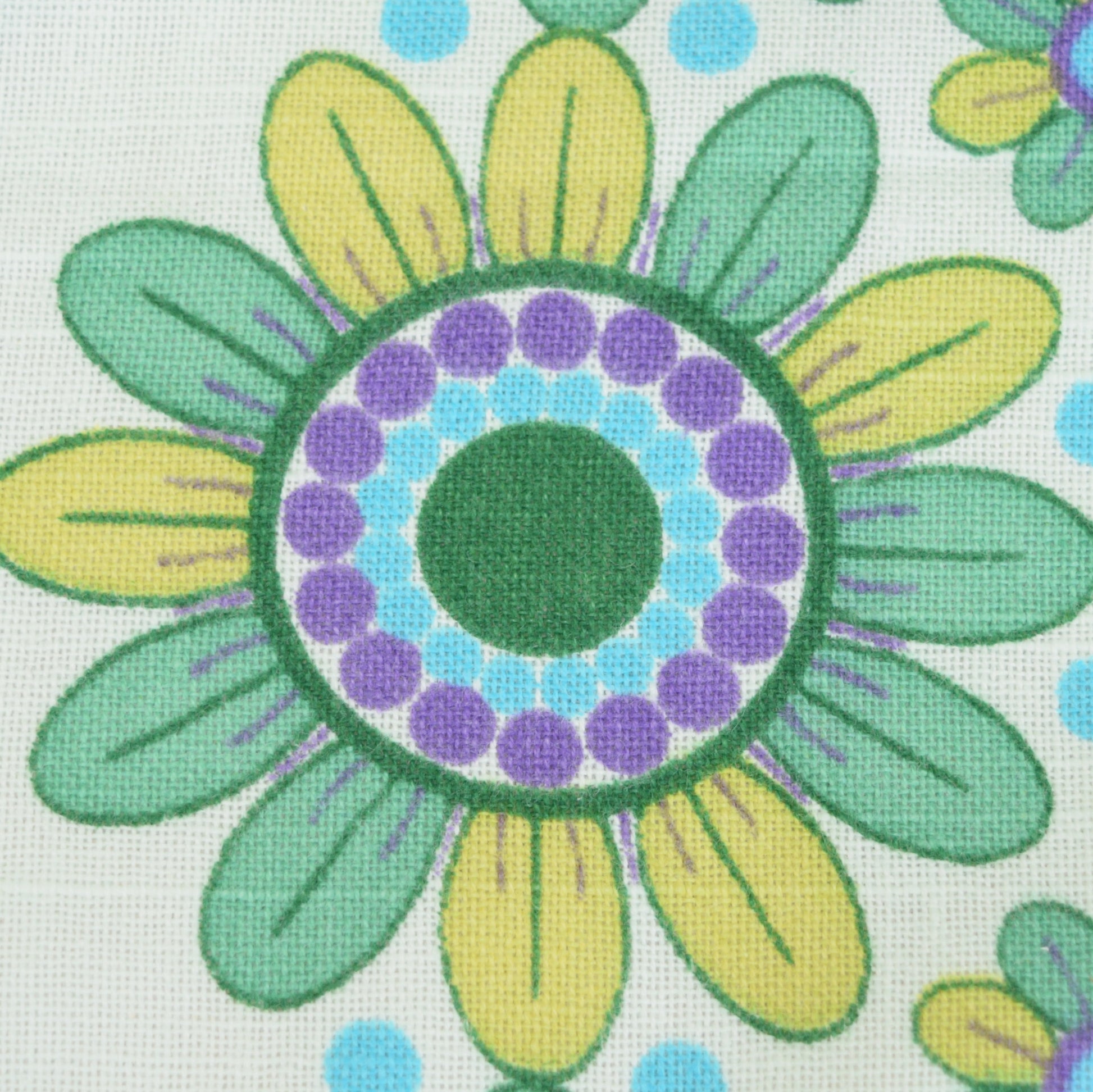 Cotton mix fabric, with simple daisies in green, blue and purple