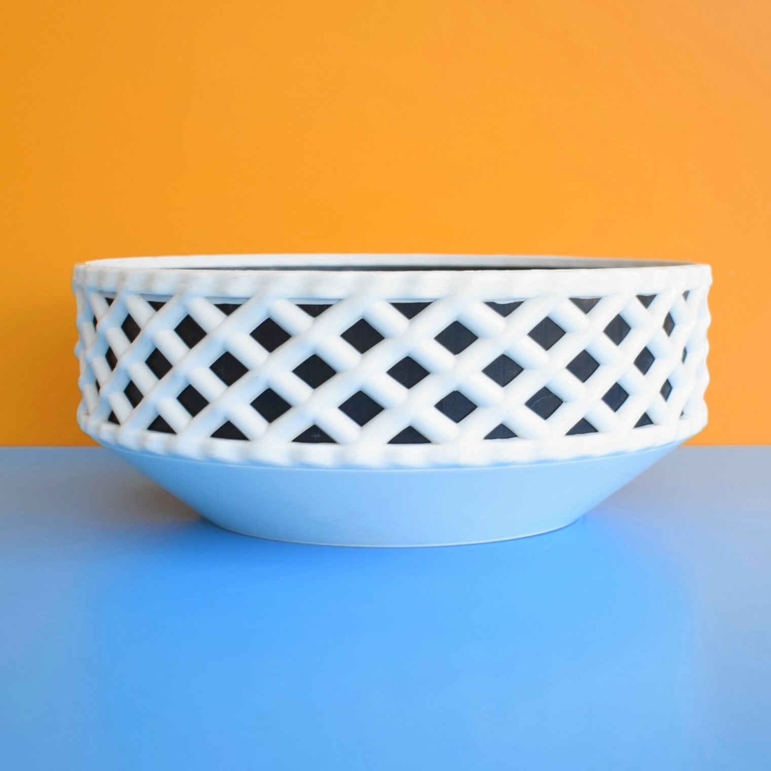 Well preserved for its age, this compact planter measures 22 cm across and stands 9 cm high — perfect for succulents, cacti or small indoor foliage. The original black liner nests neatly inside the crisp white exterior to help with moisture control while delivering a striking black-and-white contrast that complements mid-century and contemporary interiors alike.