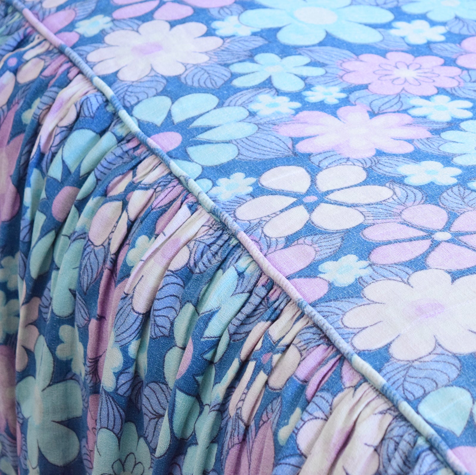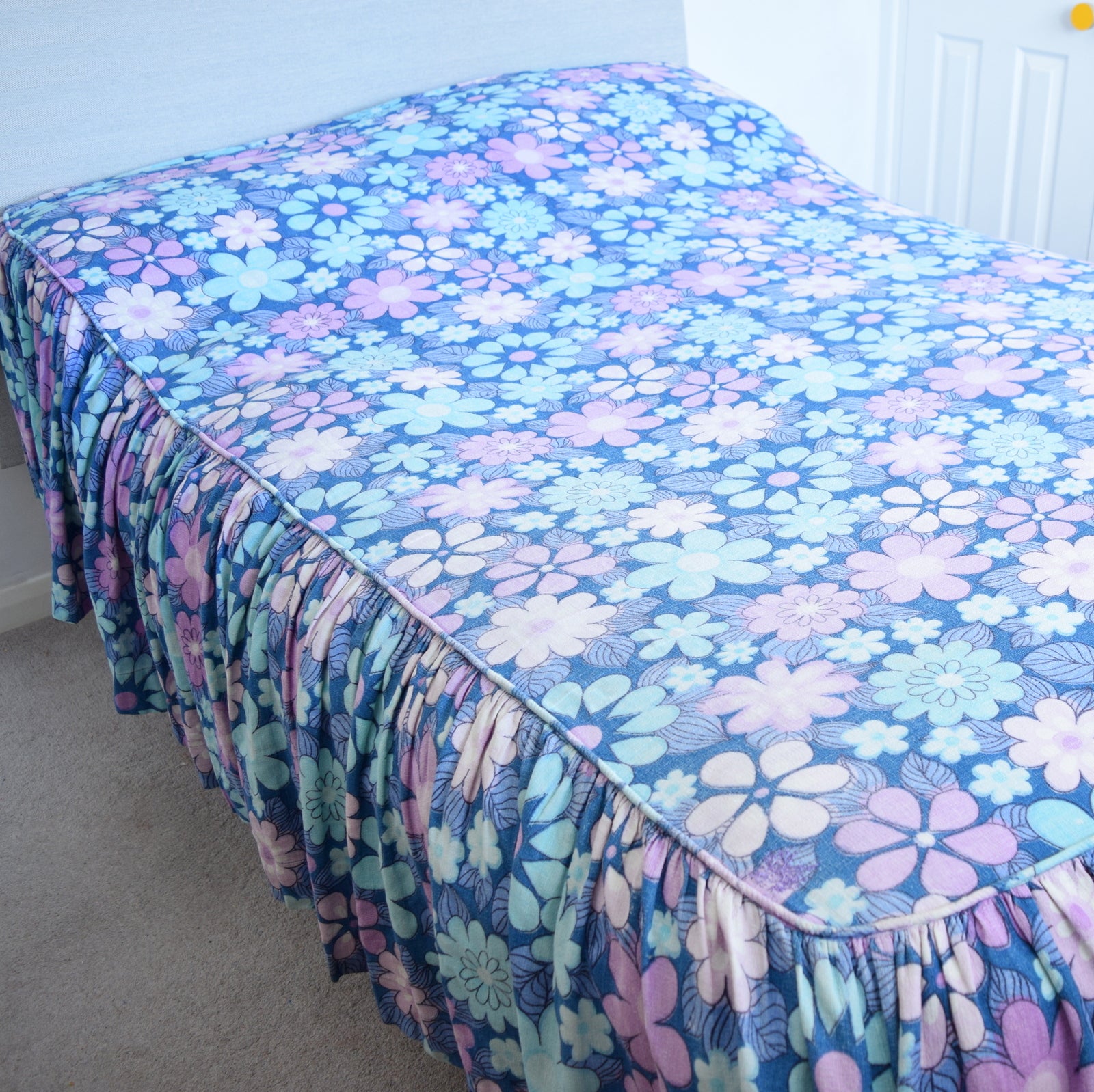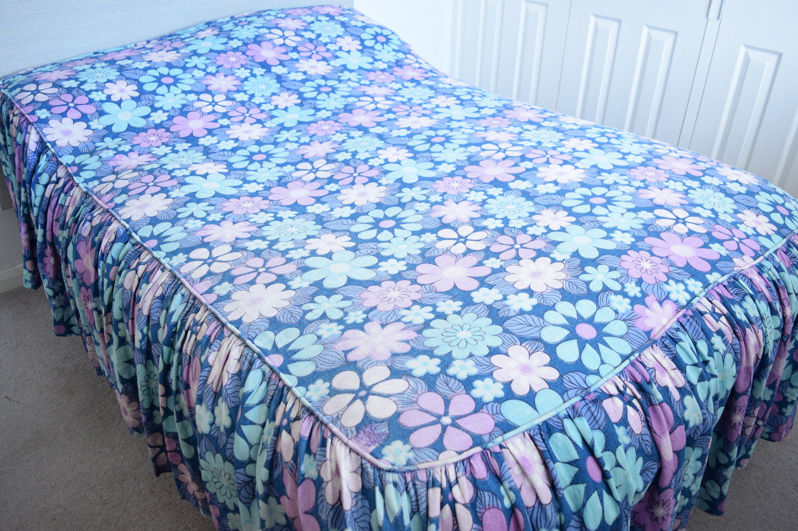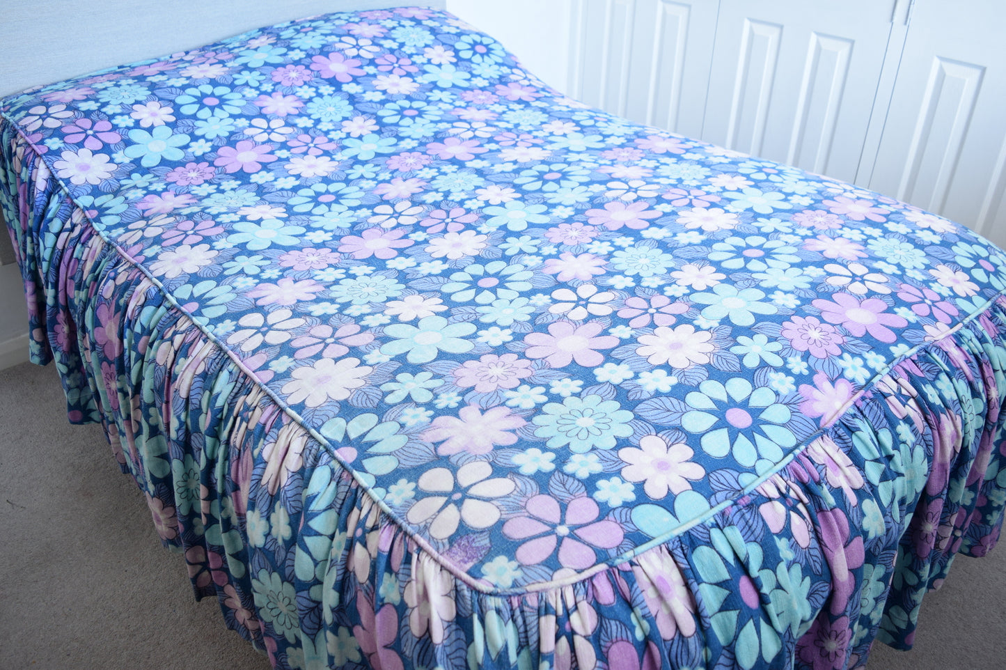 Vintage 1960s Double Bed Cover - Flower Power Barkcloth - Purple & Blue