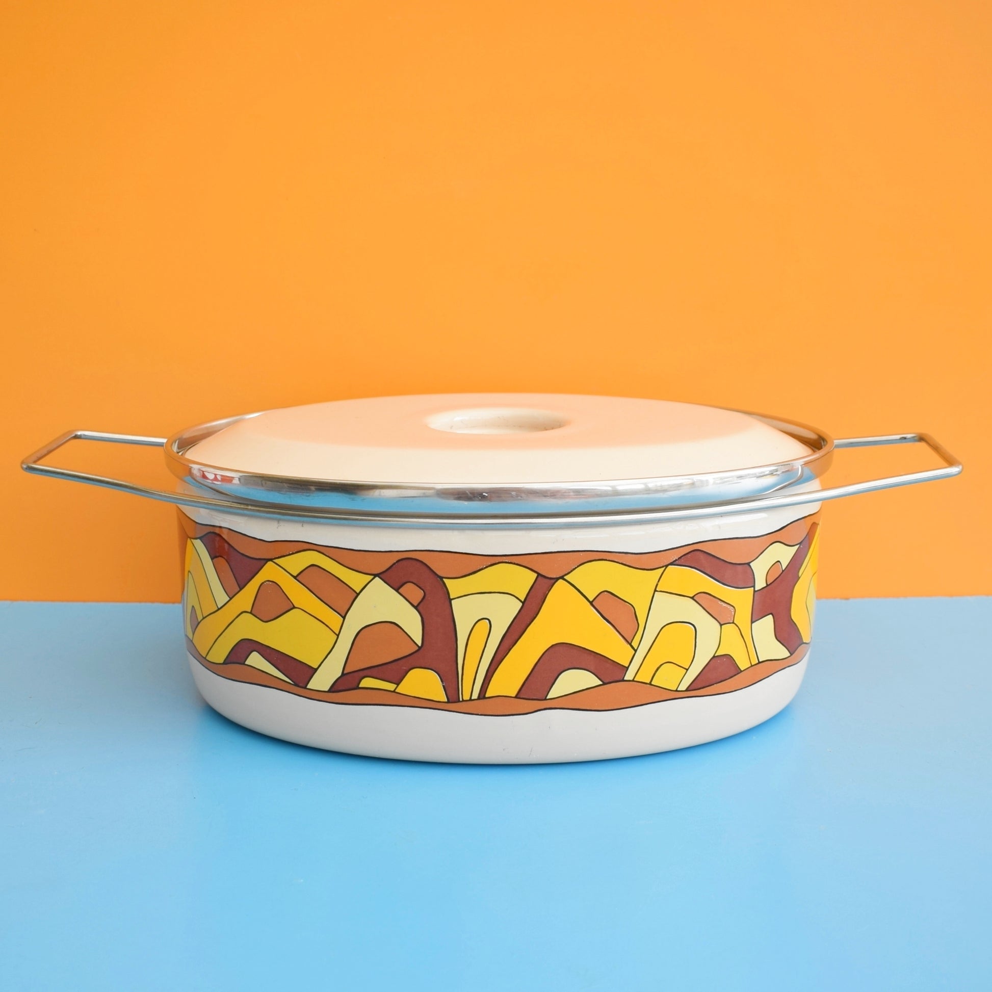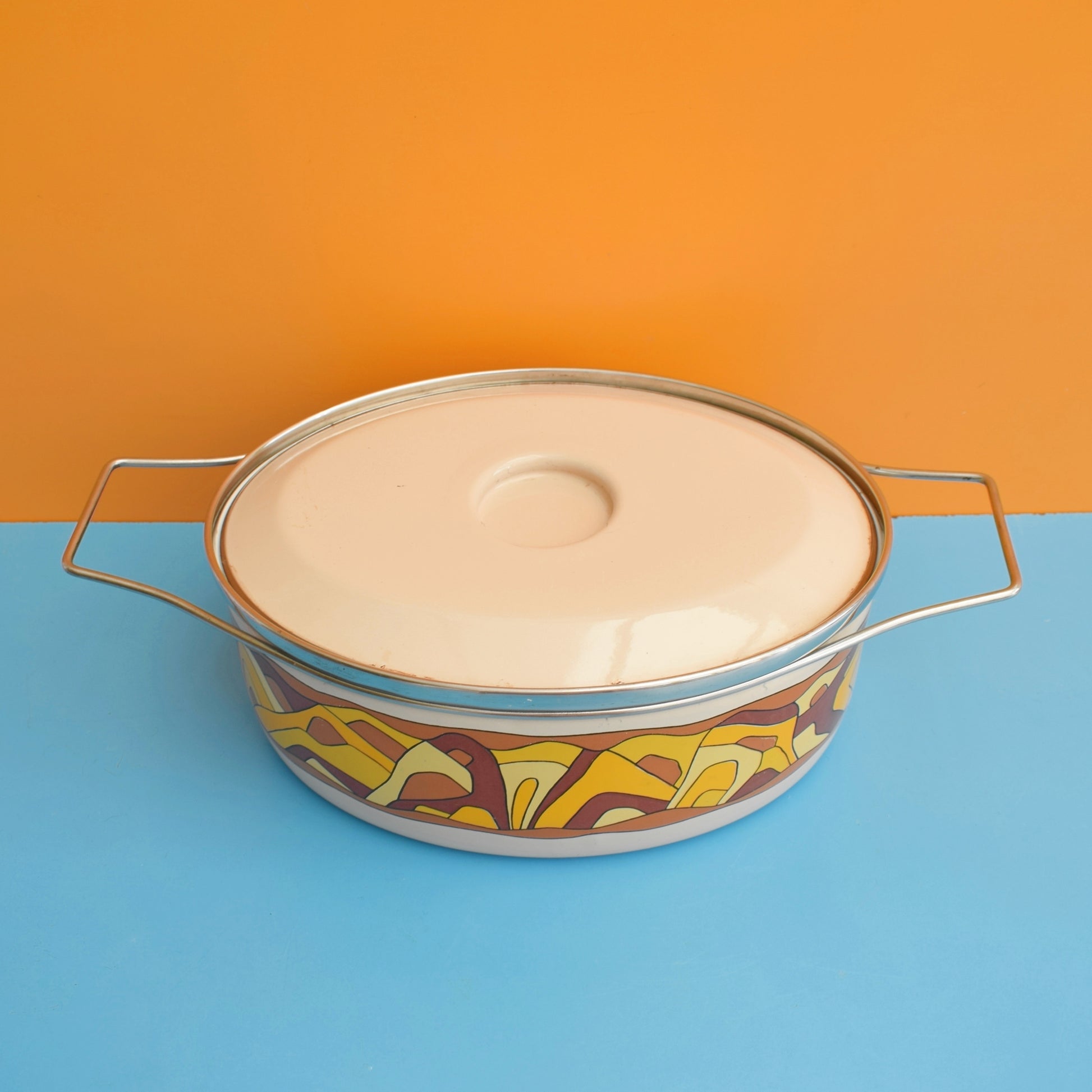 Vintage 1960s Enamel Casserole - Siltal Italy - Yellow & Brown Design