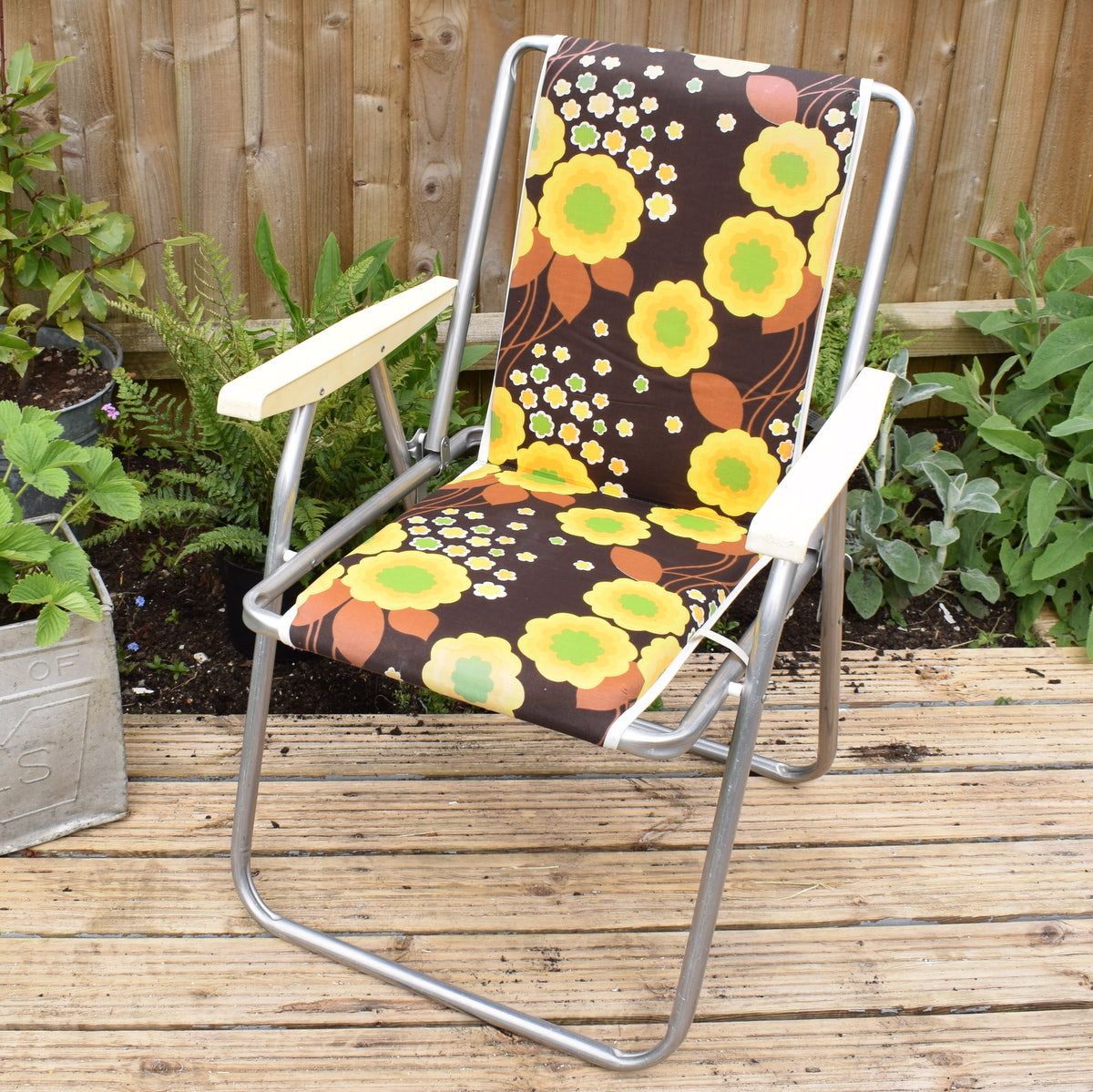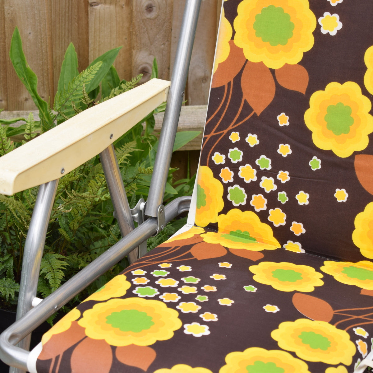 Vintage 1960s Folding, Padded Garden Chair - Flower Power - Yellow & Brown