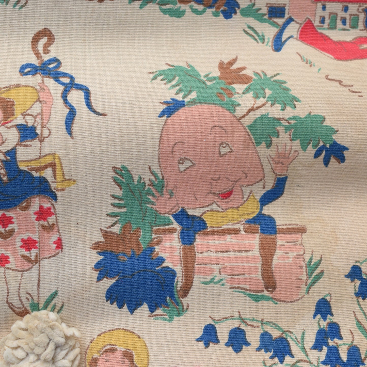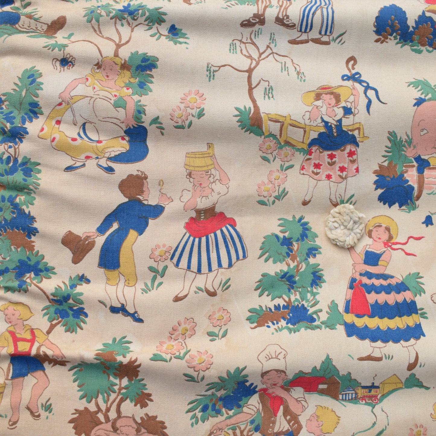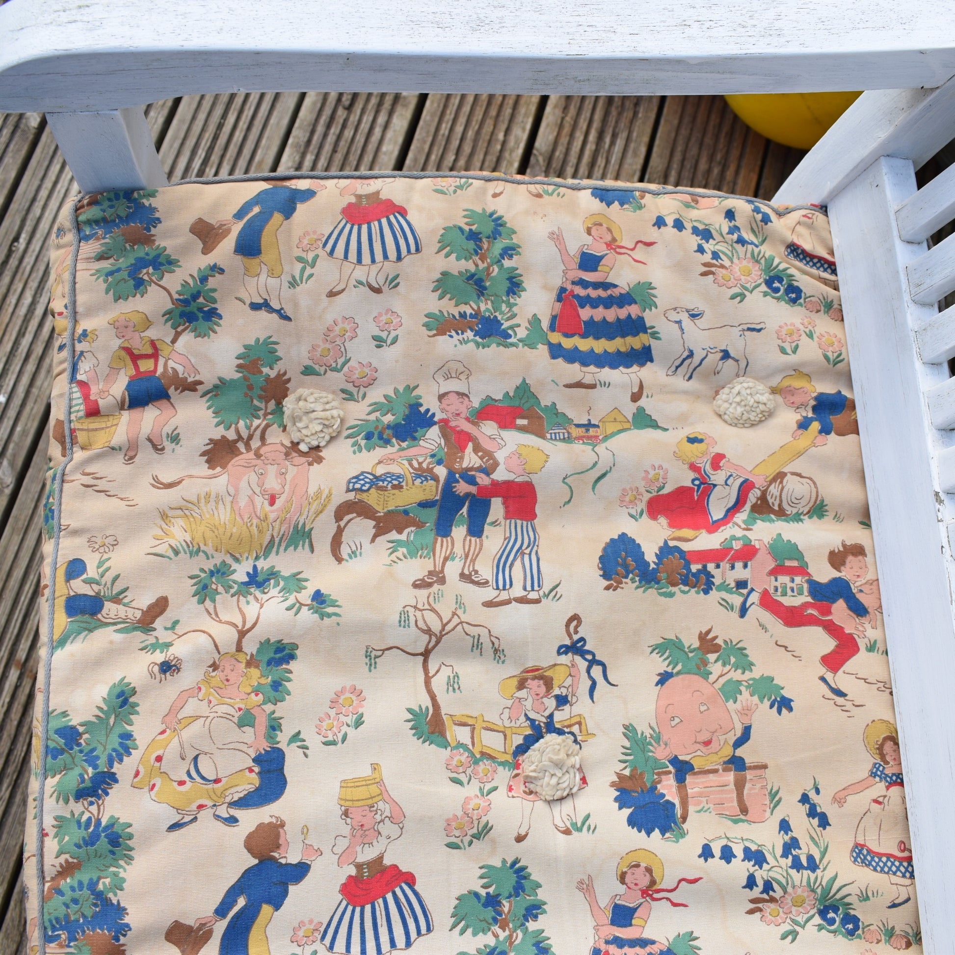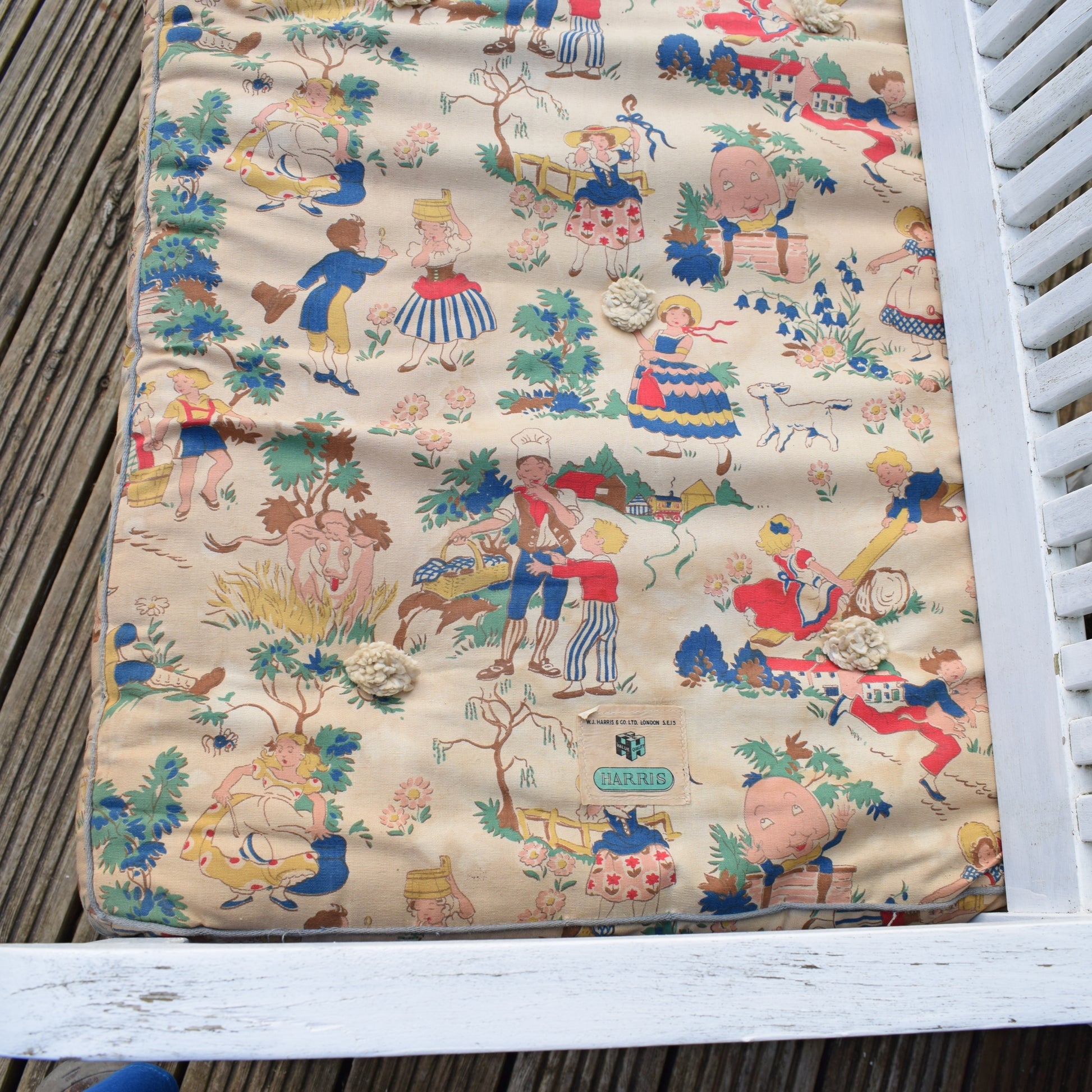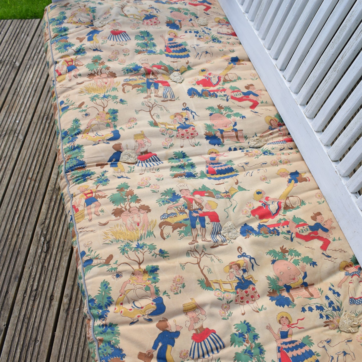 Originally a child's mattress, dating to the 1950s, maybe 40s i would say? the most amazing nursery rhyme print all over on both sides