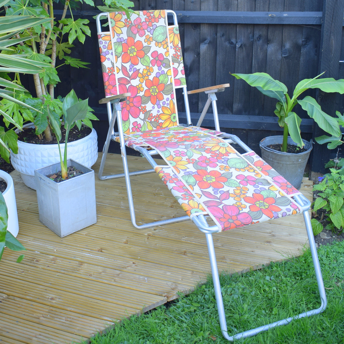 Vintage 1960s Garden Folding Sun Lounger / Chair - Pink Flower Power
