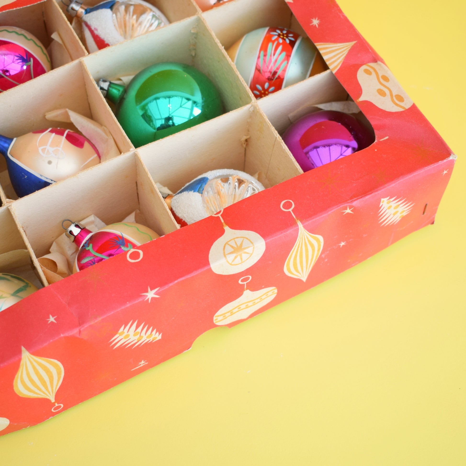 This is a box of vintage, 1960s medium sized glass christmas baubles.