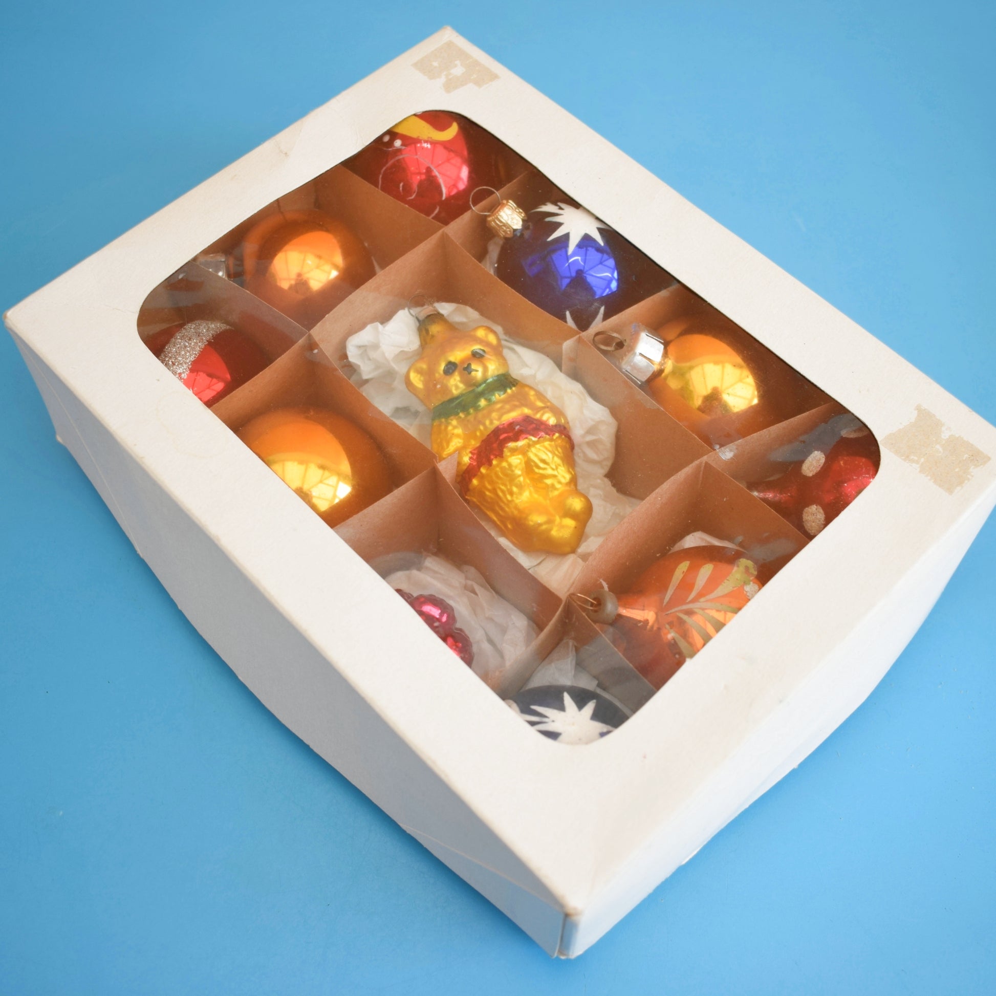 Charming set of authentic 1960s glass Christmas baubles—boxed medium assortment with a novelty bear ornament—perfect for collectors and anyone creating a nostalgic mid‑century holiday display.