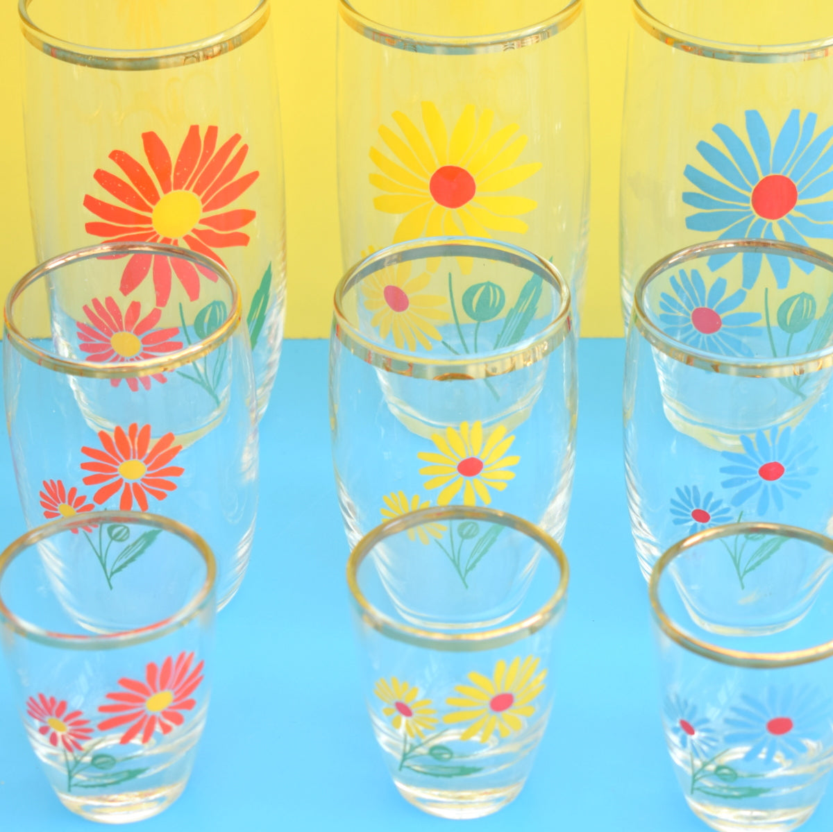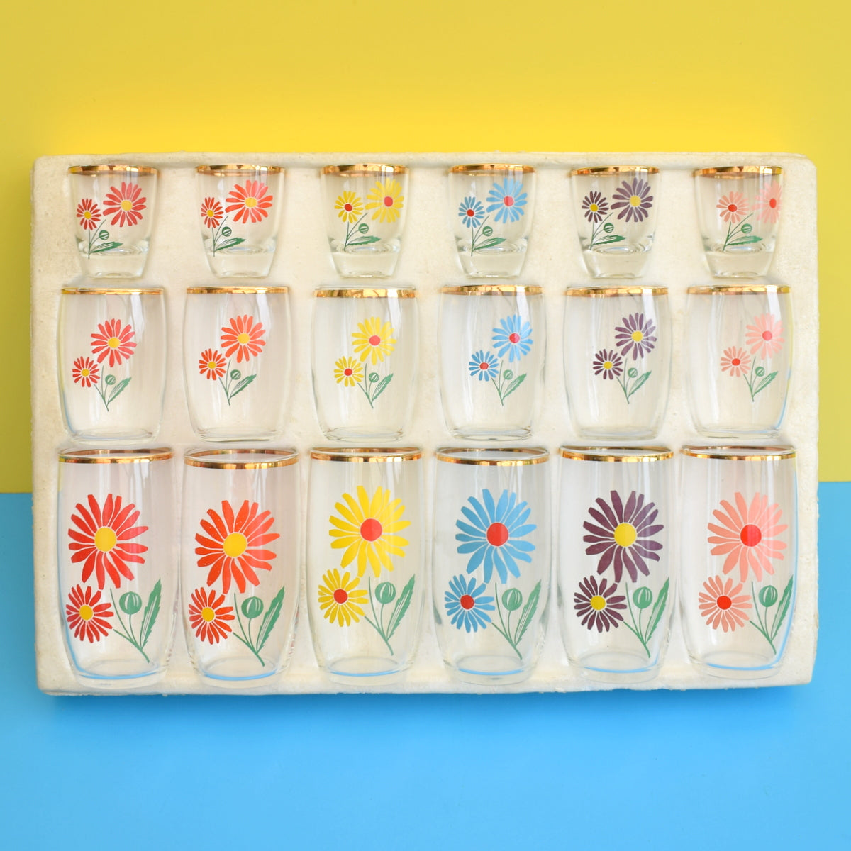 Vintage 1960s Glass Set - Boxed, Complete. Shot, Tot & Juice - Flower Power
