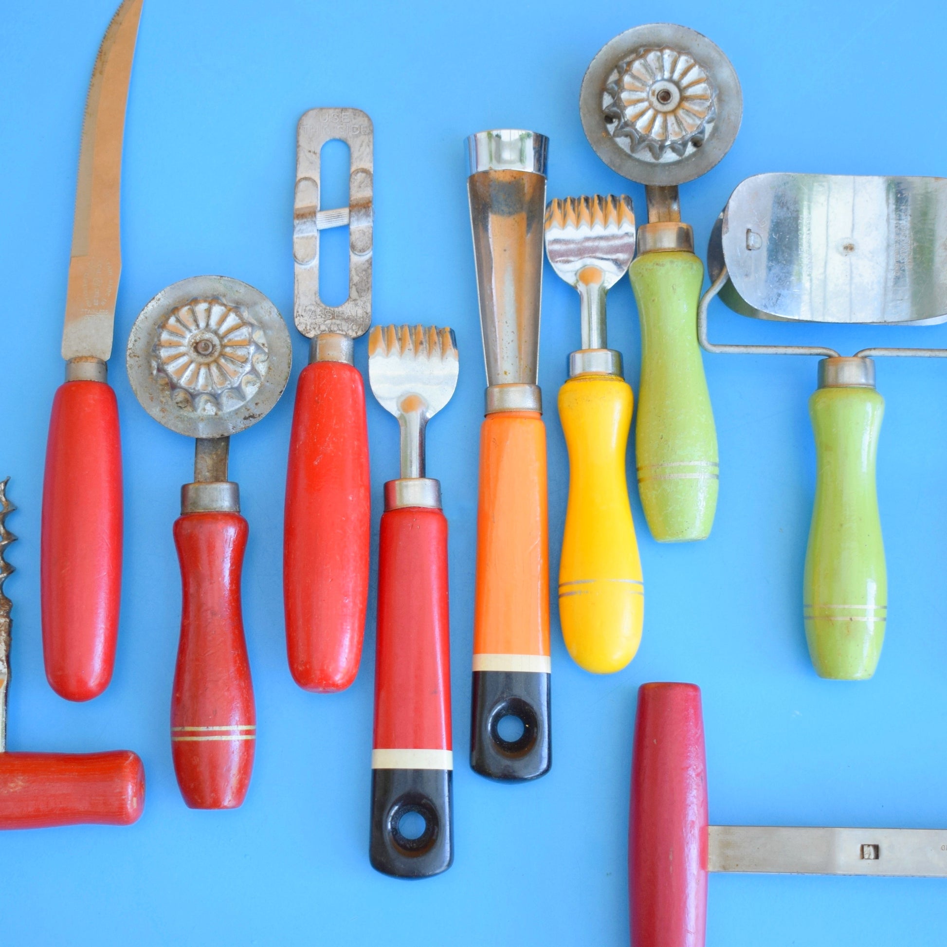 Bright, playful and unmistakably mid-century, this smaller assortment of 1960s rainbow kitchen utensils brings instant retro charm to cooking, styling and display. Ideal for collectors, stylists, or anyone wanting a pop of colour in the kitchen.