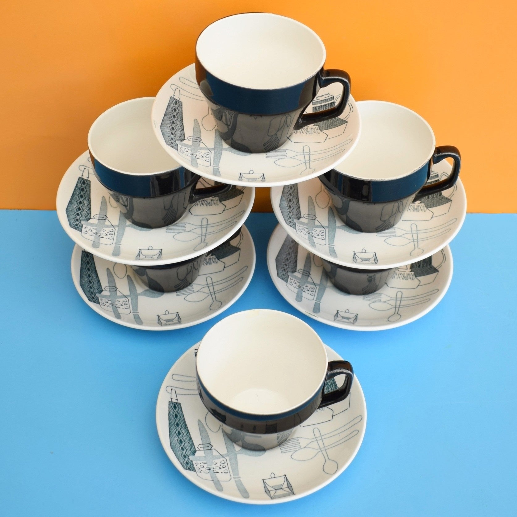 Vintage 1960s Kitsch Barker Bros Cups & Saucers - Fiesta x6