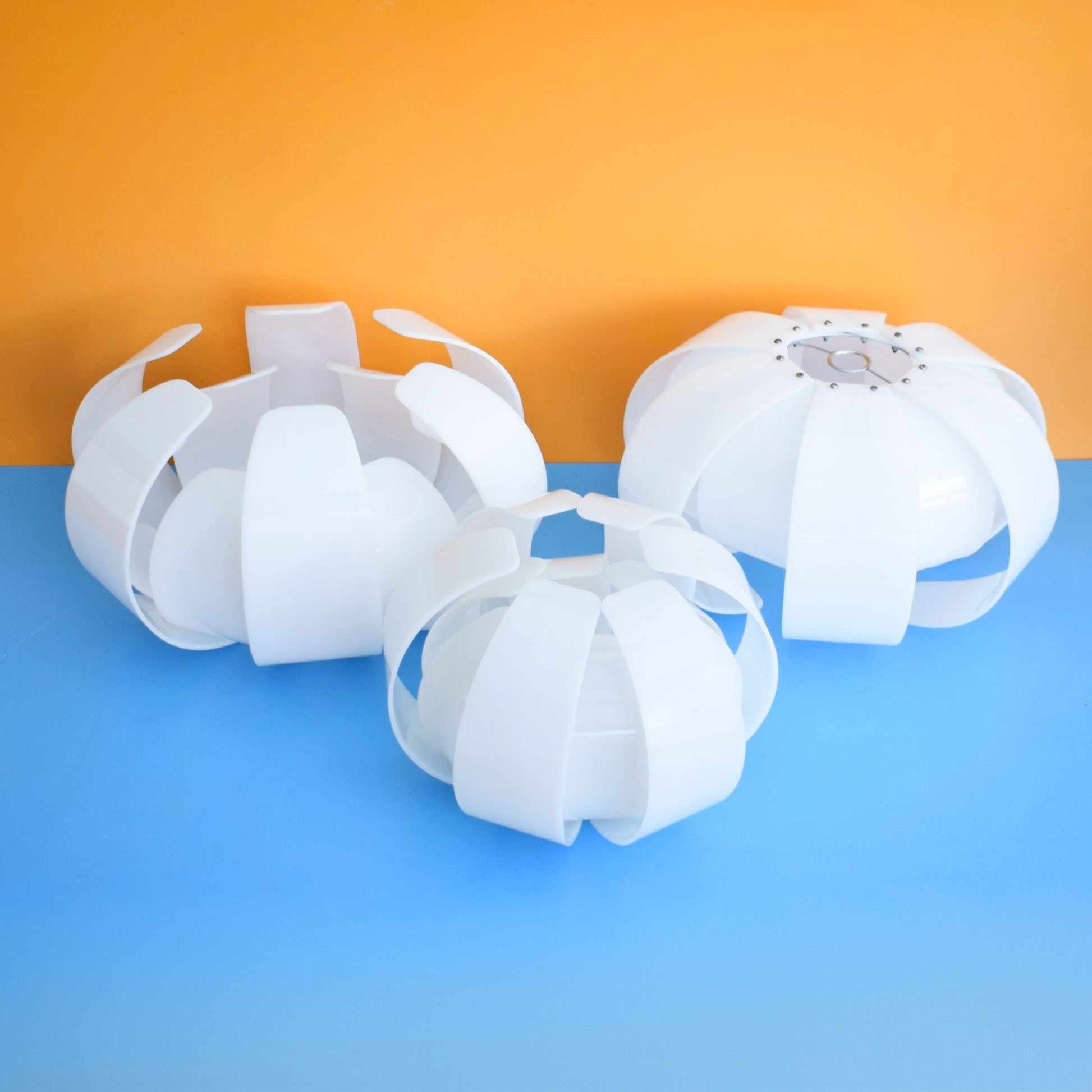 A striking set of vintage 1960s Perspex Lotus Light Shades in crisp white. Perfect for mid-century enthusiasts seeking a sculptural lighting focal point, this trio includes two large shades and one smaller shade, designed to attach to a standard pendant ceiling fitting or inverted on a table lamp for a different look.