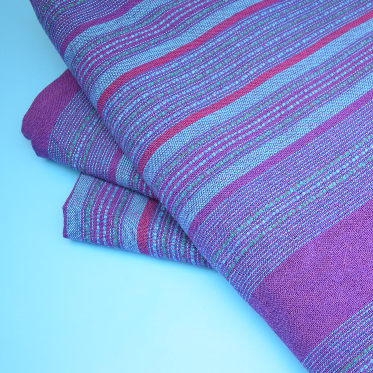 The fabric has a woven texture with threads of Teal green, Blue and purple throughout