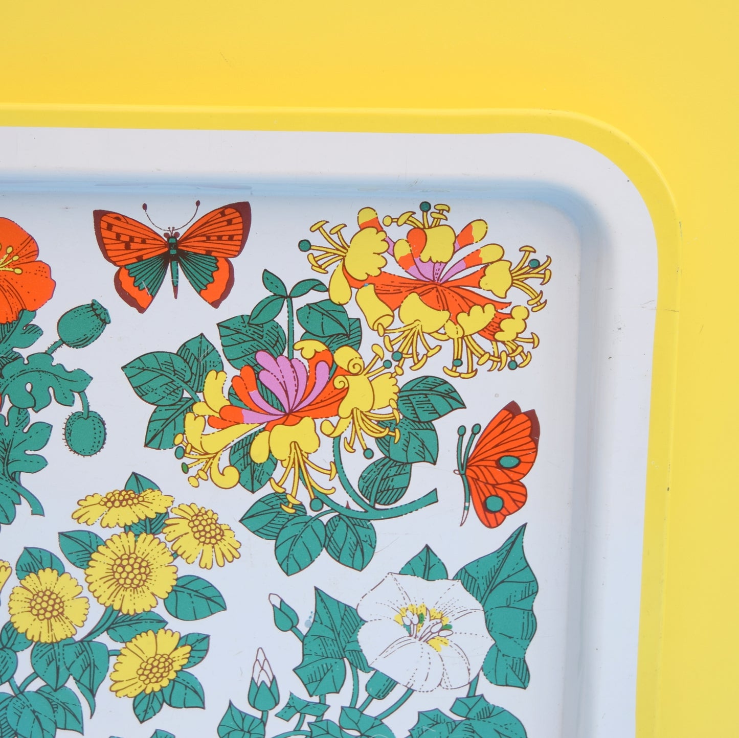 Vintage 1960s Metal Tray - Butterfly & Flower Design - Orange , Green & Yellow