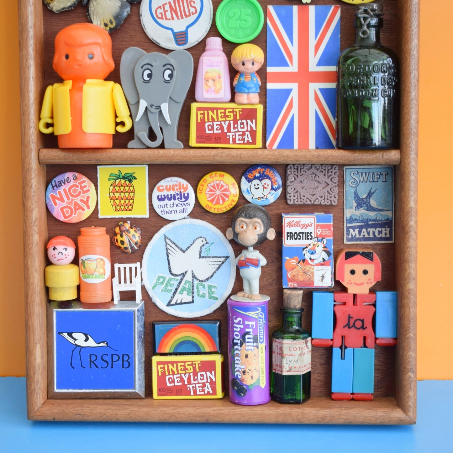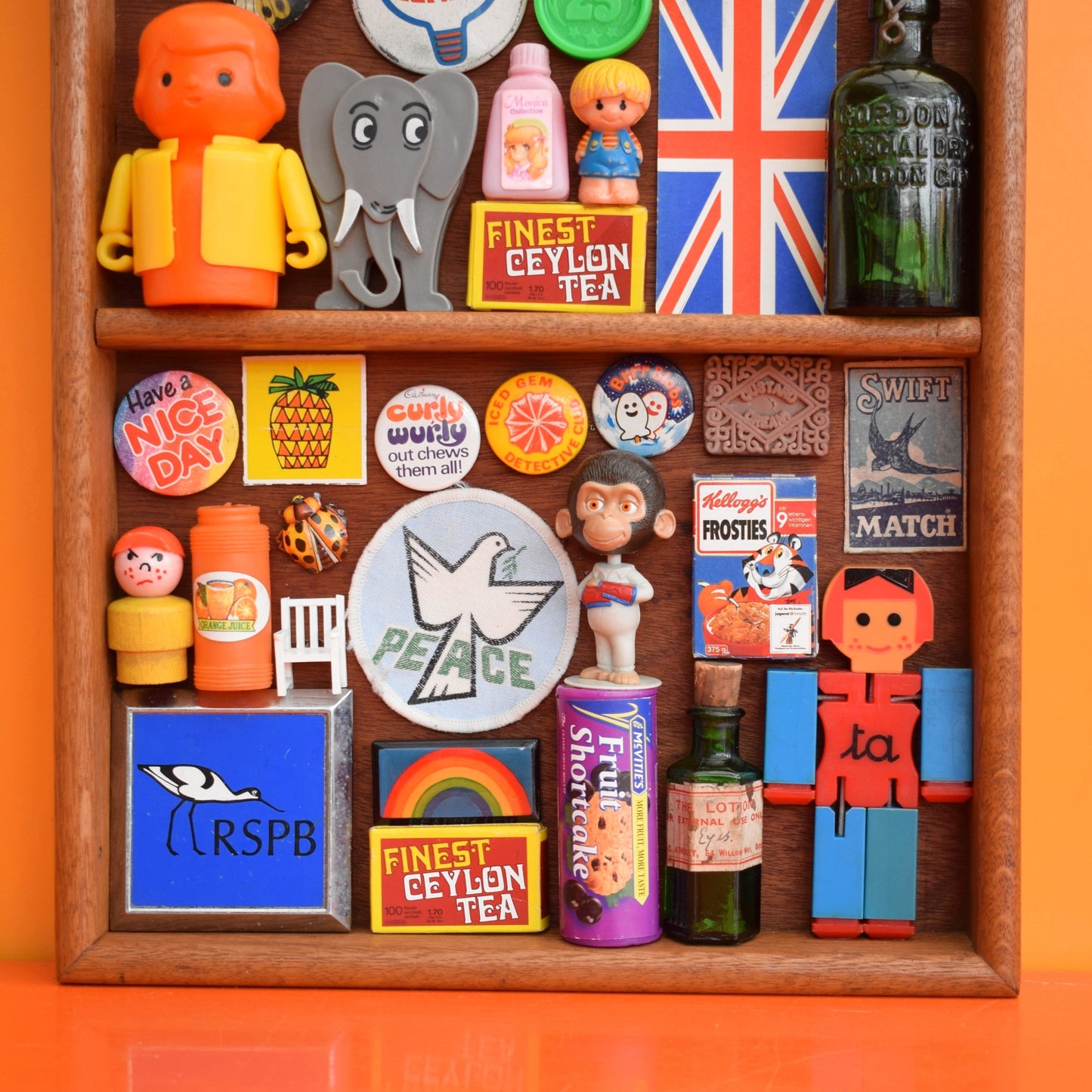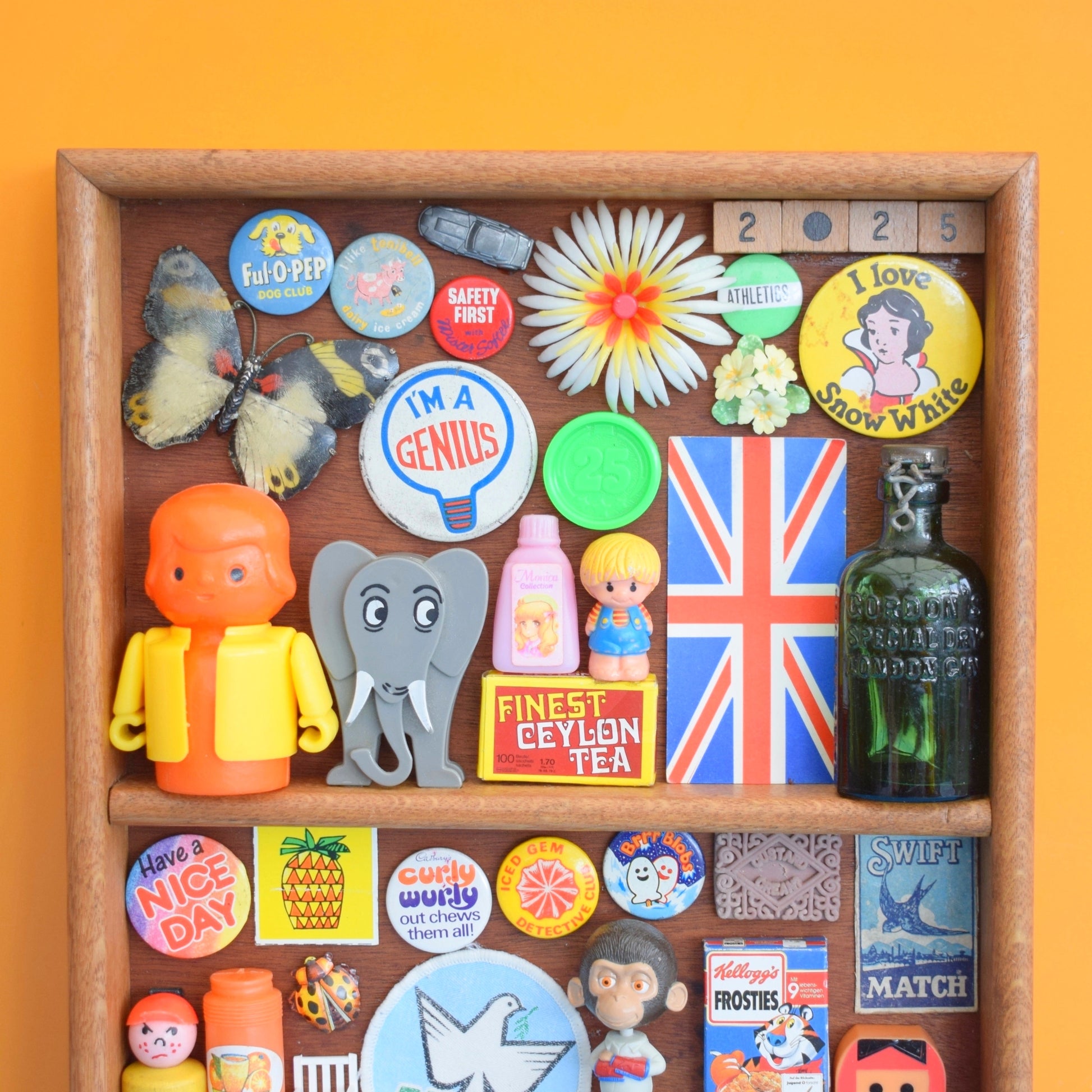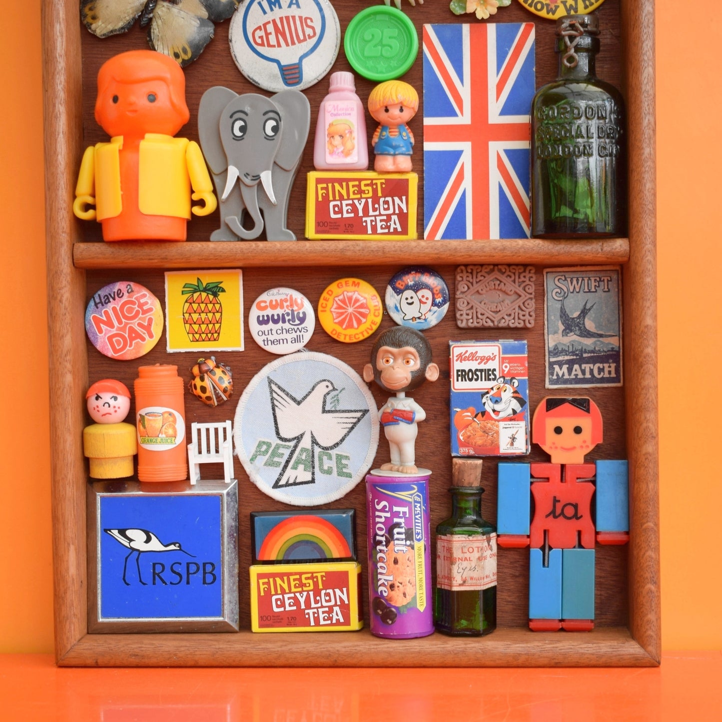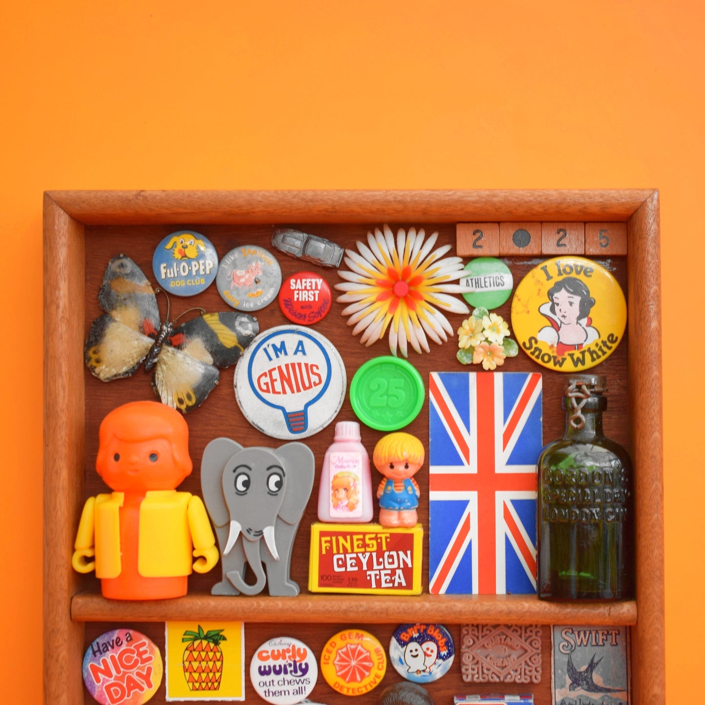 A wooden tray style unit, Filled with a carefully curated collection of tiny vintage treasures