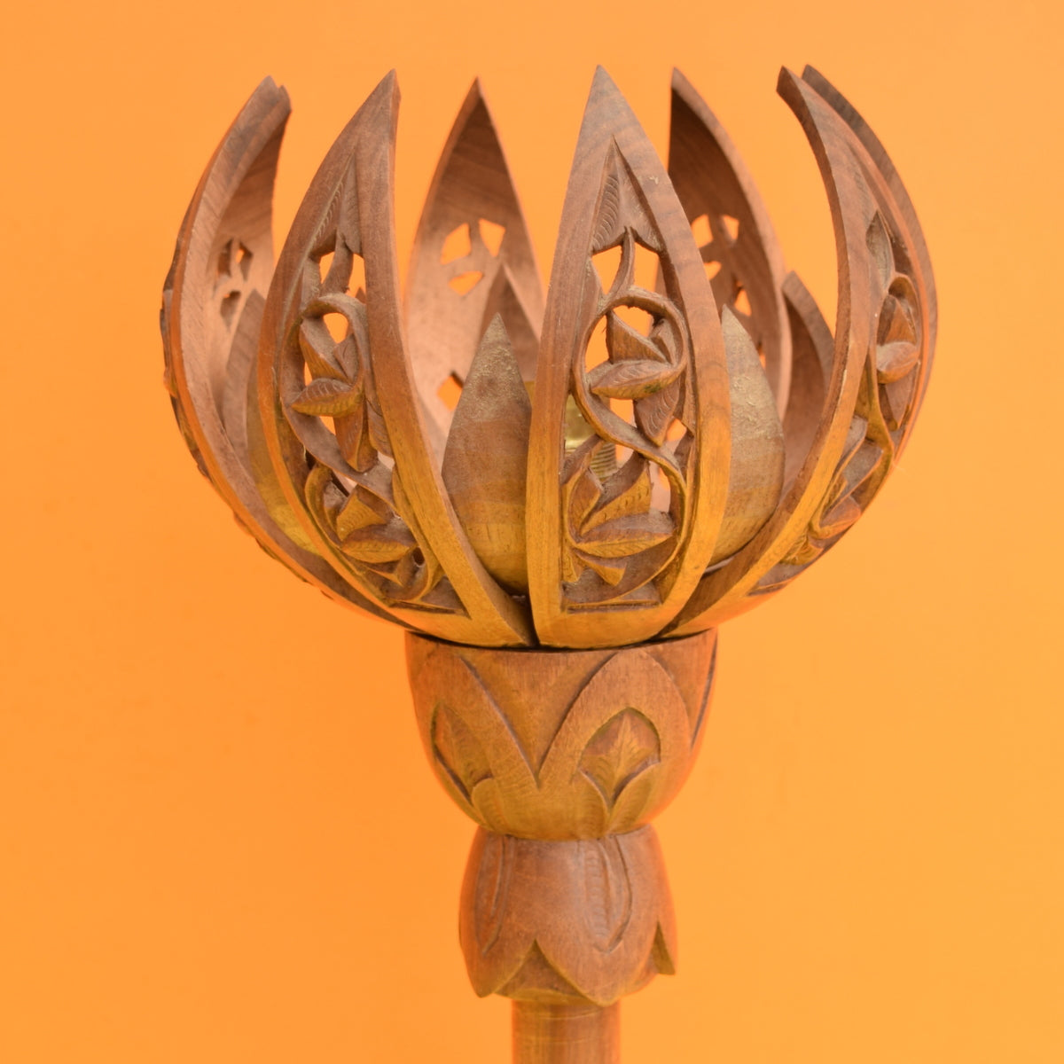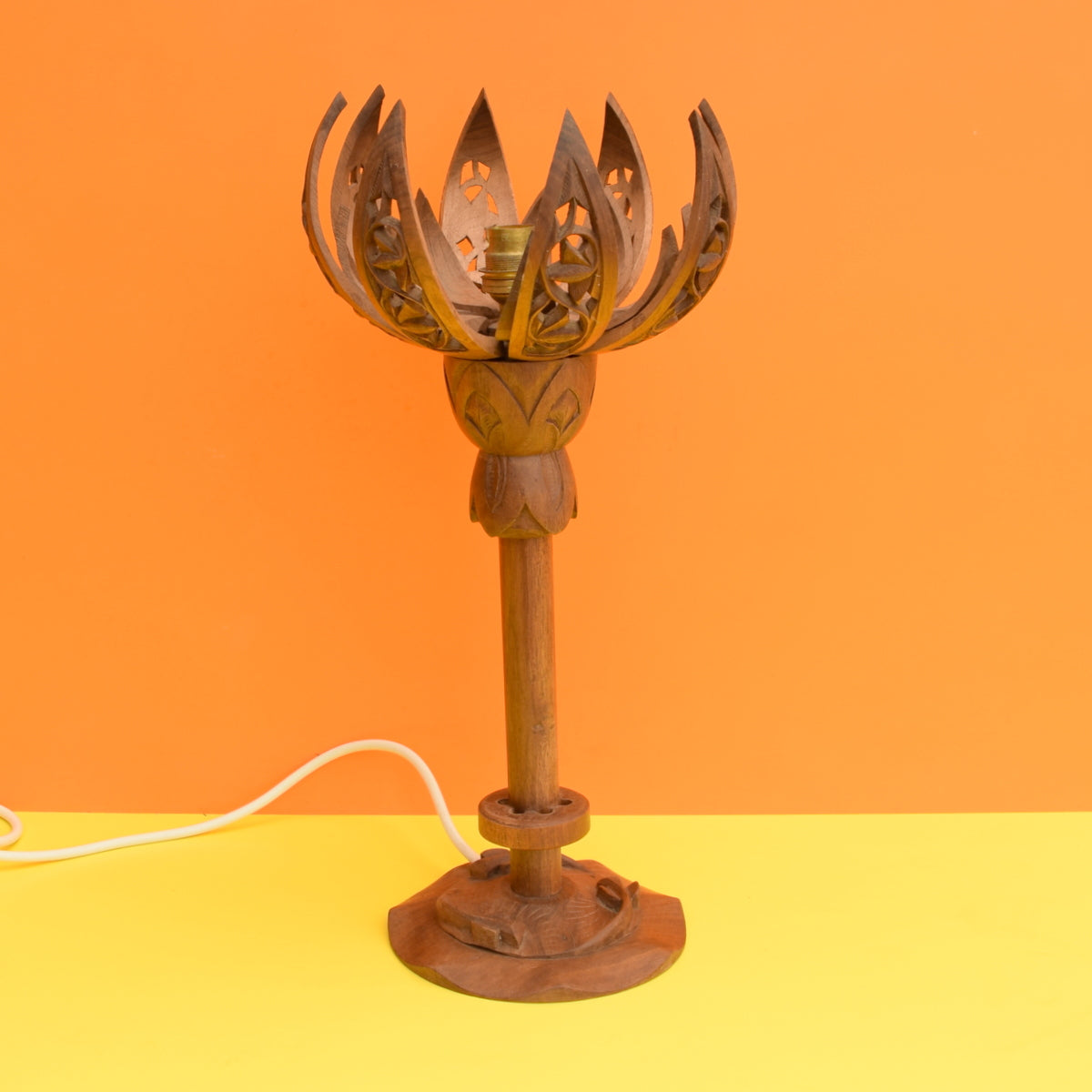Vintage 1950s Oriental Wooden Opening Flower Table Lamp - Intricate Carving