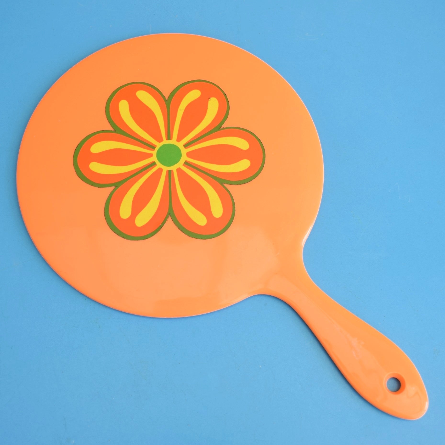 Made from orange plastic, with a fab vinyl flower sticker design on the back