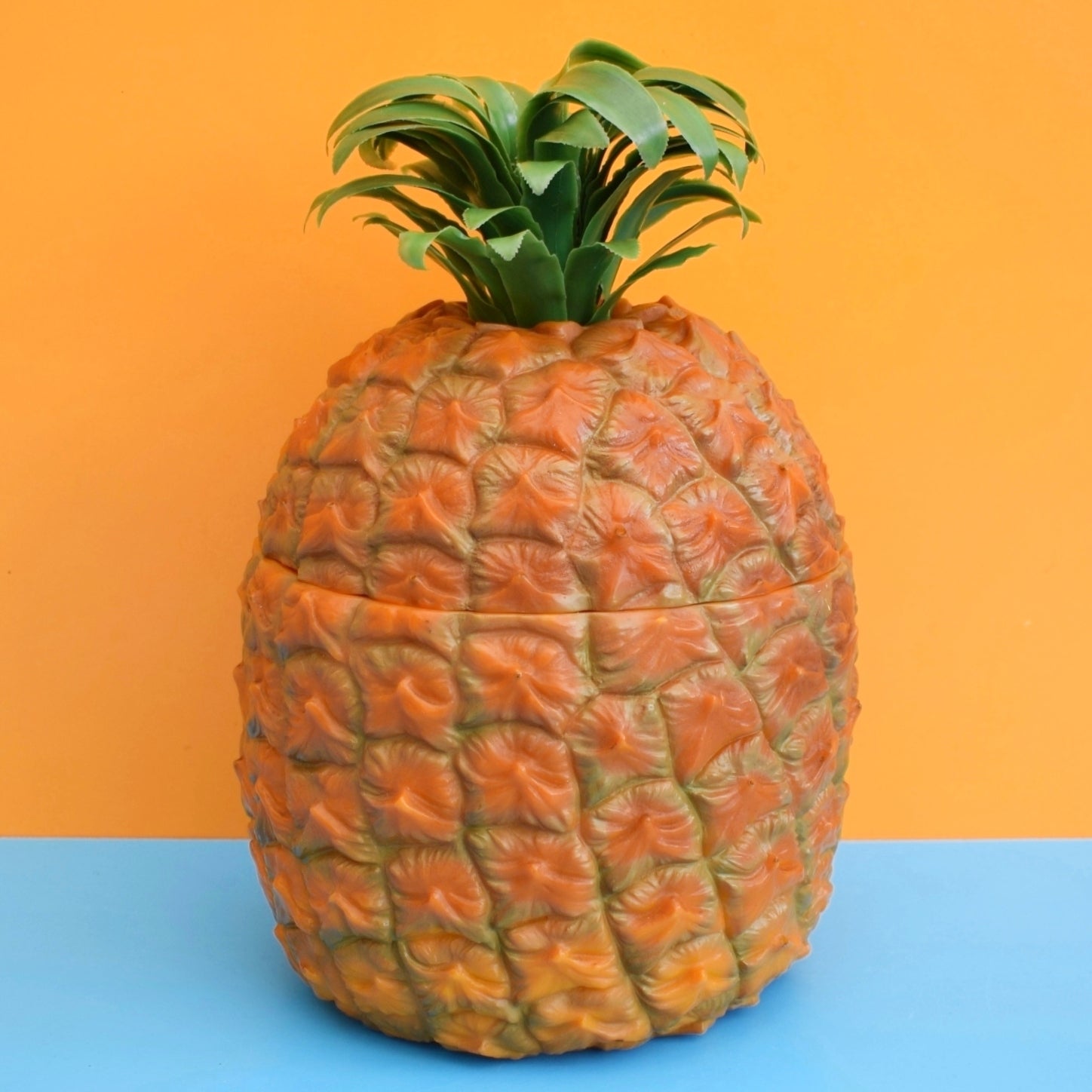 This authentic vintage pineapple ice bucket makes a standout addition to retro kitchens, themed bars, drinks trolleys, and summer parties. The bright orange and yellow plastic and textured pineapple surface capture classic 1960s fun and kitsch, while the thicker, heavier construction gives it a solid, durable feel compared with later, lighter examples.