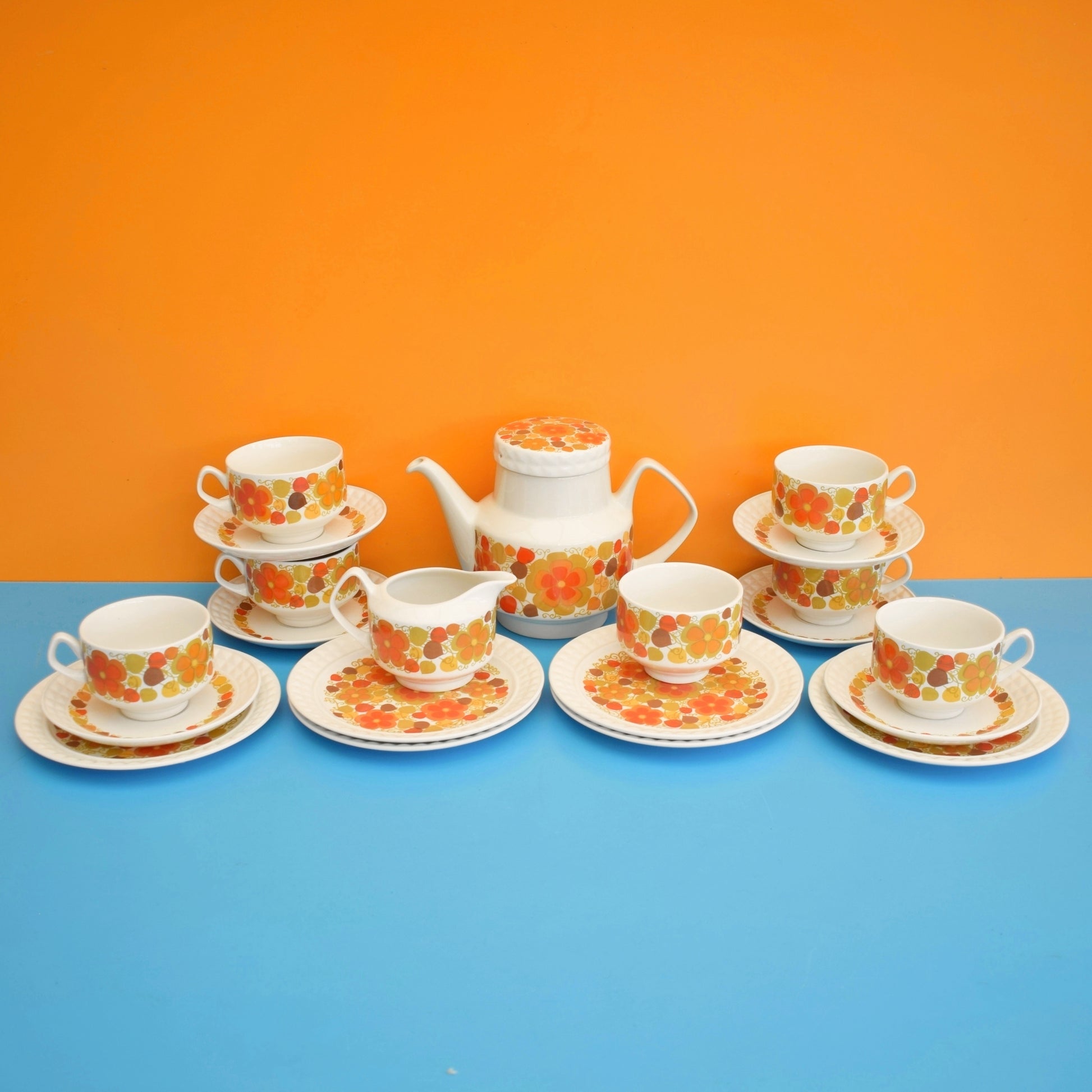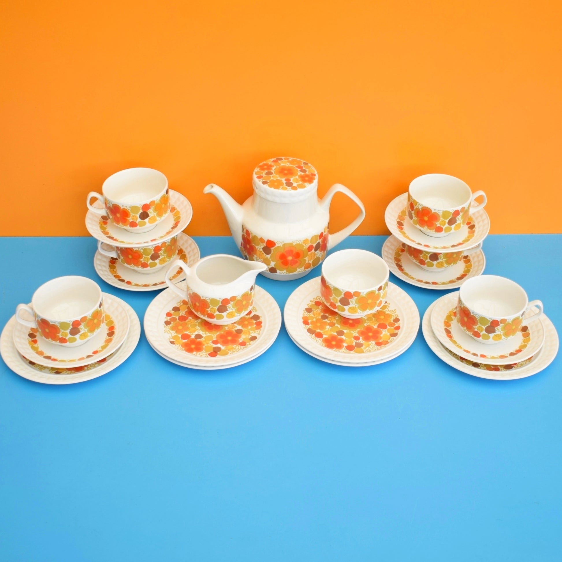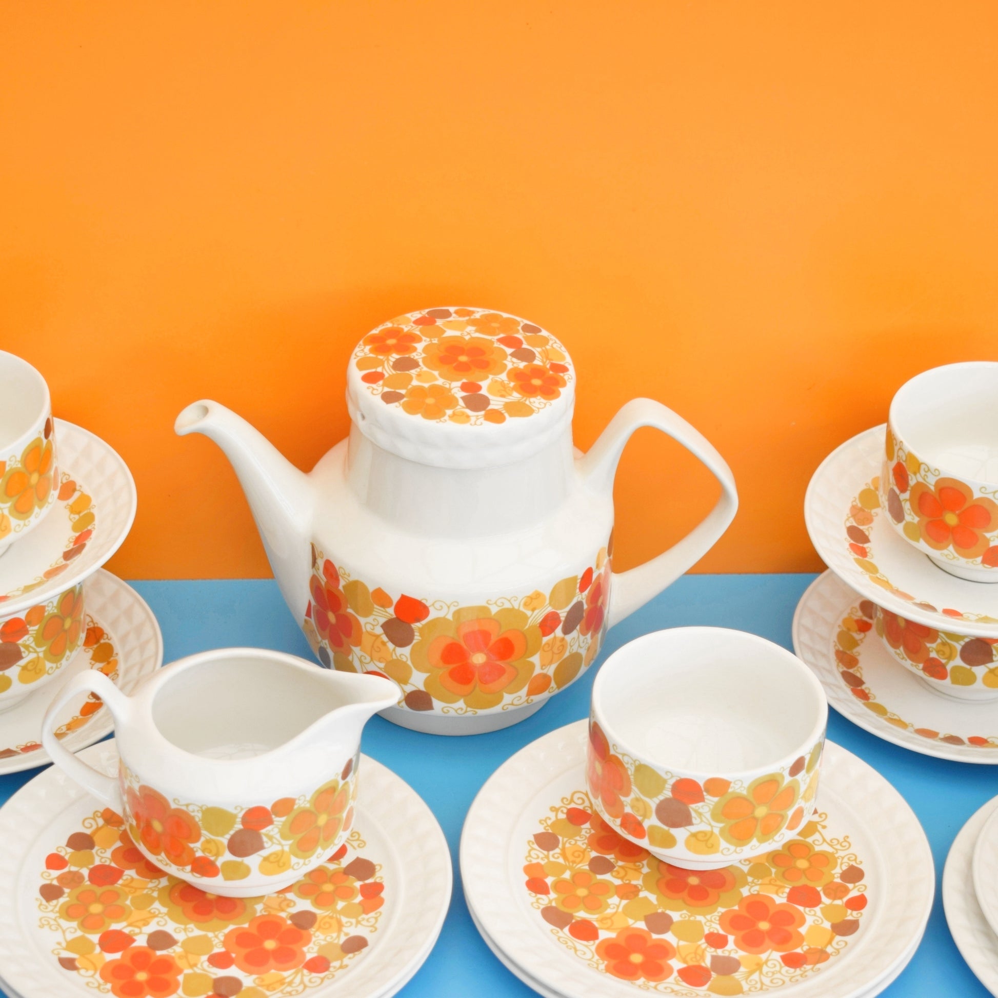 A vintage 1960s Pontesa tea set from Spain, part of the Fantasia “Young Range” with a bold orange floral print—an eye-catching centerpiece for mid-century tables or display cupboards.