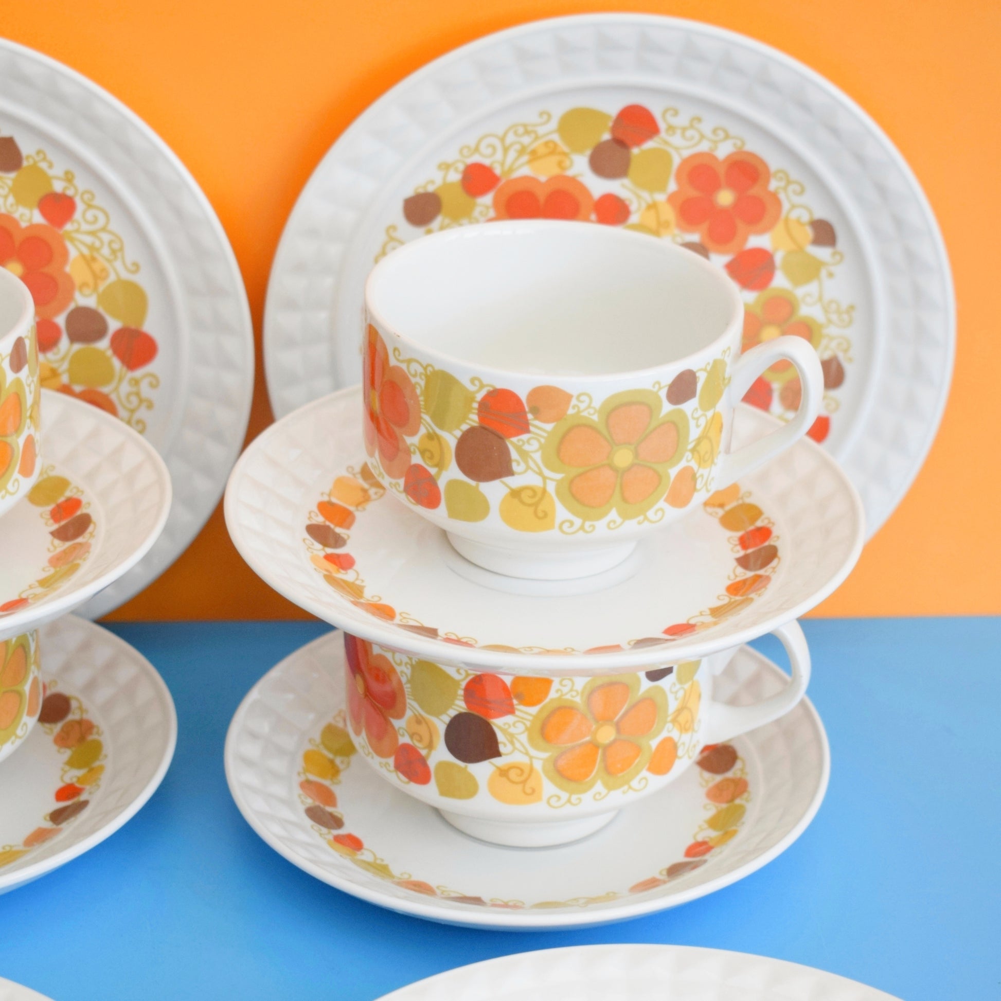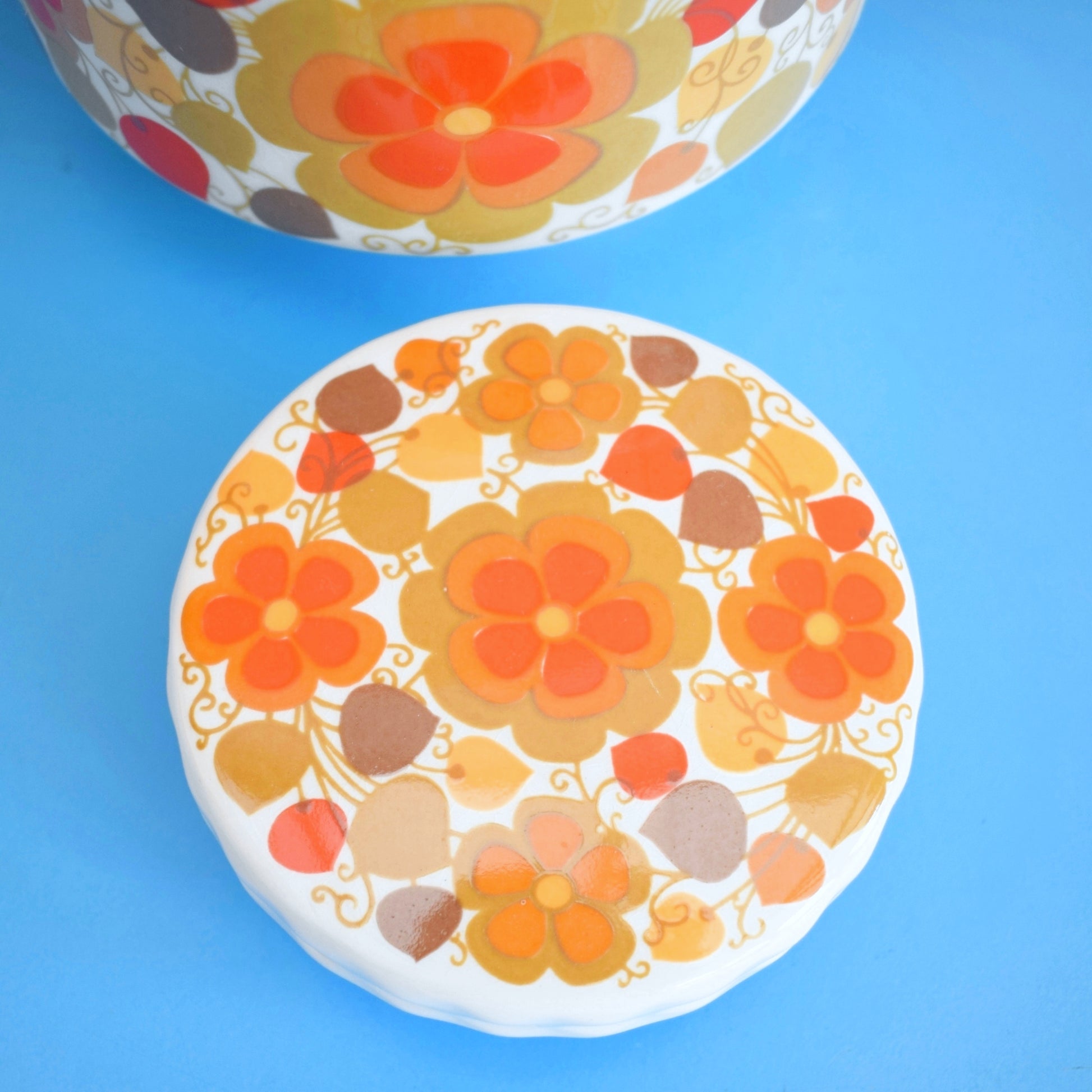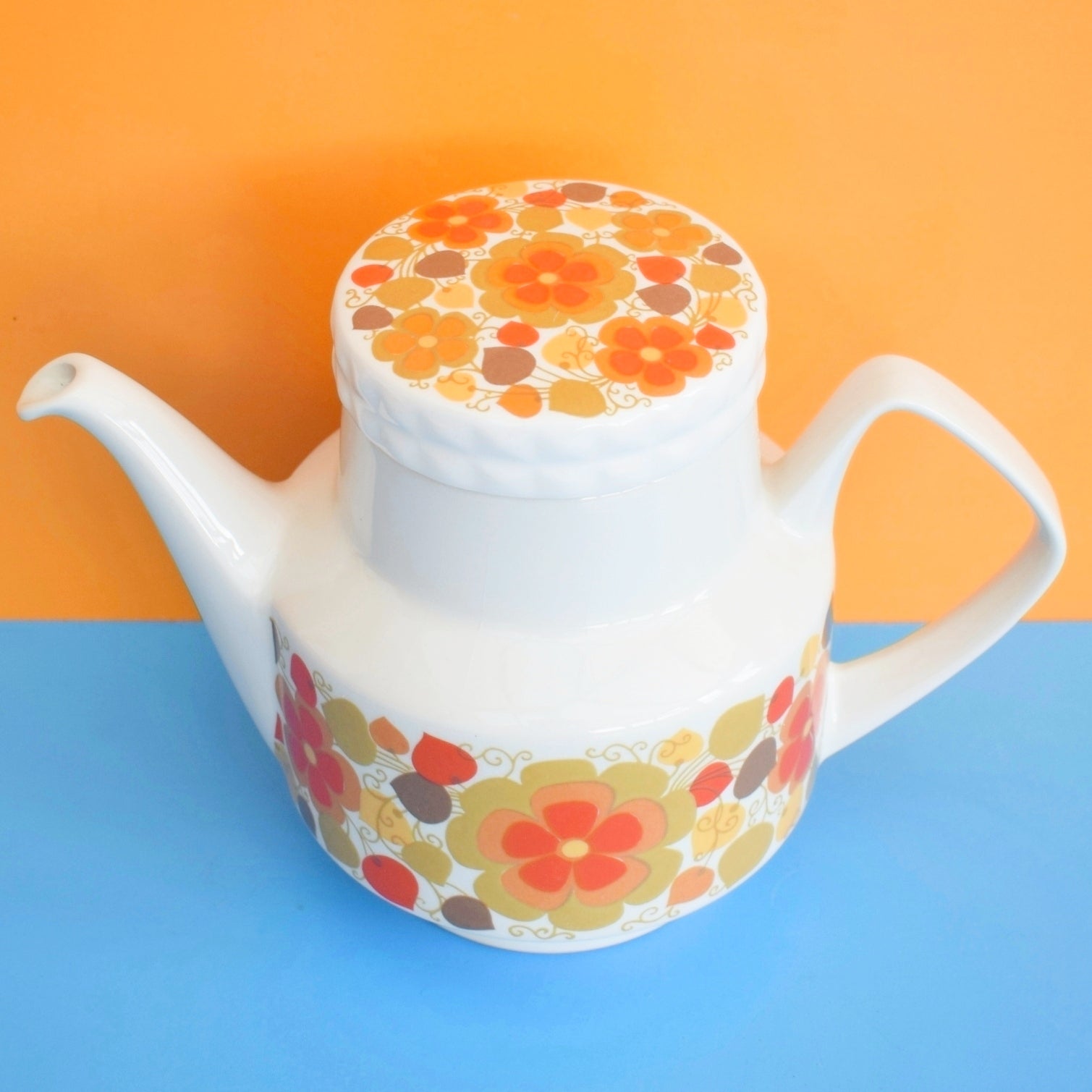 A vintage 1960s Pontesa tea set from Spain, part of the Fantasia “Young Range” with a bold orange floral print—an eye-catching centerpiece for mid-century tables or display cupboards.