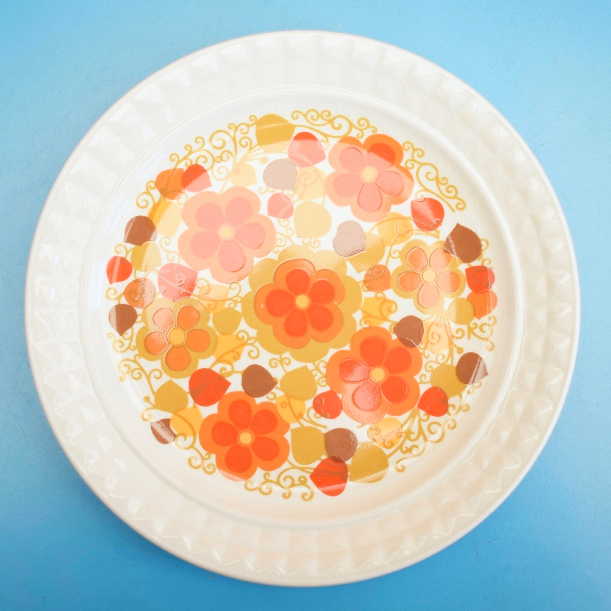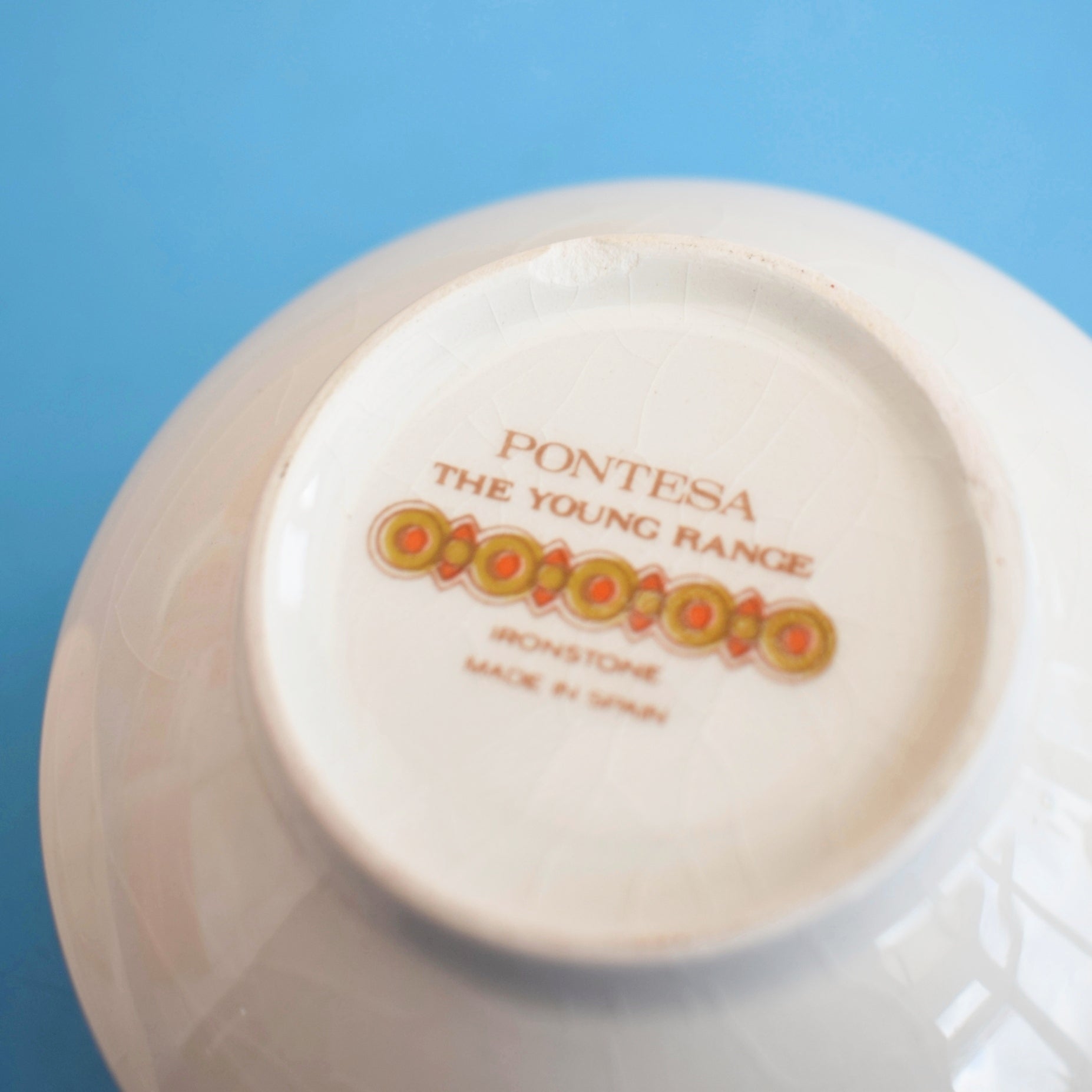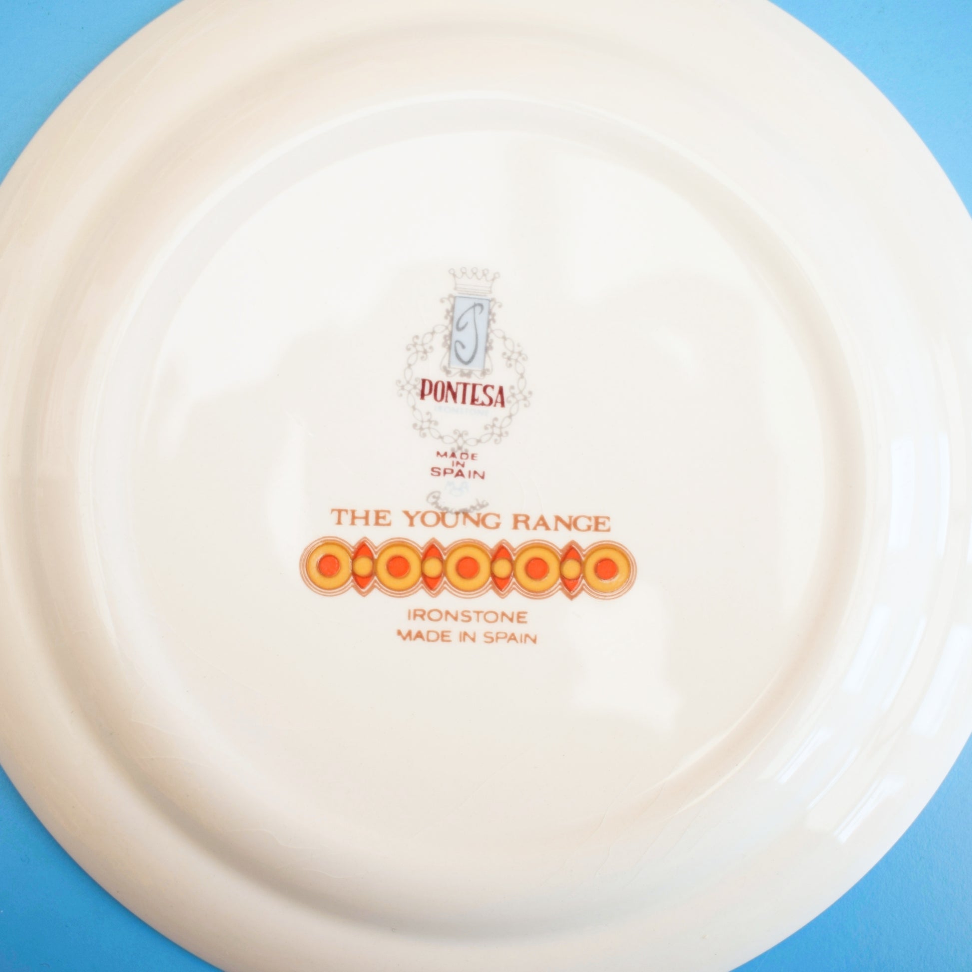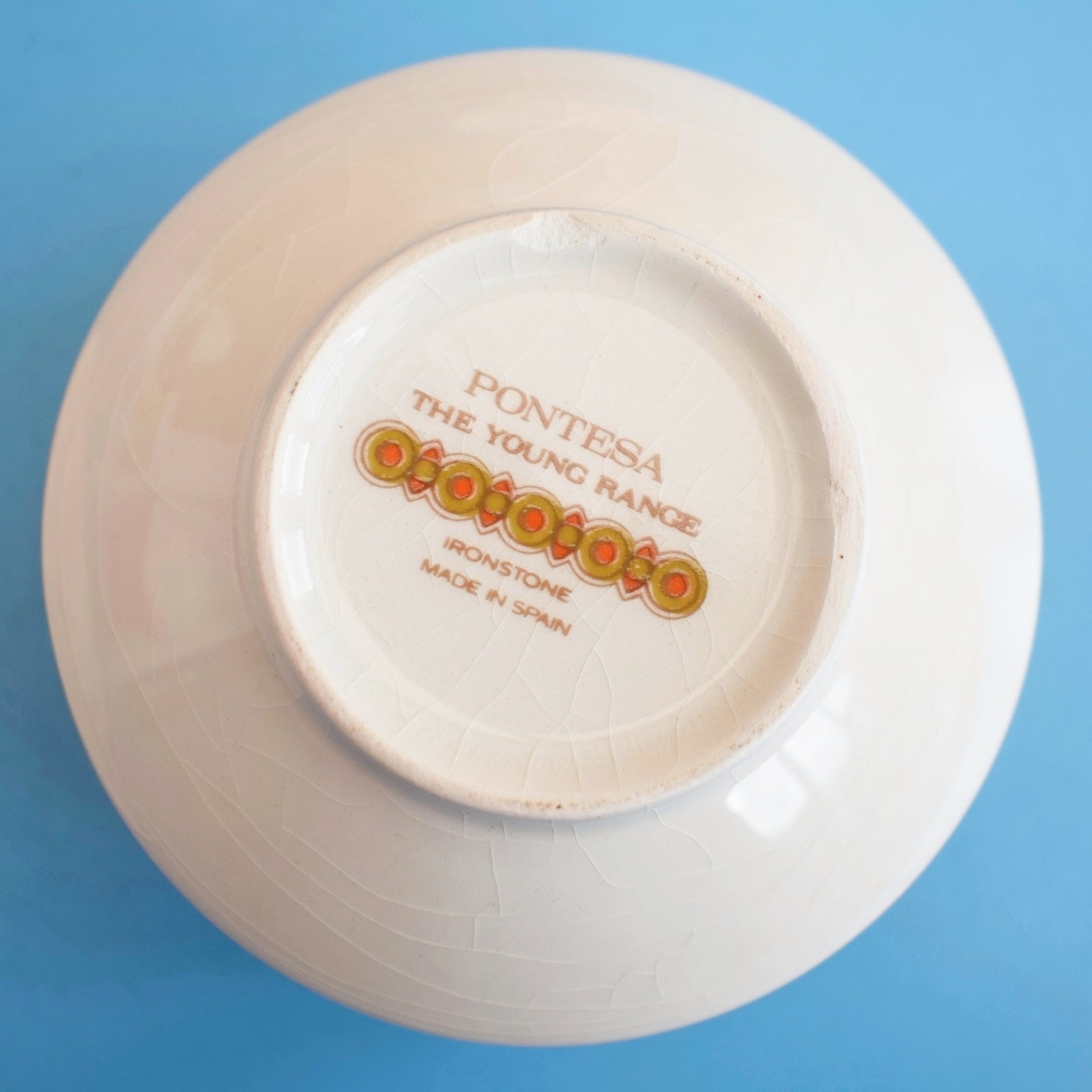 This Pontesa Fantasia set comprises a teapot, milk jug, sugar bowl, six tea cups and saucers, and six tea plates, offering generous service for gatherings or display. The “Fantasia” motif—the Young Range—delivers a vibrant orange flower power that pairs beautifully with warm wood tones and retro textiles. While the print remains striking, some pieces show age-related flaws: the sugar and milk jug rims have small chips underneath; additionally, one saucer, one tea plate, and another saucer have tiny chips that are not immediately noticeable. These nuances are typical of vintage ceramics from this era and are disclosed for transparency.