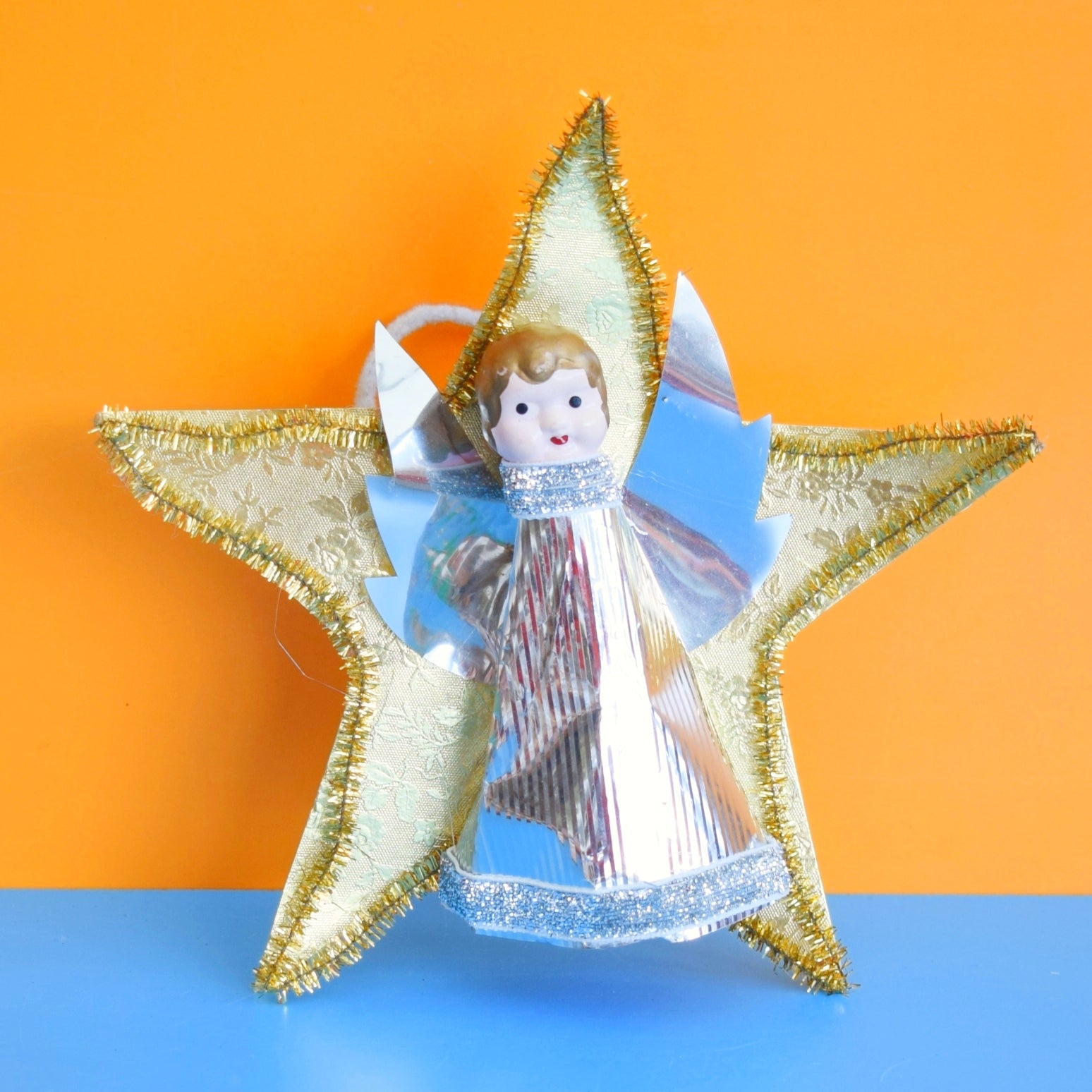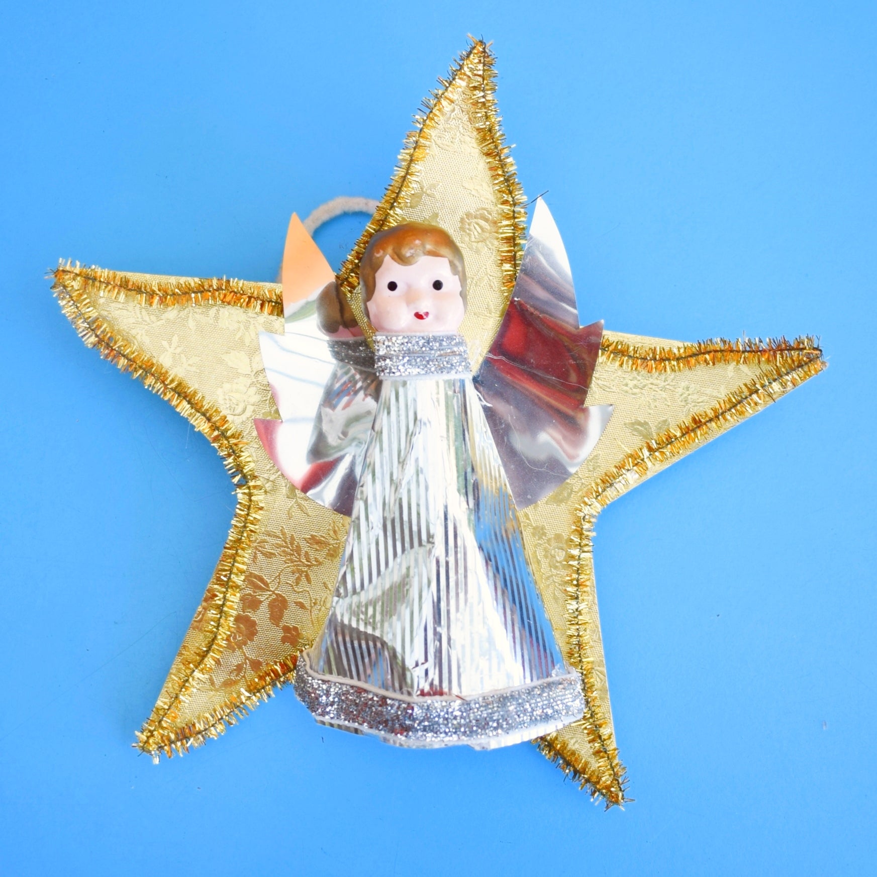 This vintage 1960s Christmas tree topper features a pretty fairy perched on a star, adding nostalgic charm to festive decor. A delightful piece for collectors and anyone seeking whimsical, holiday sparkle.