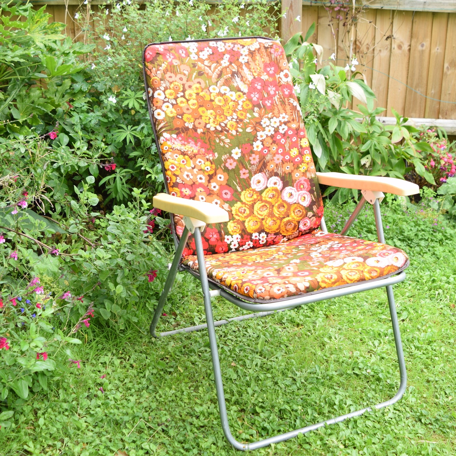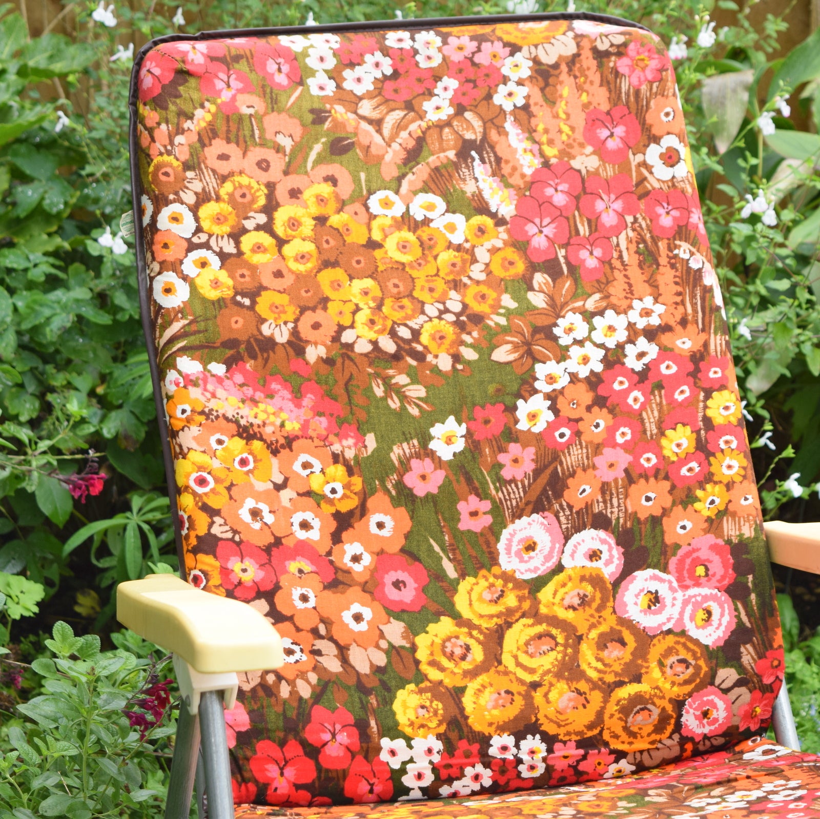 Vintage 1960s Reclining Folding Garden Chair - Flower Power - Orange & Pink