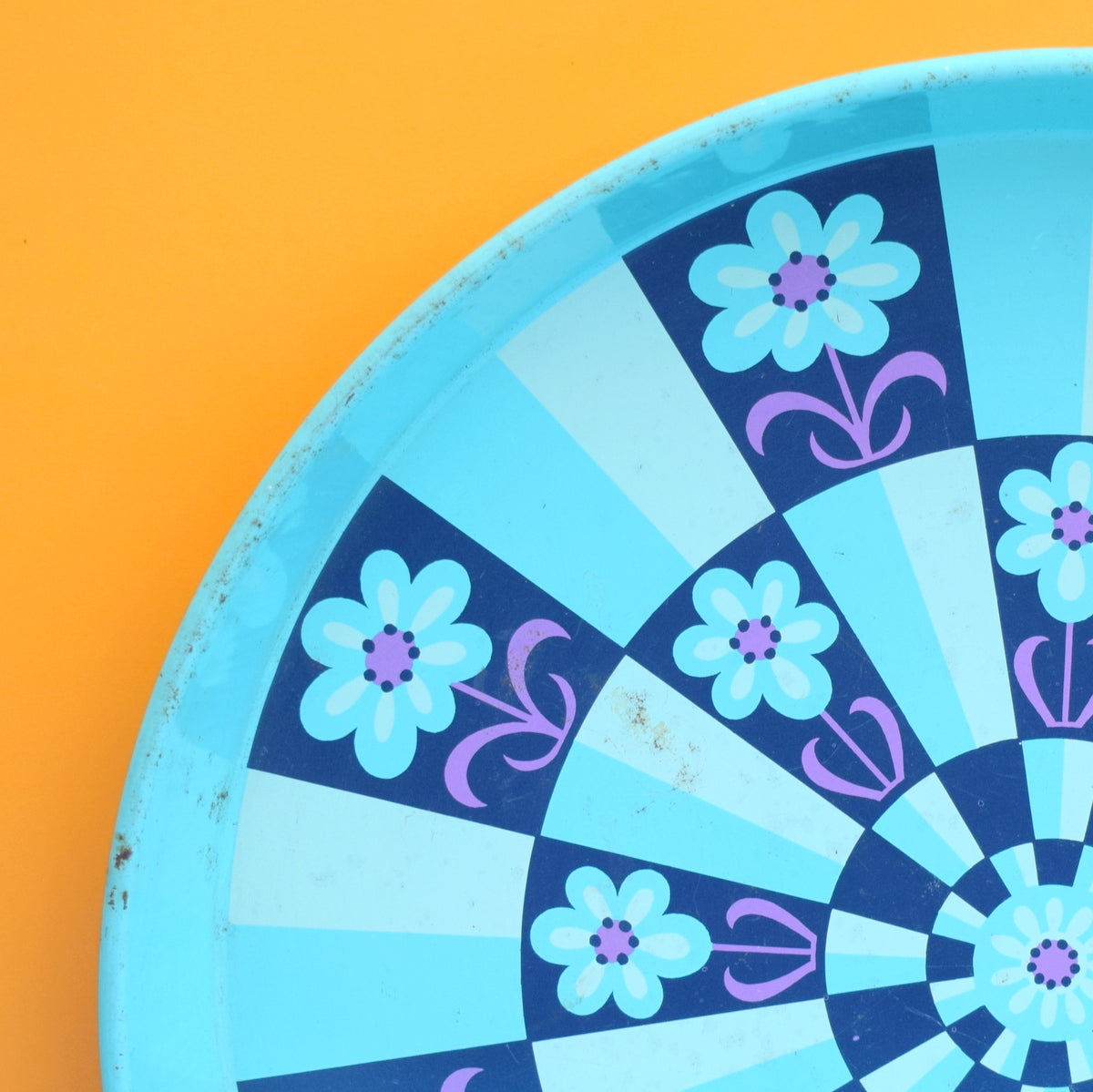 This is a vintage round tin tray. It has a bold flower / Geo design in blue