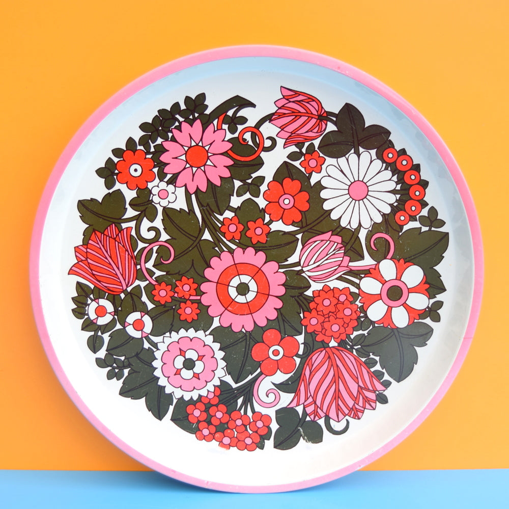 This is a vintage round tin tray. It has a bold flower design in a more unusual pink colourway