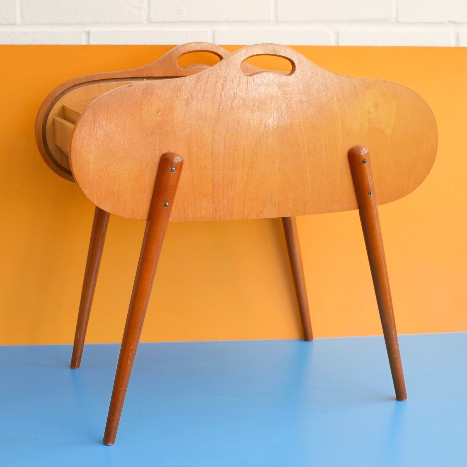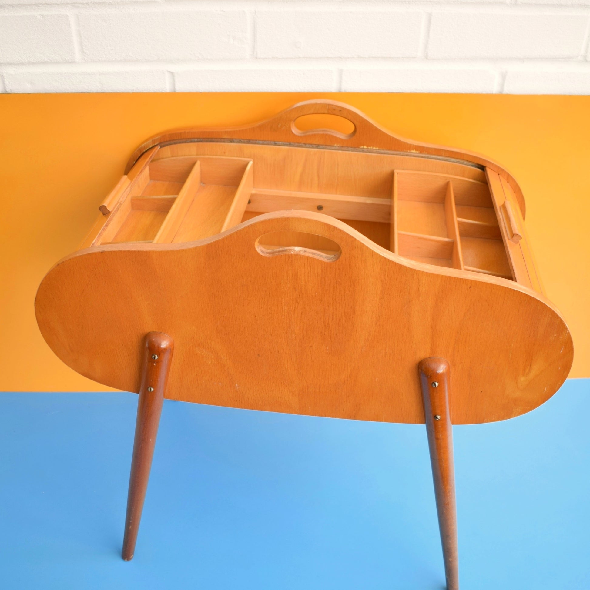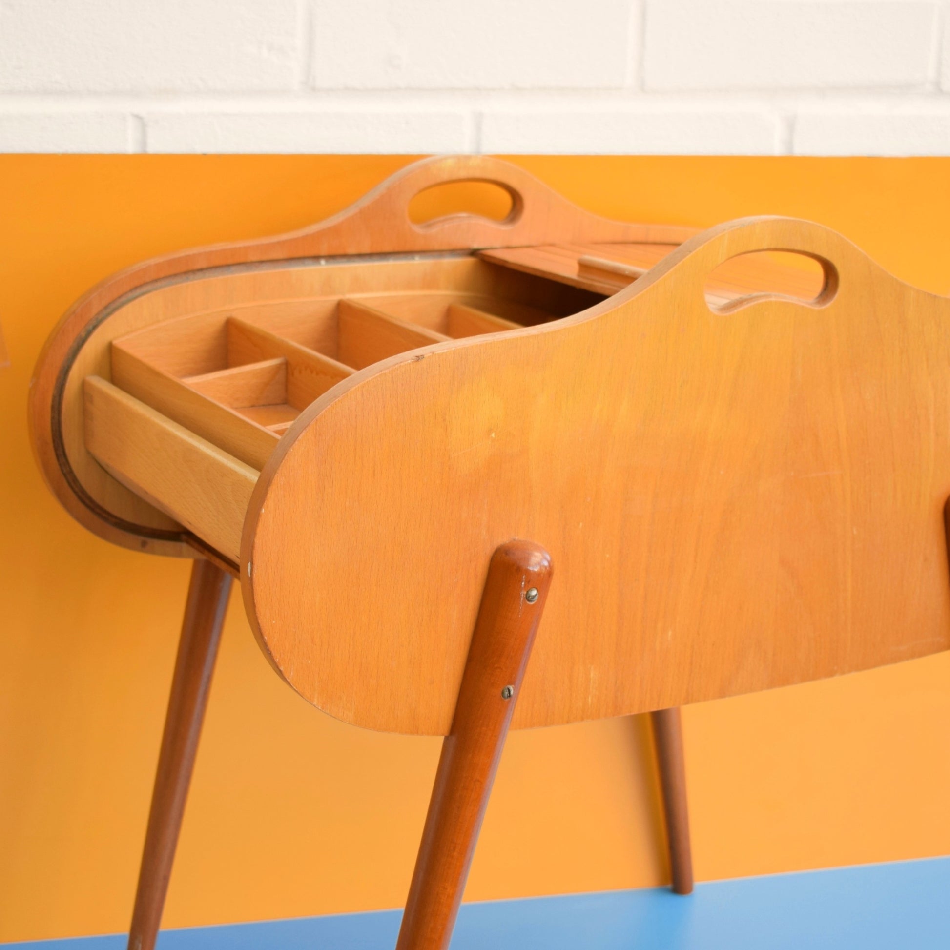 Whether used as a focal point in a living room, a dedicated craft station, or a storage solution in a bedroom, this piece brings mid-century character and practical organisation to any home. No maker's marks were found, though the clean lines and tapered legs reflect popular Scandinavian influences of the era.