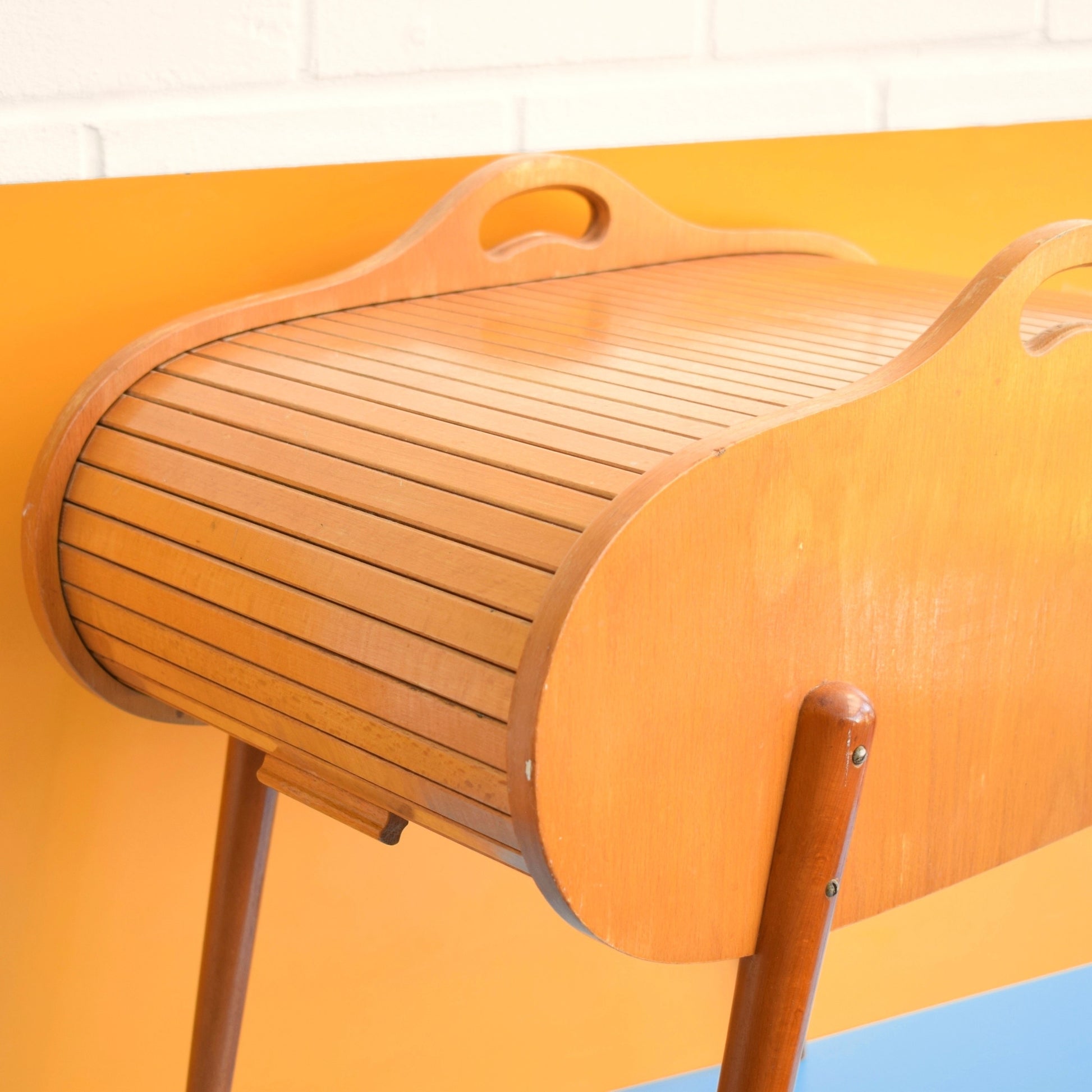 Vintage 1960s Beech Wood Sewing & Hobby Box with Tambour Roll-Top