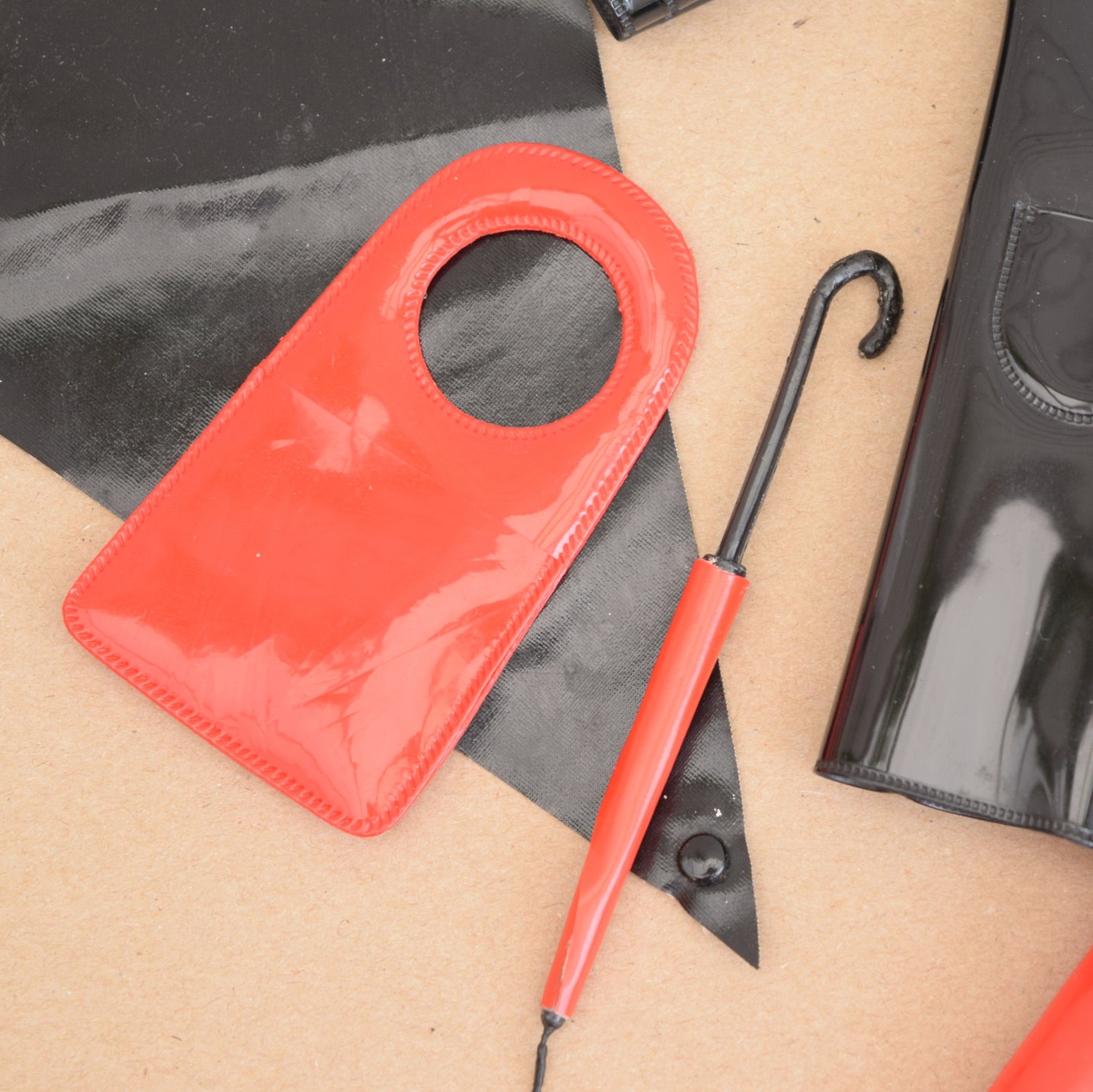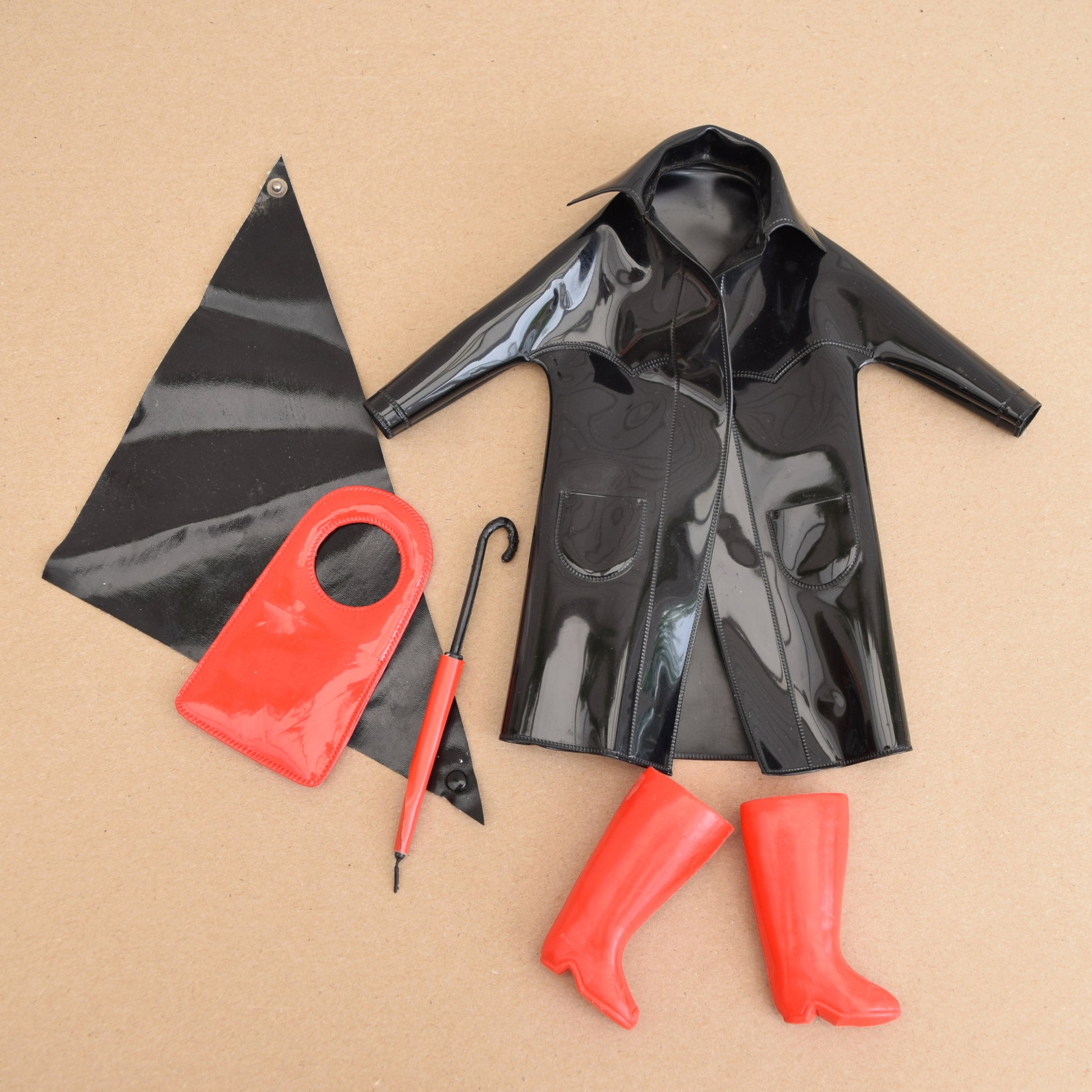 'Shopping in the rain'- Black mac, boots, headscarf, bag and umbrella (this has some chew marks)