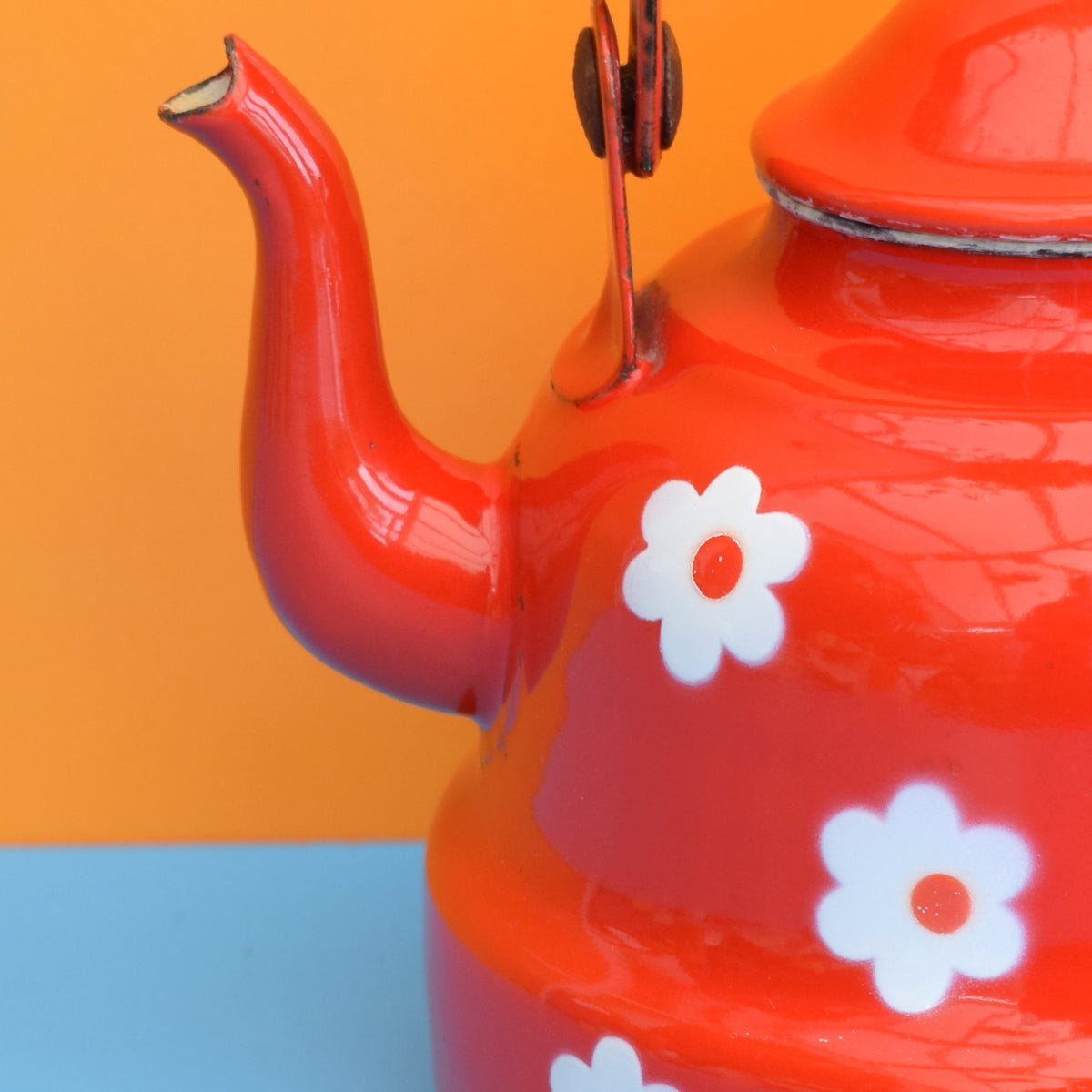 This vintage bright red enamel tea pot or kettle has a fab white flower power print all over