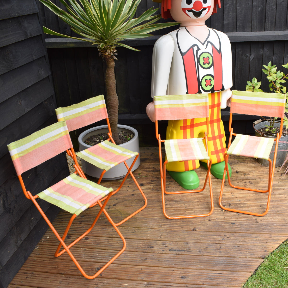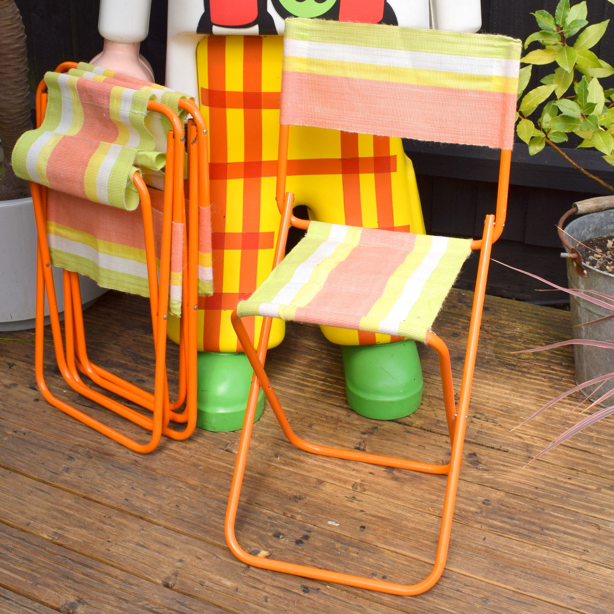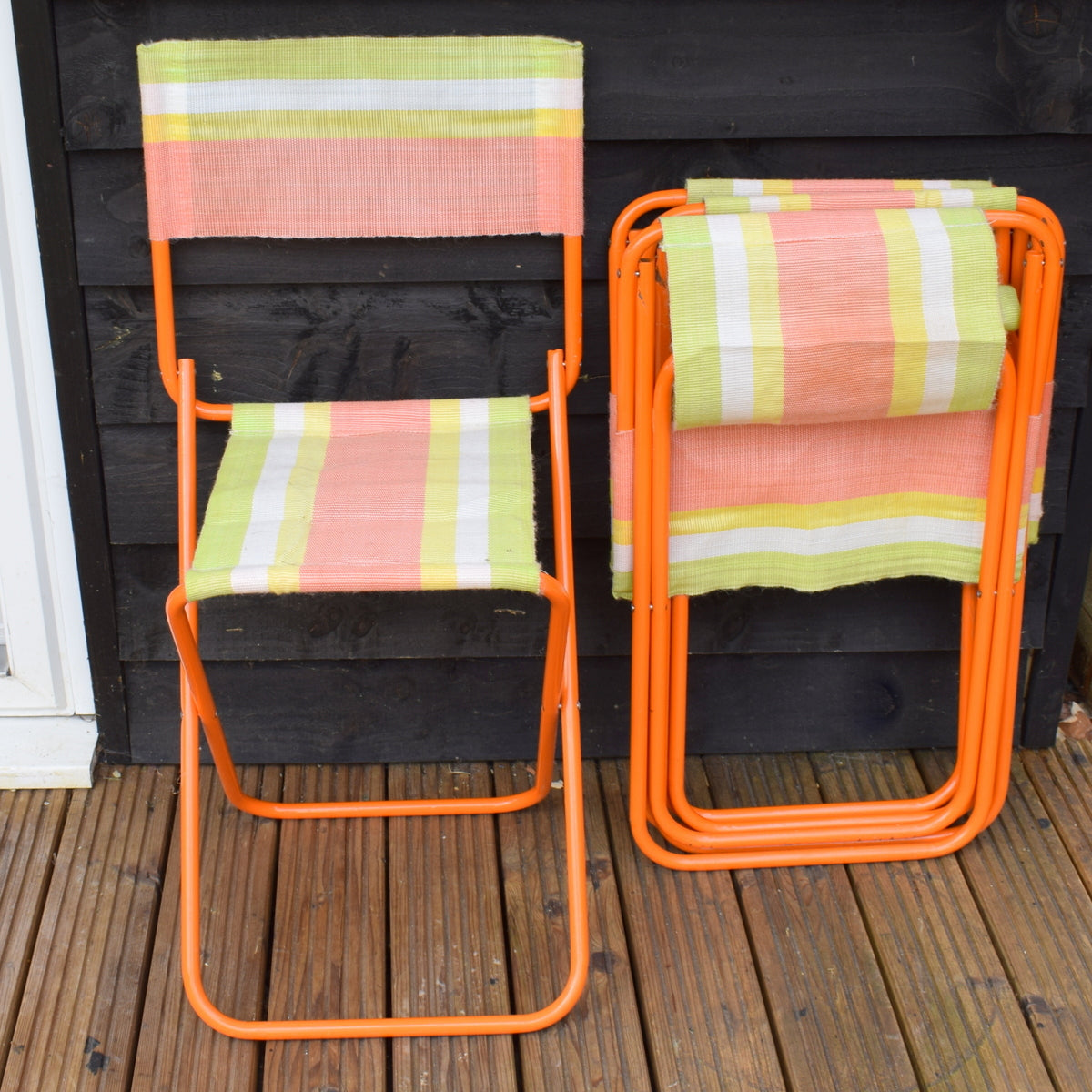 Vintage 1960s Striped Nylon Folding Chair Set - Orange & Green