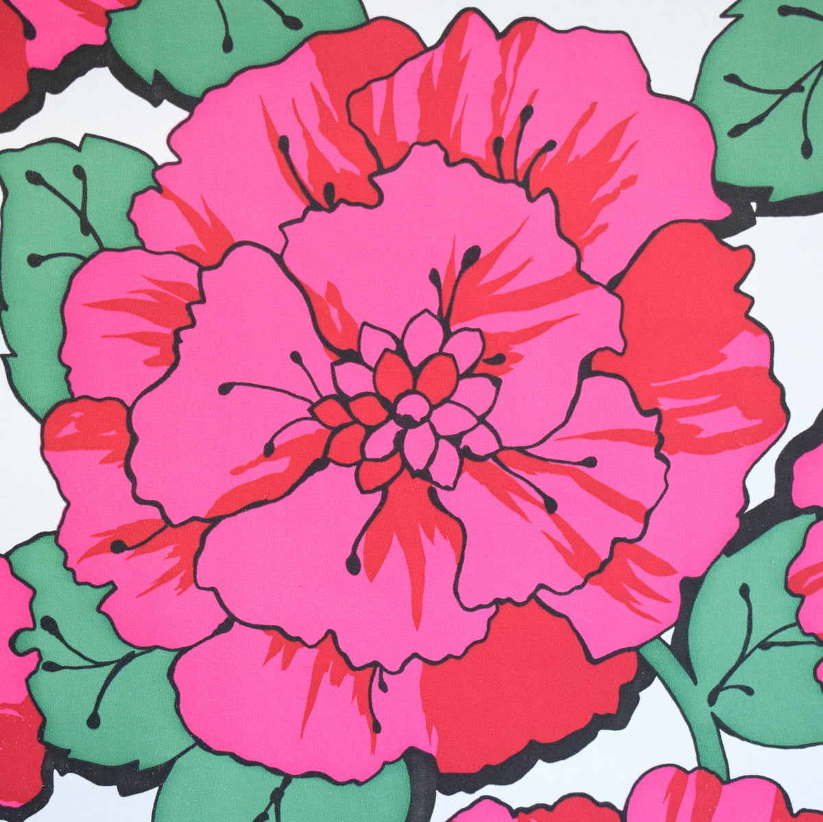 It has the most stunning huge pink flowers, on a white background with green and black details