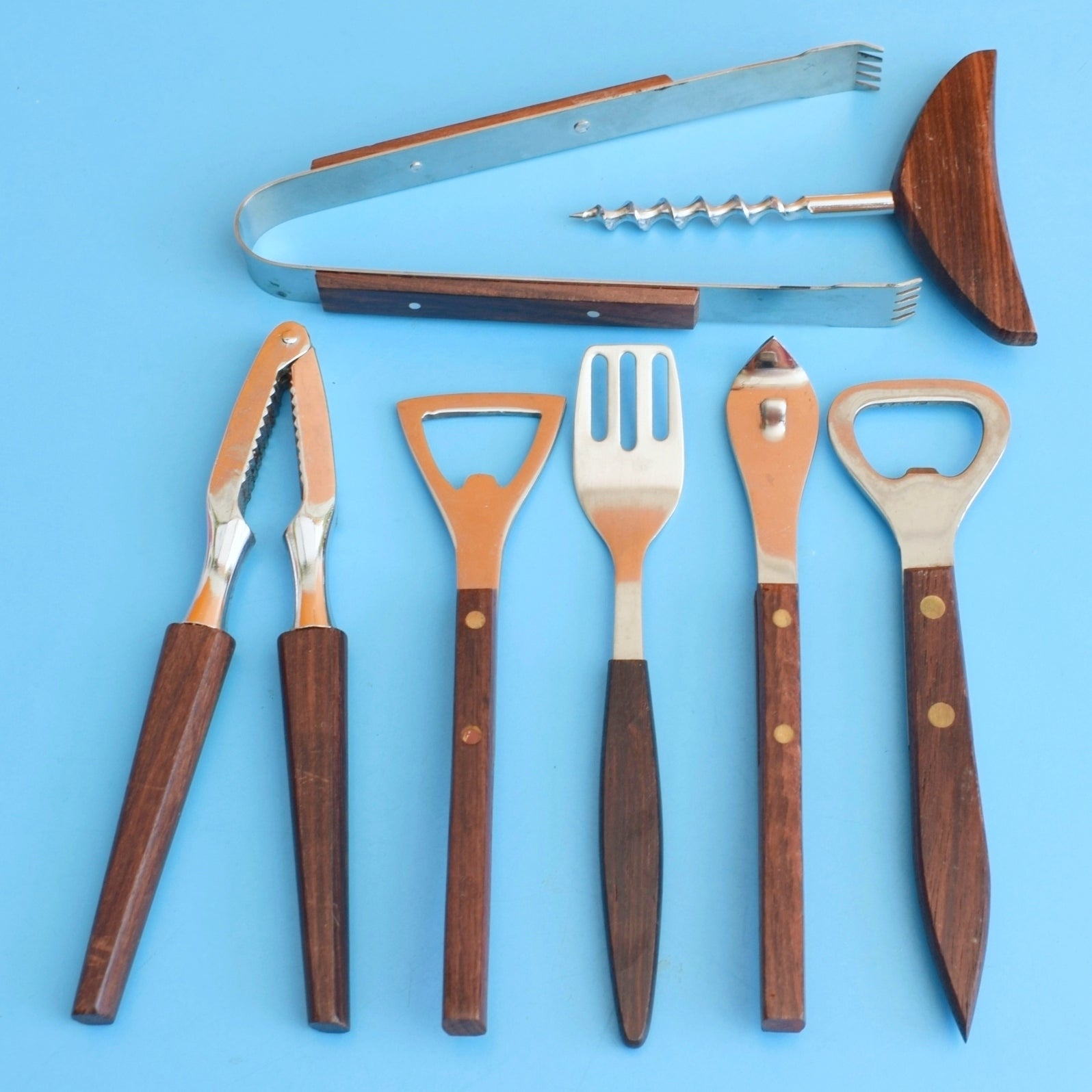 Authentic 1960s rosewood-handled bar serving pieces — perfect for cocktail lovers, collectors, and mid-century modern interiors seeking warm wood tones combined with polished stainless steel.
