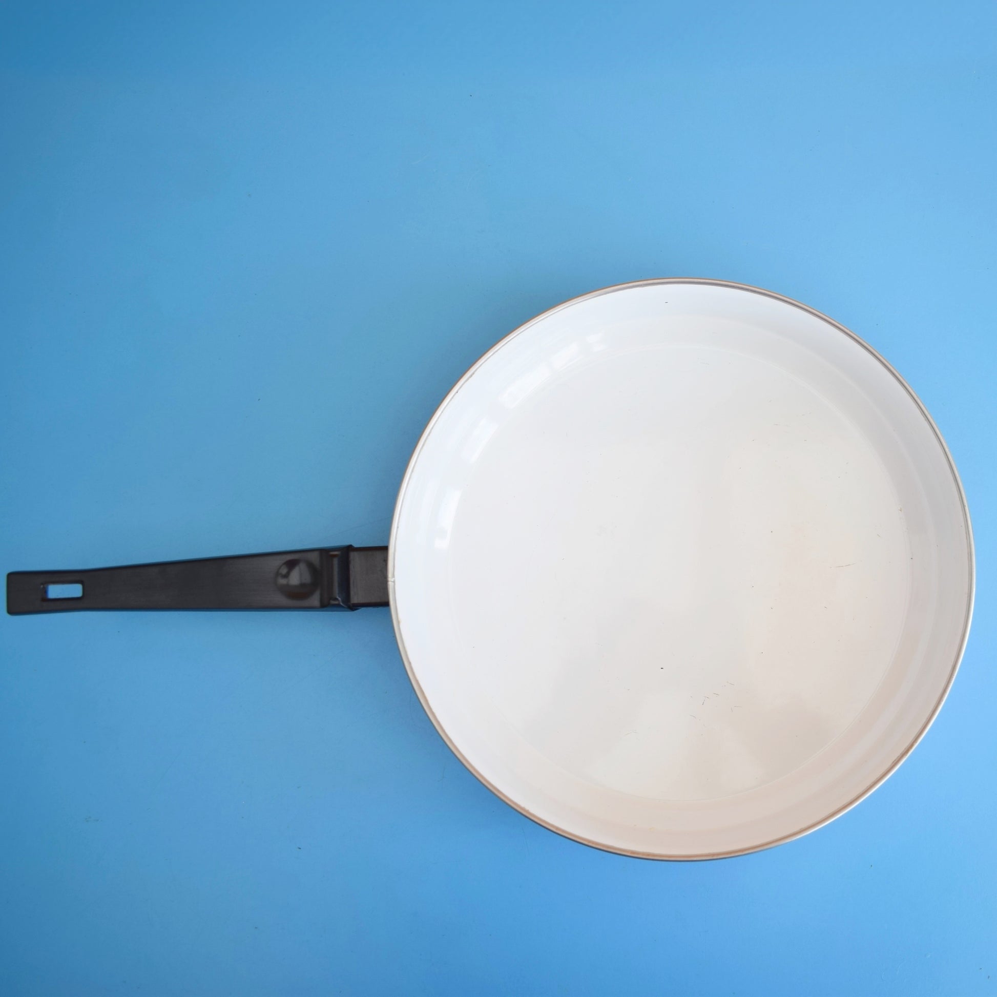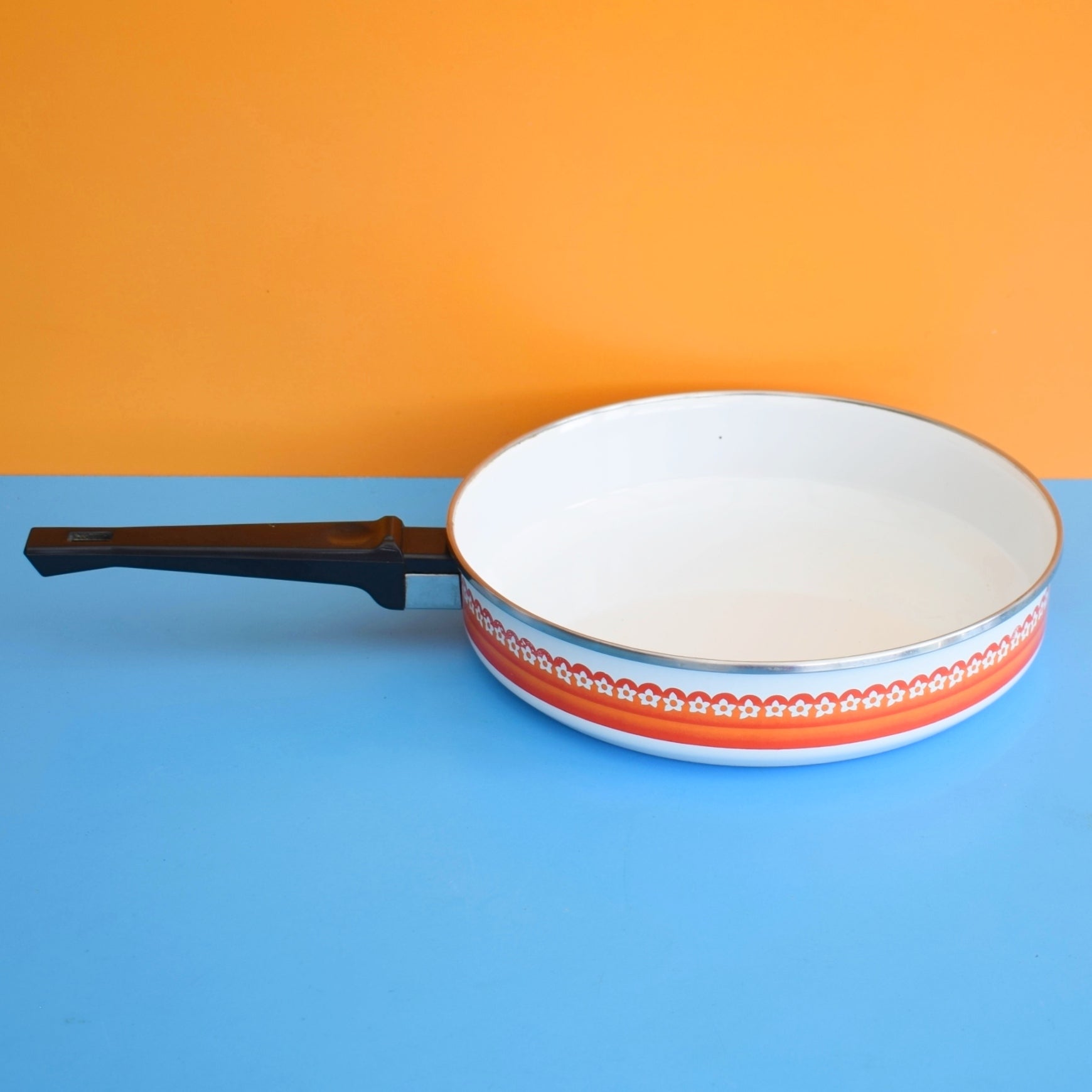 Turn back the clock with this vintage Taunton Vale enamel frying pan from the 1960s. With a bold orange and white floral motif, it brings mid‑century charm to cooking and display, whether you’re a collector or a retro kitchen enthusiast.