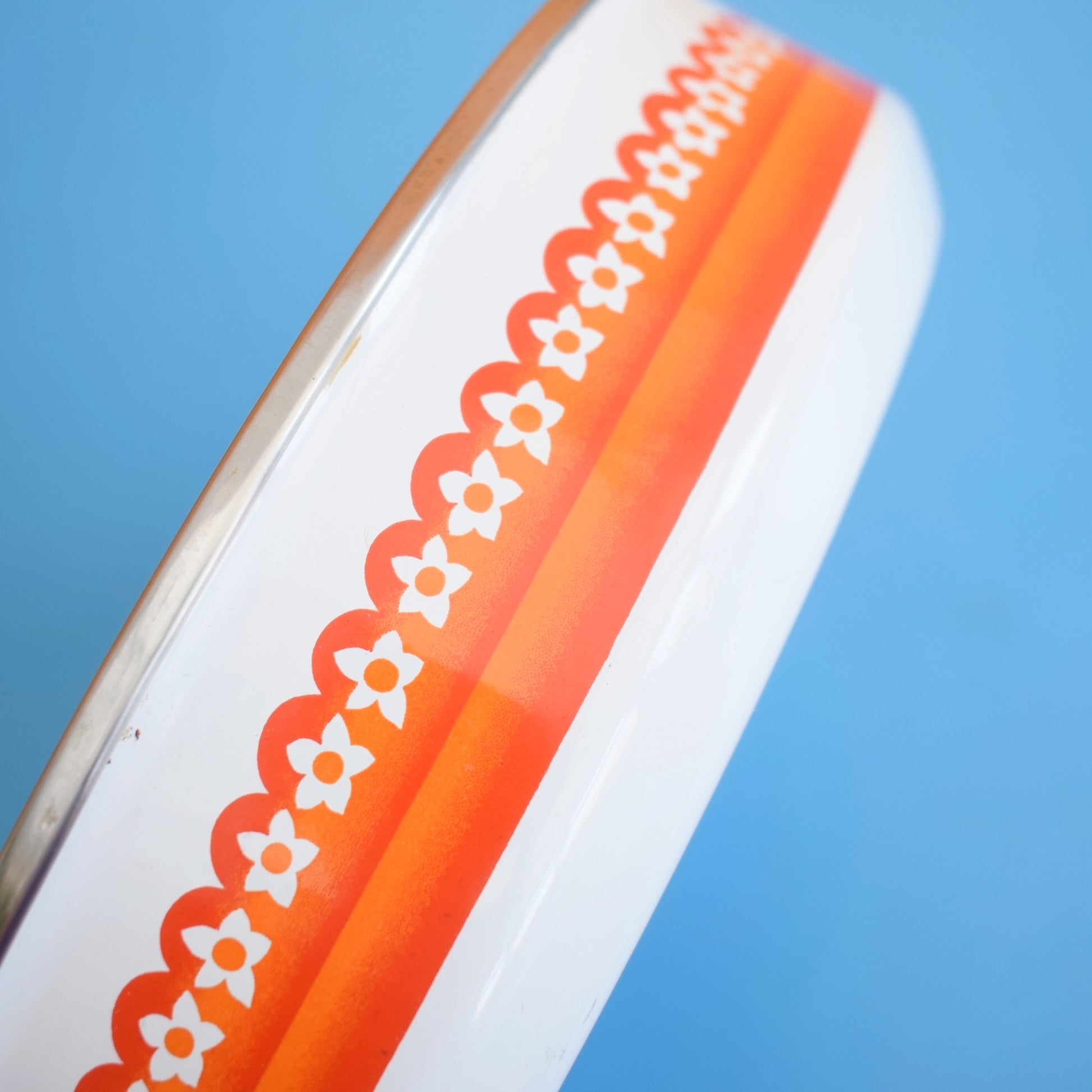 - Design Taunton Vale; enamel pan; bold orange and white flower motif; vintage 1960s kitchenware; no lid