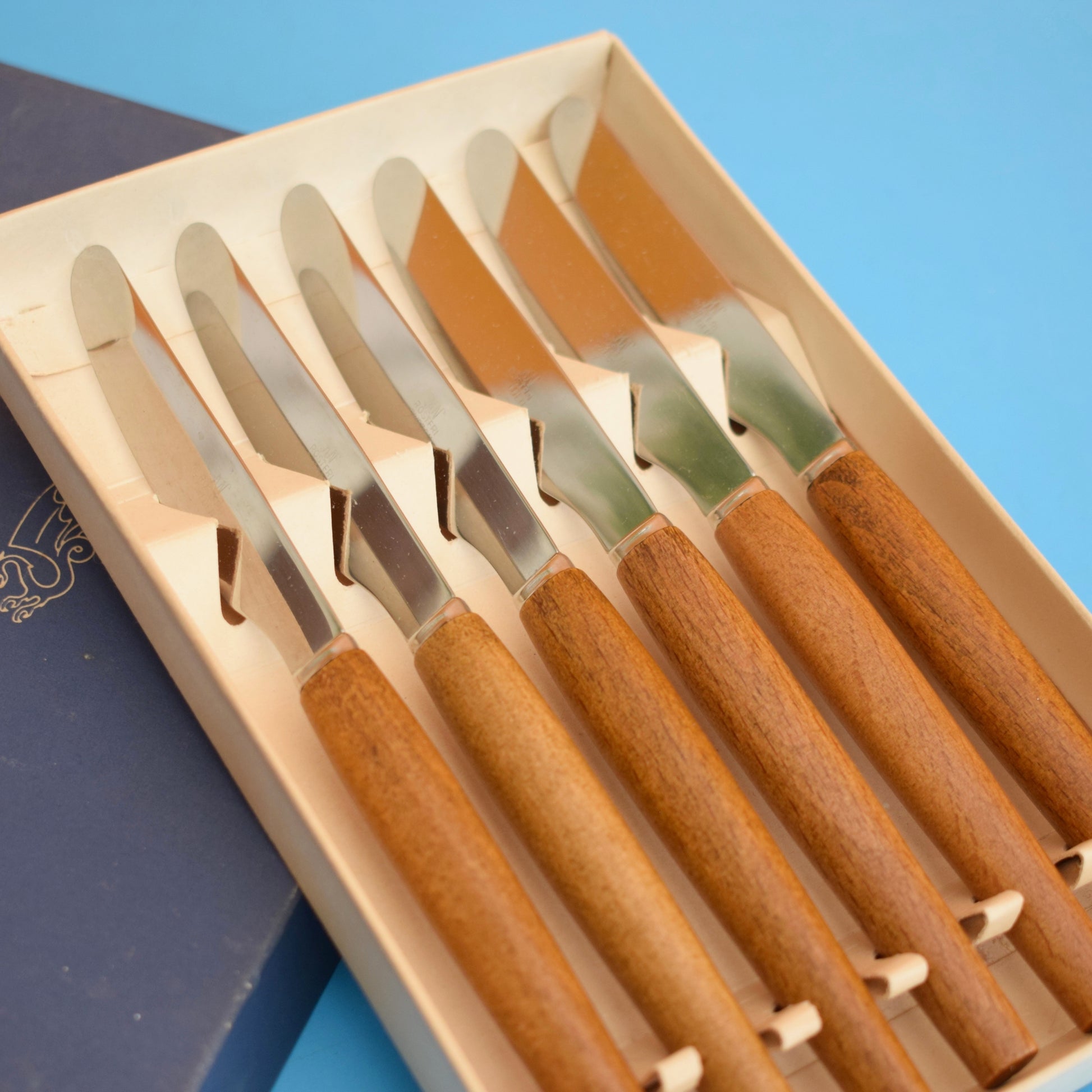Authentic Vintage 1960s teak and stainless steel tea/fruit knives by Karlsson & Nilsson of Sweden — timeless Scandinavian mid‑century cutlery for collectors and stylish table settings.