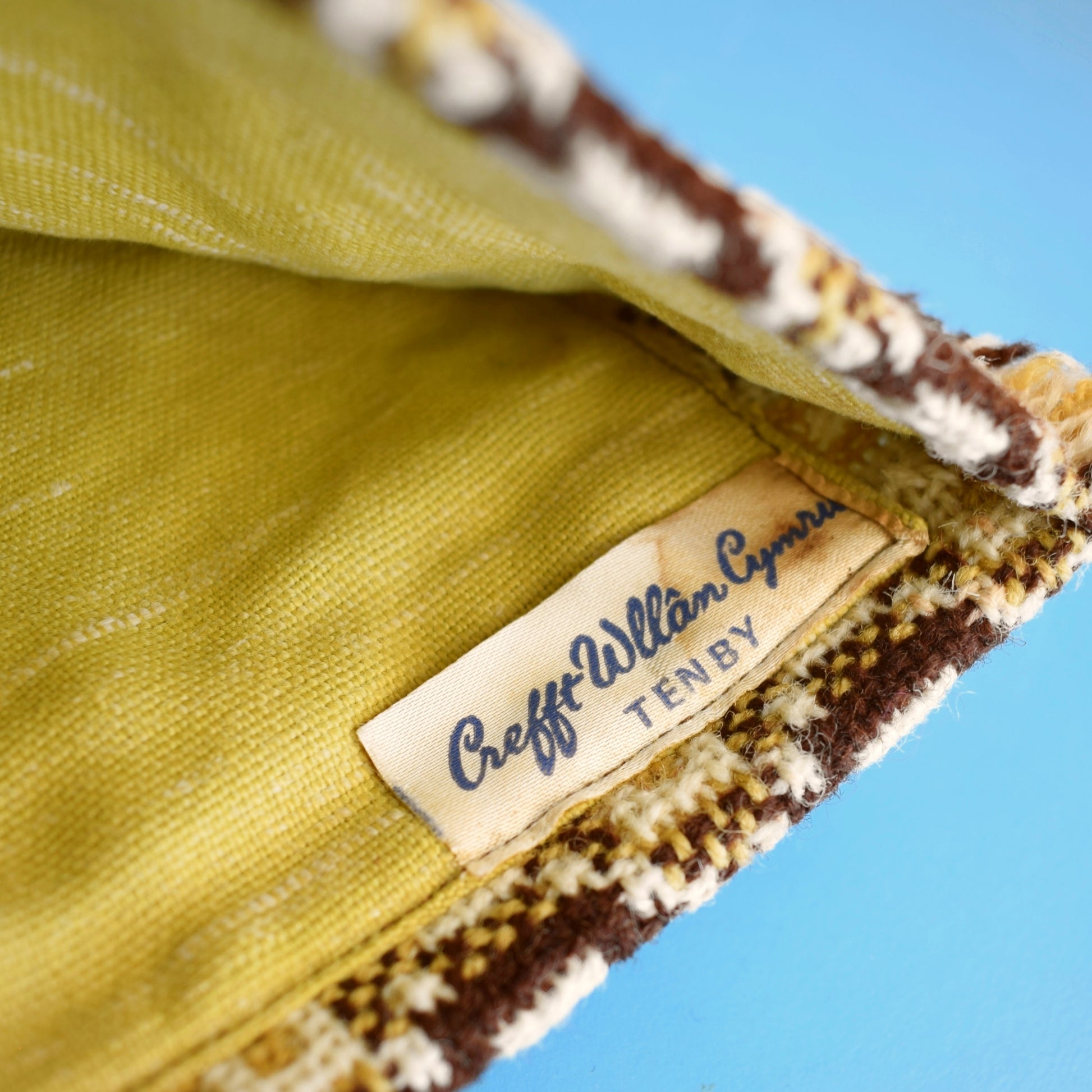 - Design Traditional Welsh tapestry style; original maker’s label inside; brown and cream colourway with olive-green lining