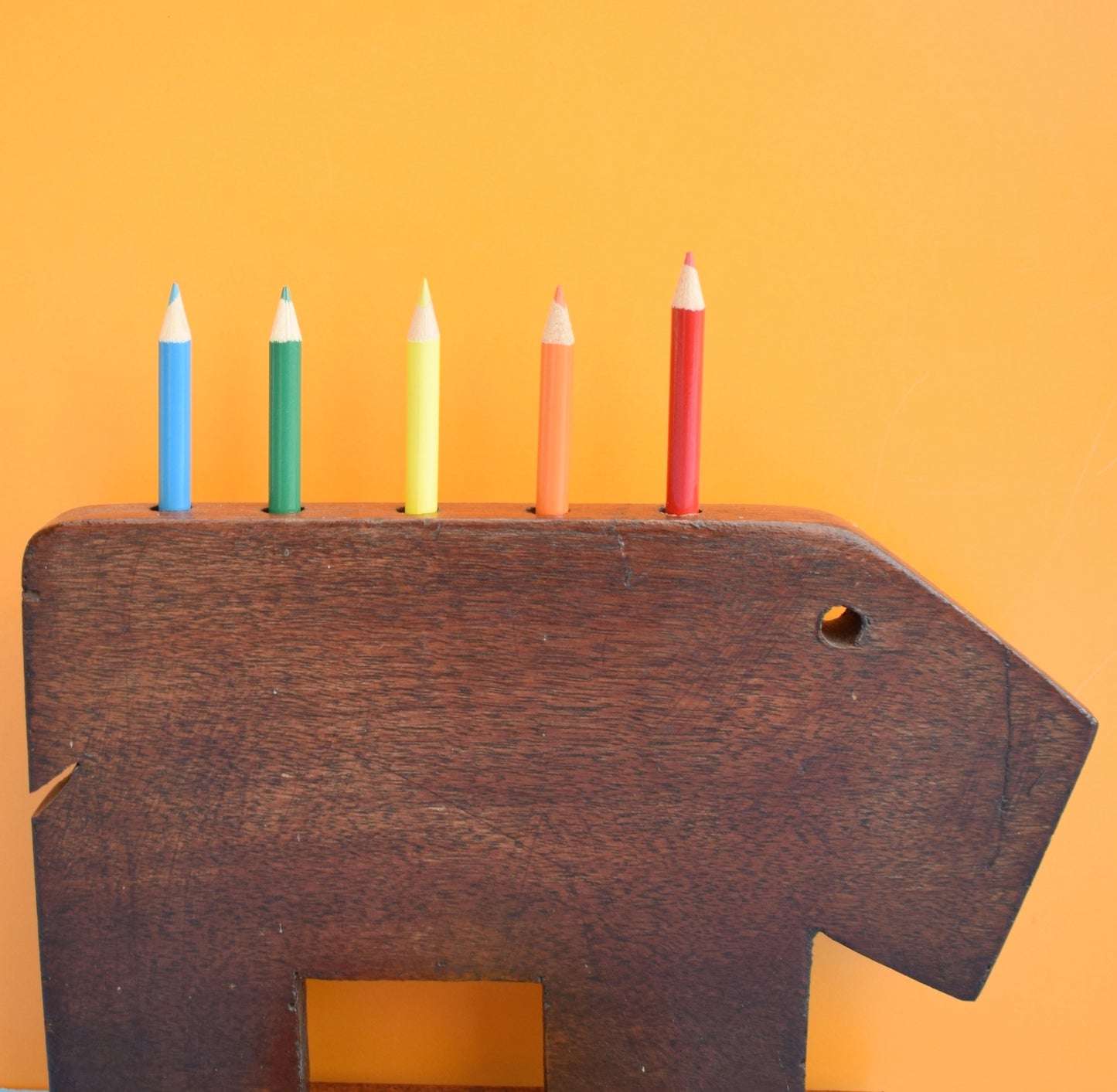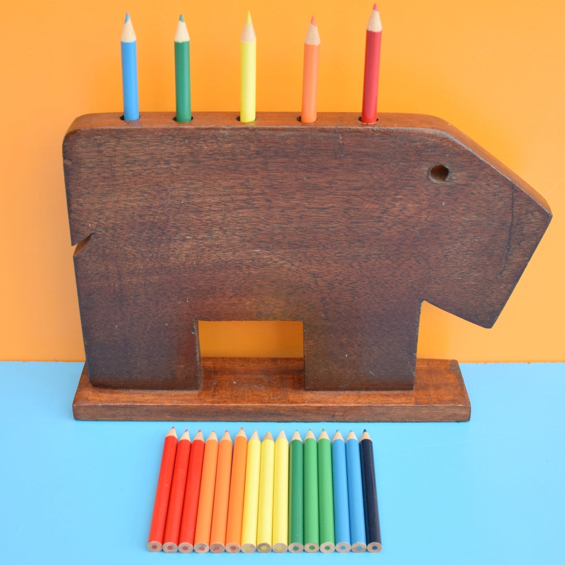Vintage 1970s Bear Pencil Holder & Rainbow Pencils