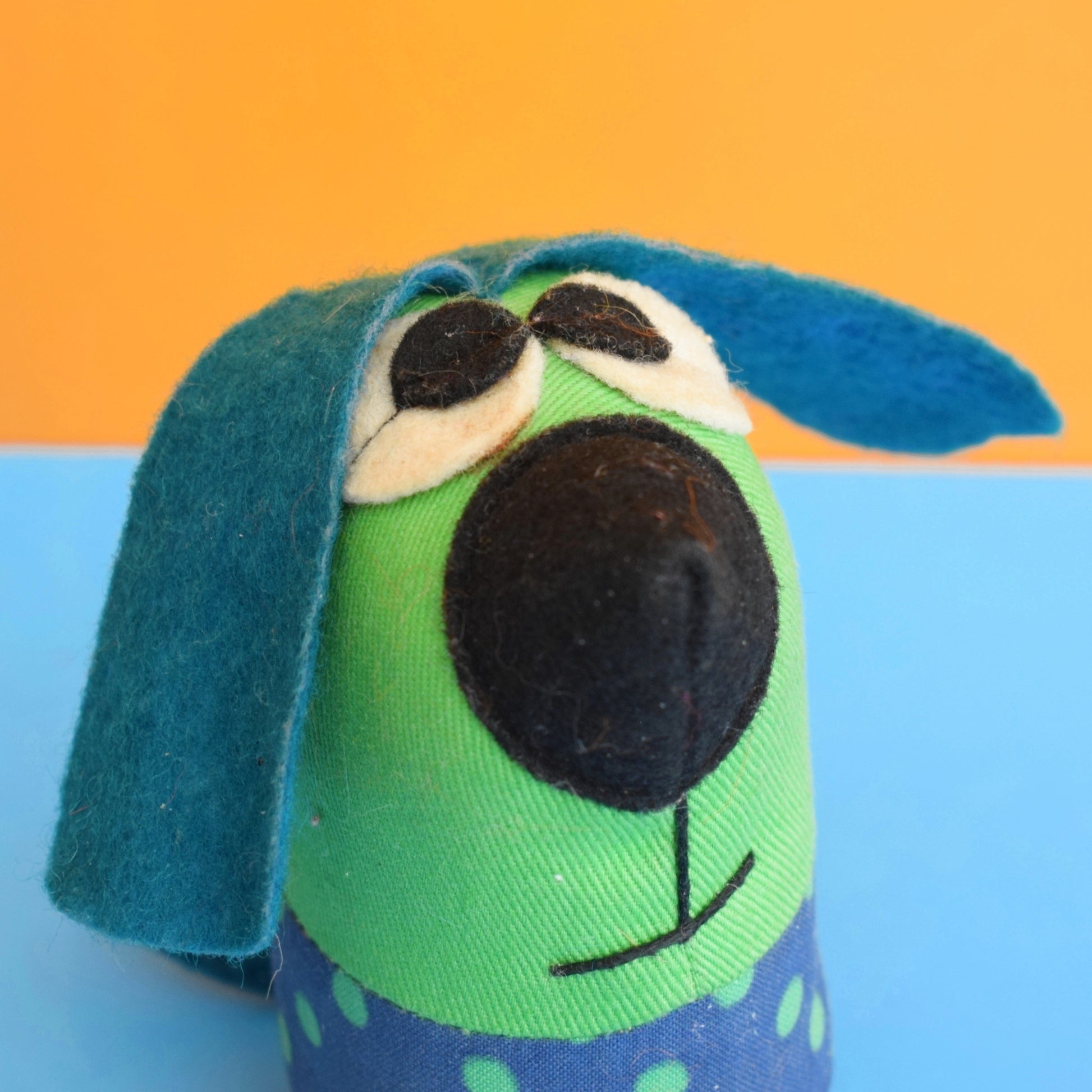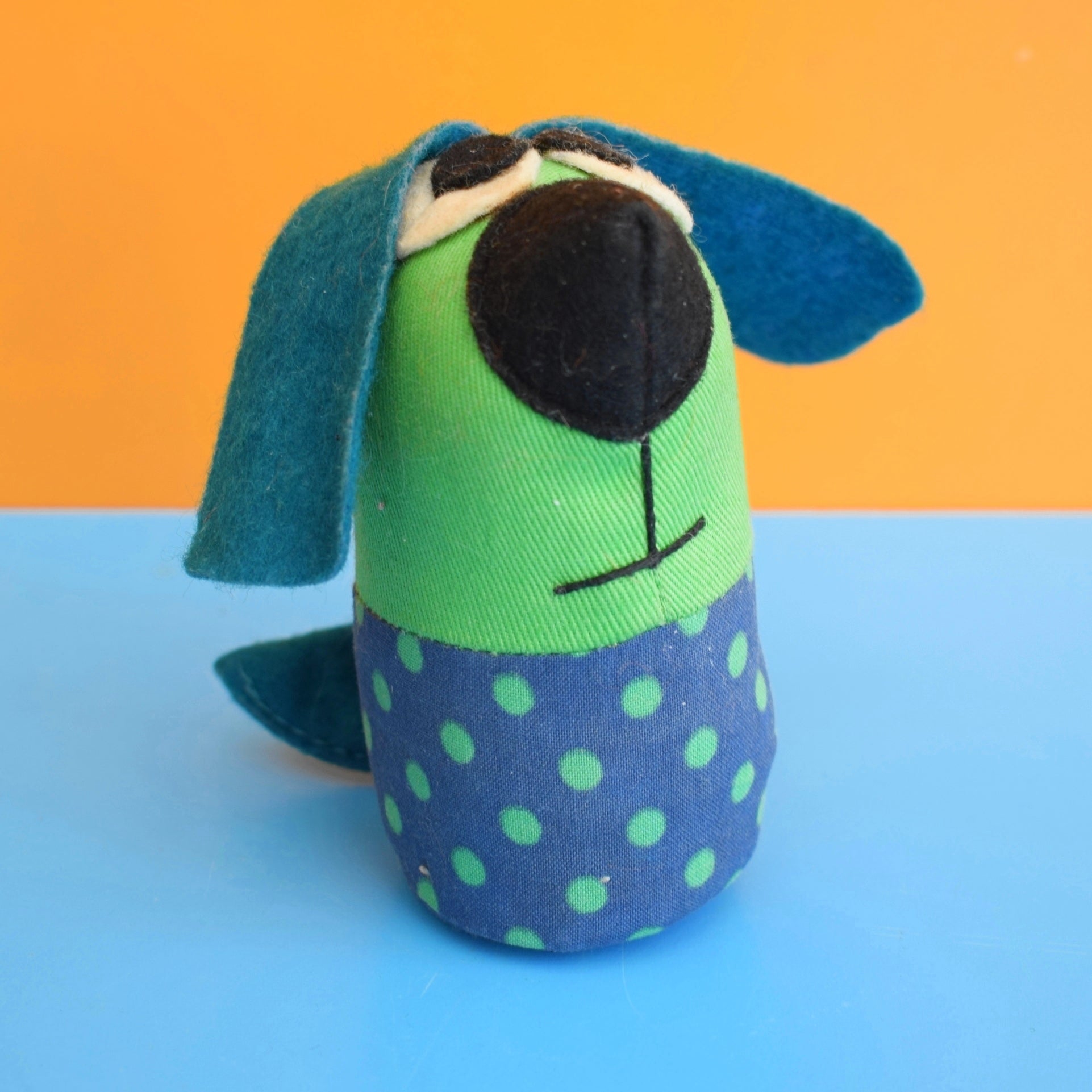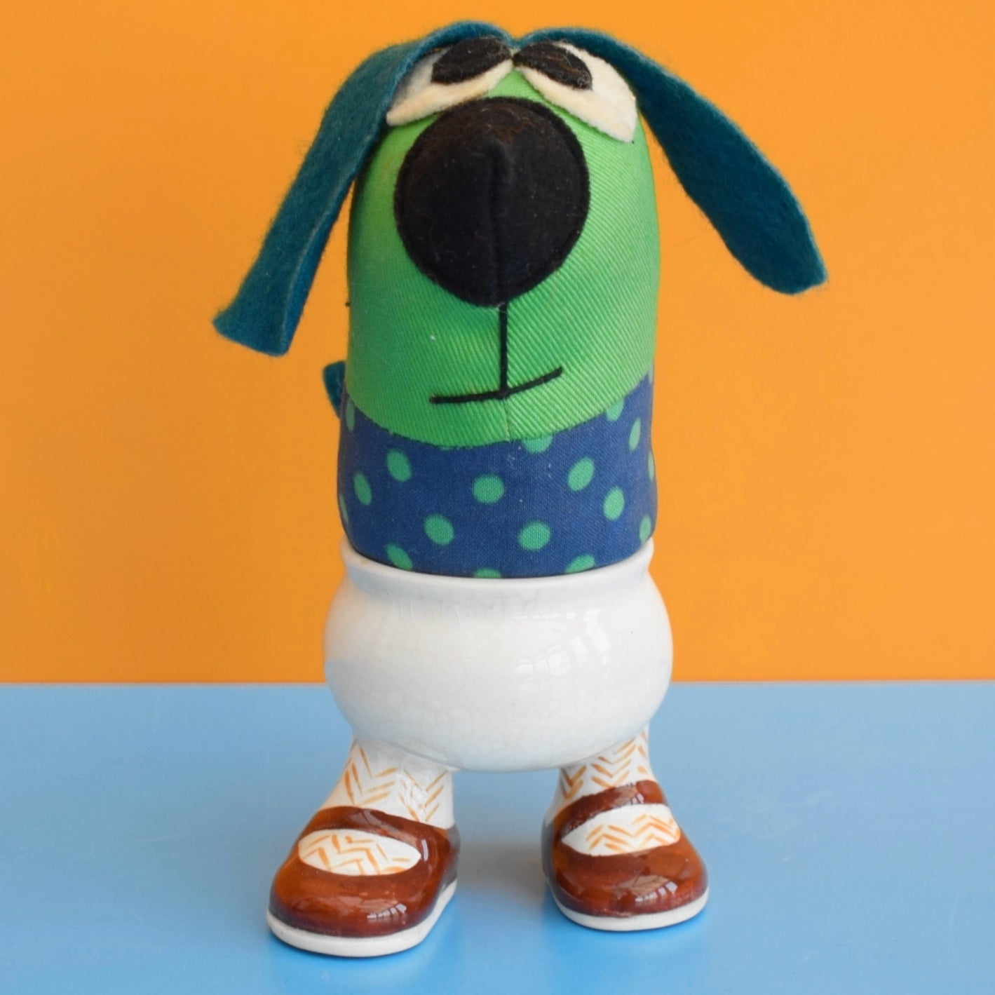 In the photos you’ll see a cute 1970s cotton and felt doggy figure positioned with the egg cup. The doggy figure is sold separately, but it demonstrates the kind of playful display possibilities this piece offers when paired with retro textiles and other mid-century finds.