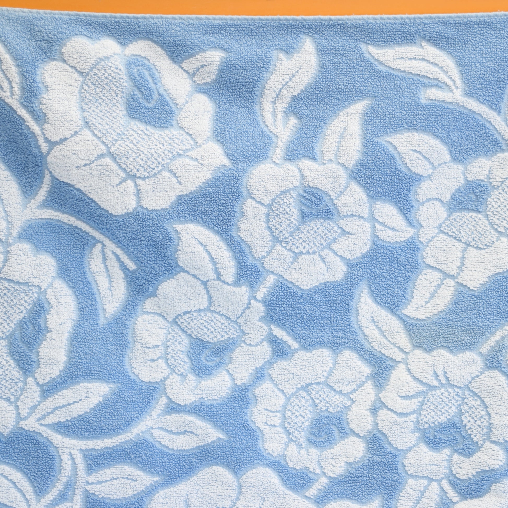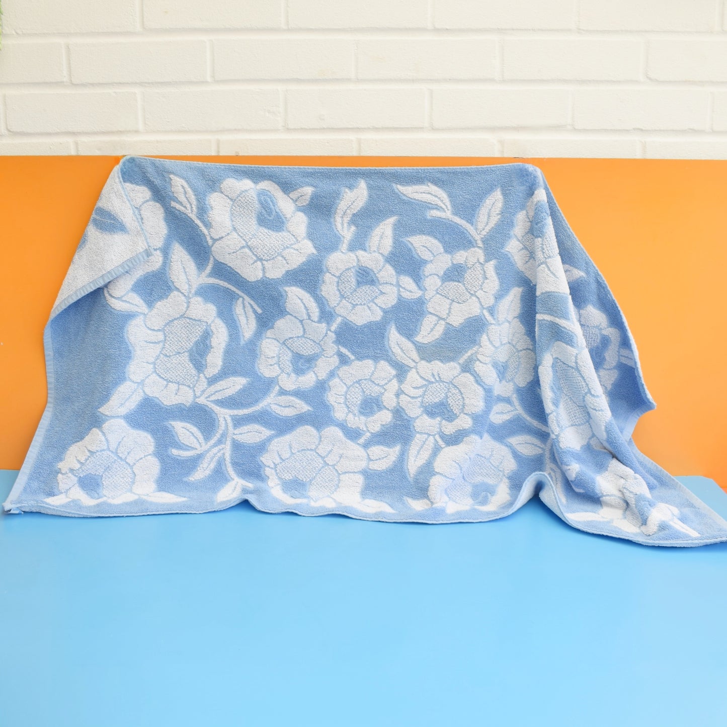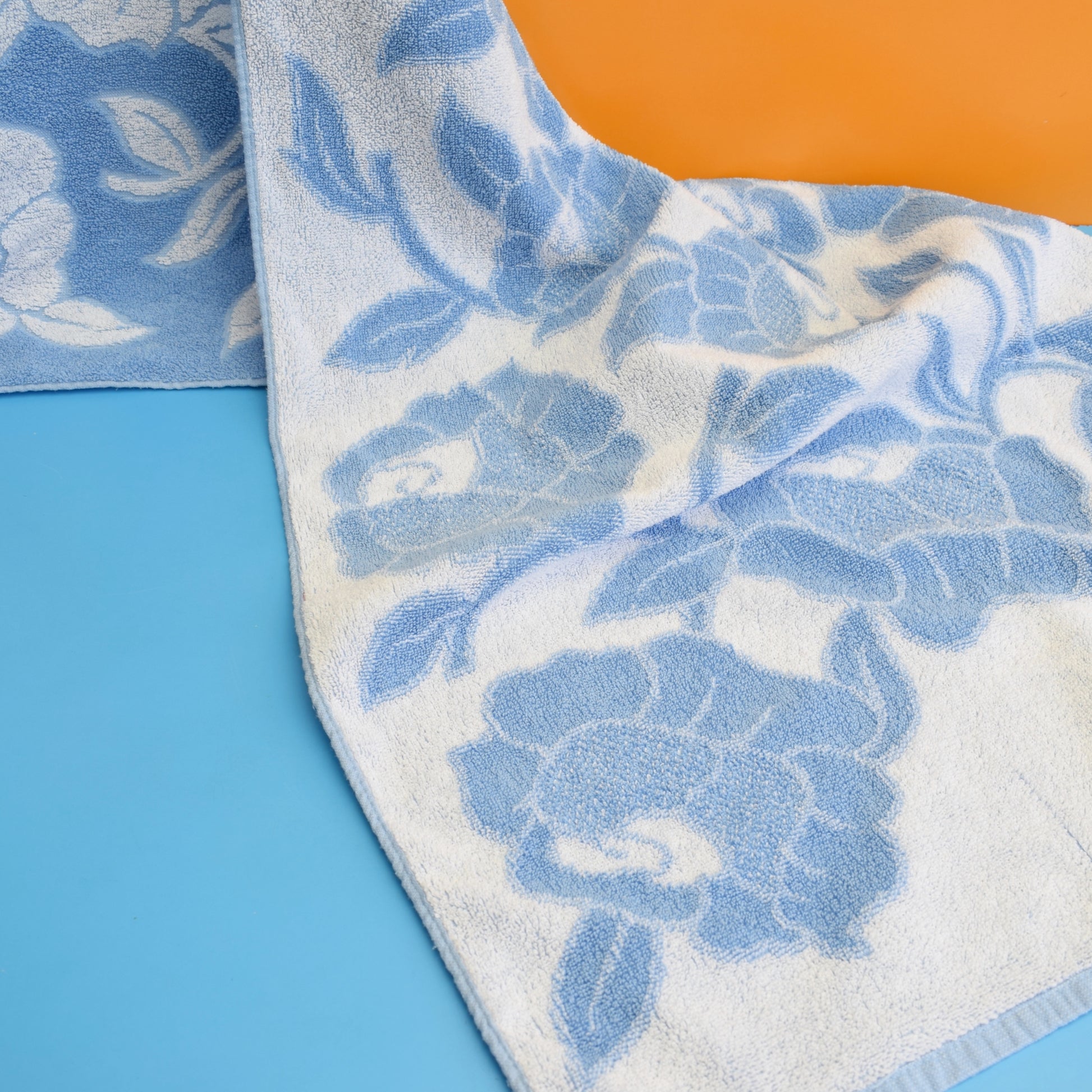 Vintage 1970s Cotton Bath Towel -Blue & White Floral