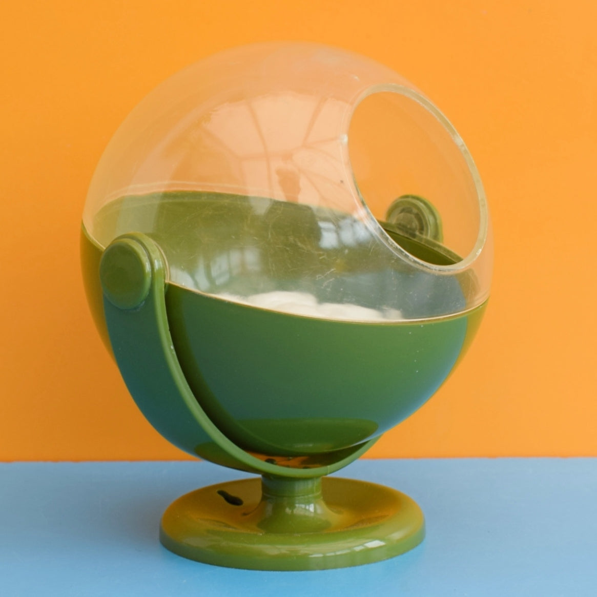 Avocado green plastic, globe shaped, the clear half having a circular hole to get your hand in.