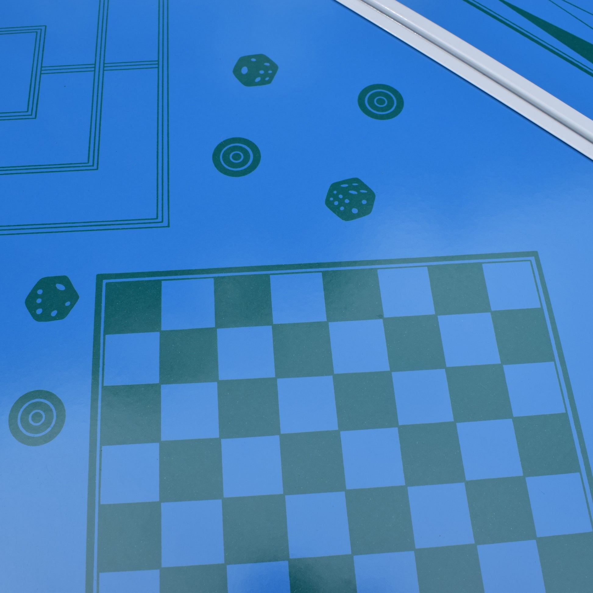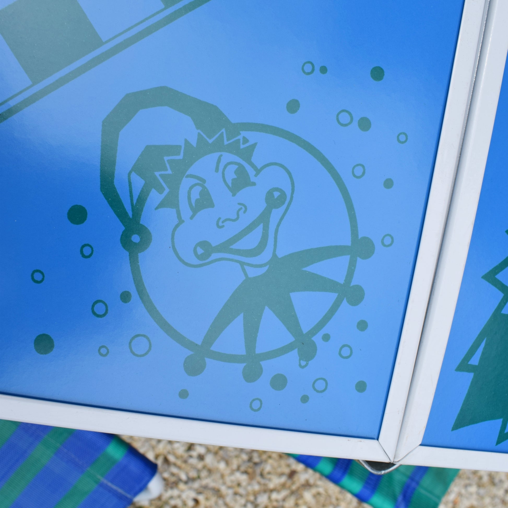 Amazing blue and green design on the top of the table, with built in games boards. Of course, this could just be used as a picnic table, but with an added bonus! The matching stools are blue and green striped