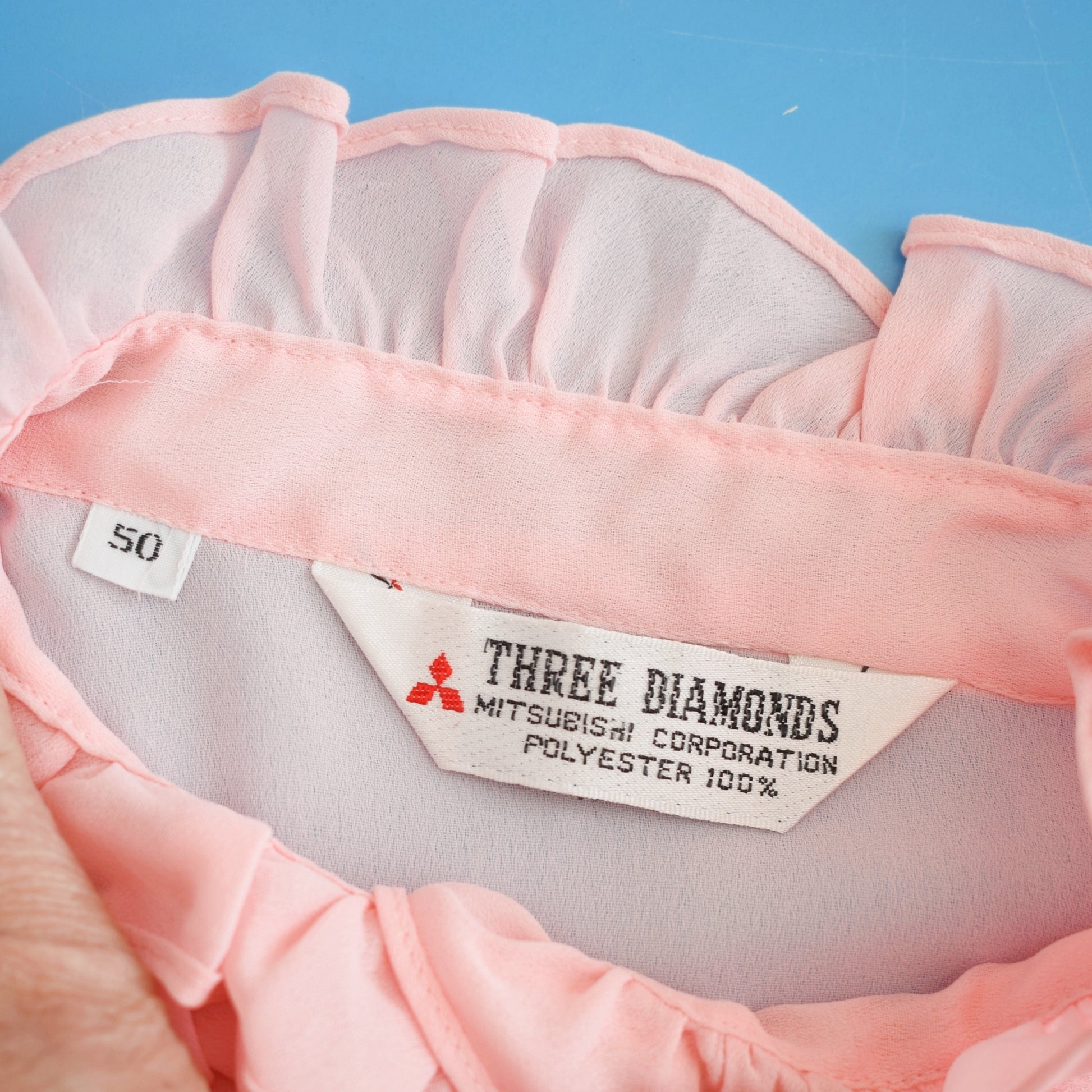 - Design Three Diamonds by Mitsubishi Corporation (labels on 2 pieces); 1970s frilled collar, button-front styling, pastel colour palette, lightweight drape