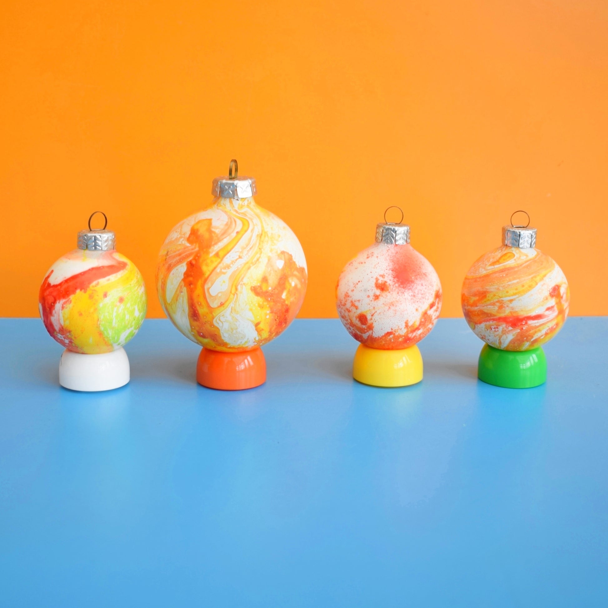 These authentic 1970s glass baubles were carefully cleaned, primed and individually hydro-dipped using acrylic paints to create vibrant, slightly textured finishes that resemble tiny planets. Original metal fittings were reattached and a clear protective coat added to help preserve the finish — though they remain delicate glass items and should be handled with care.